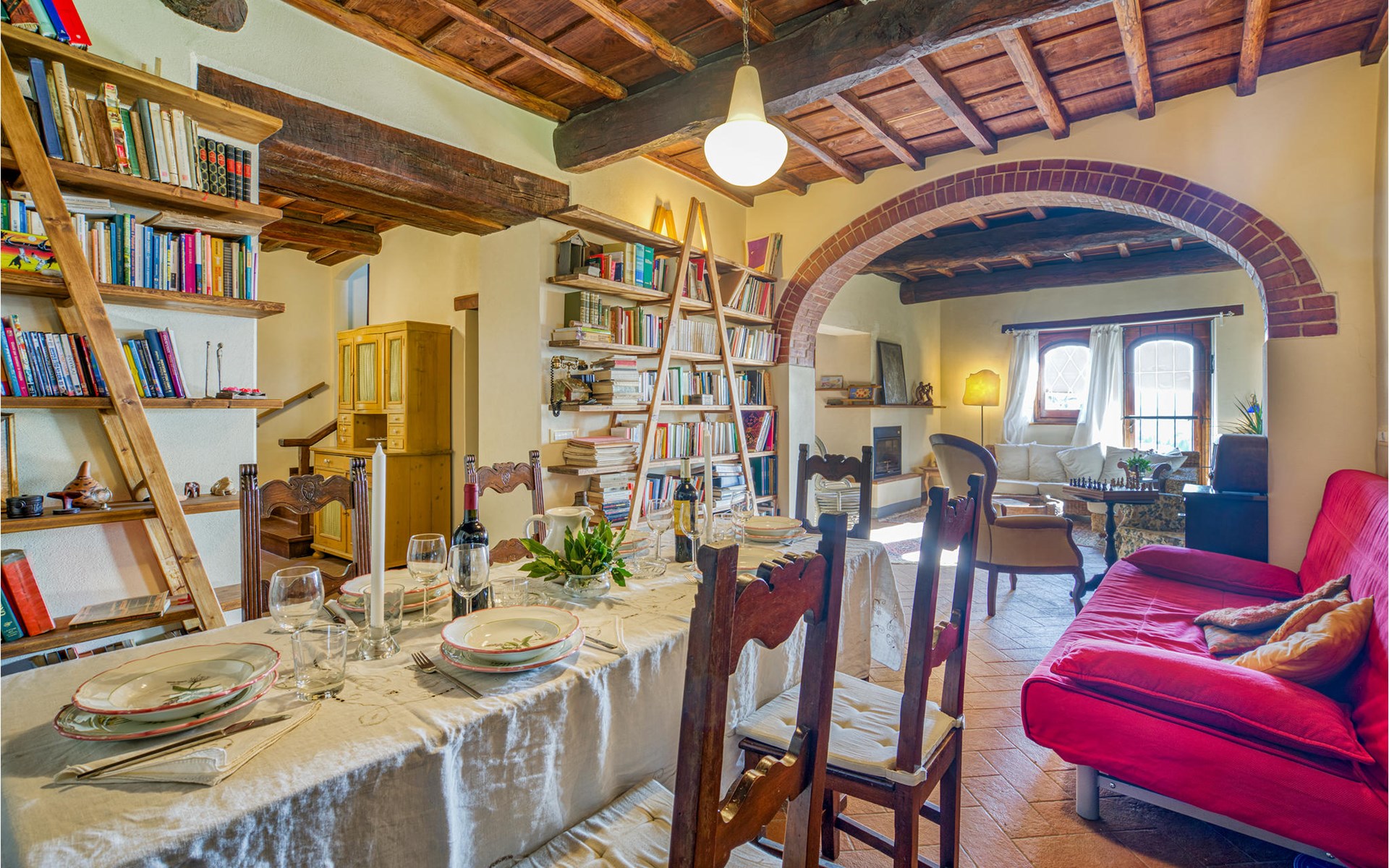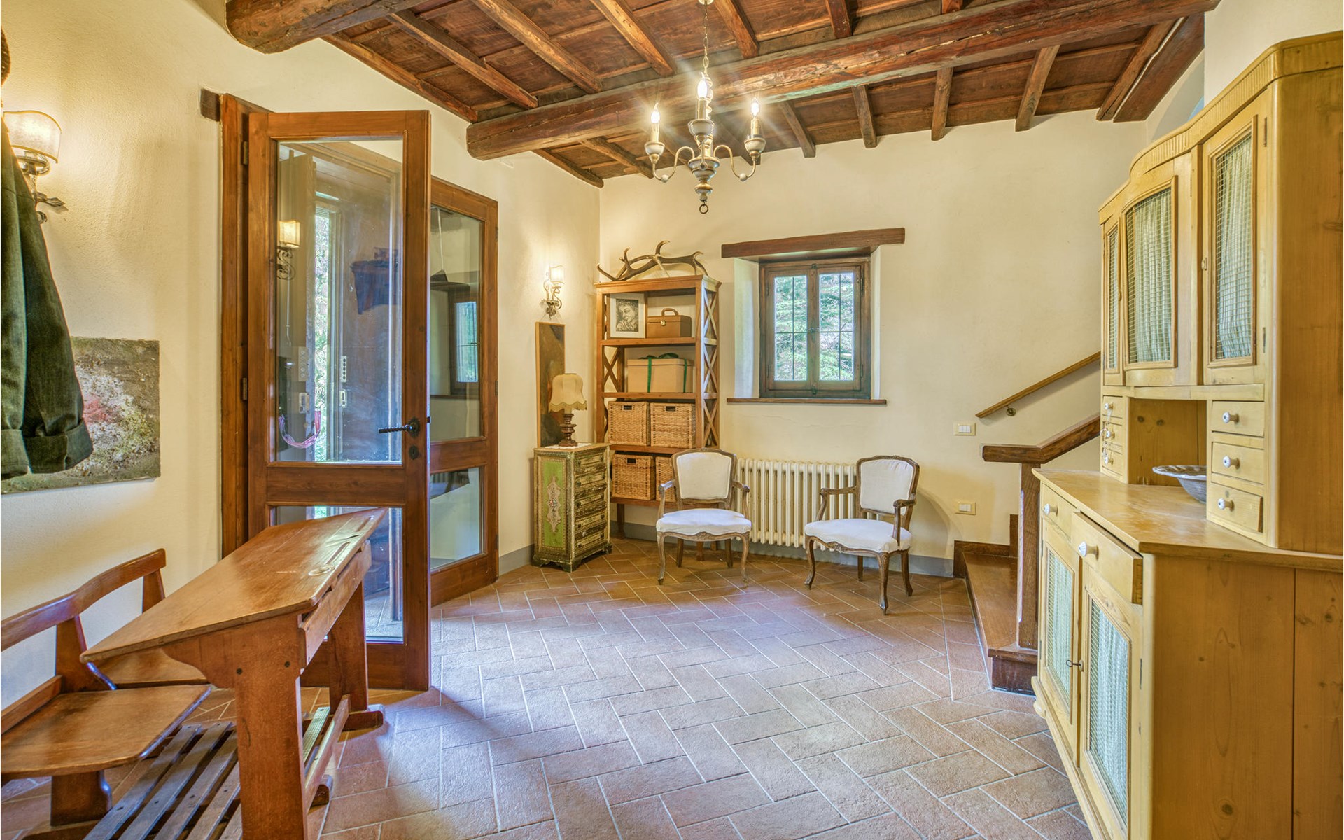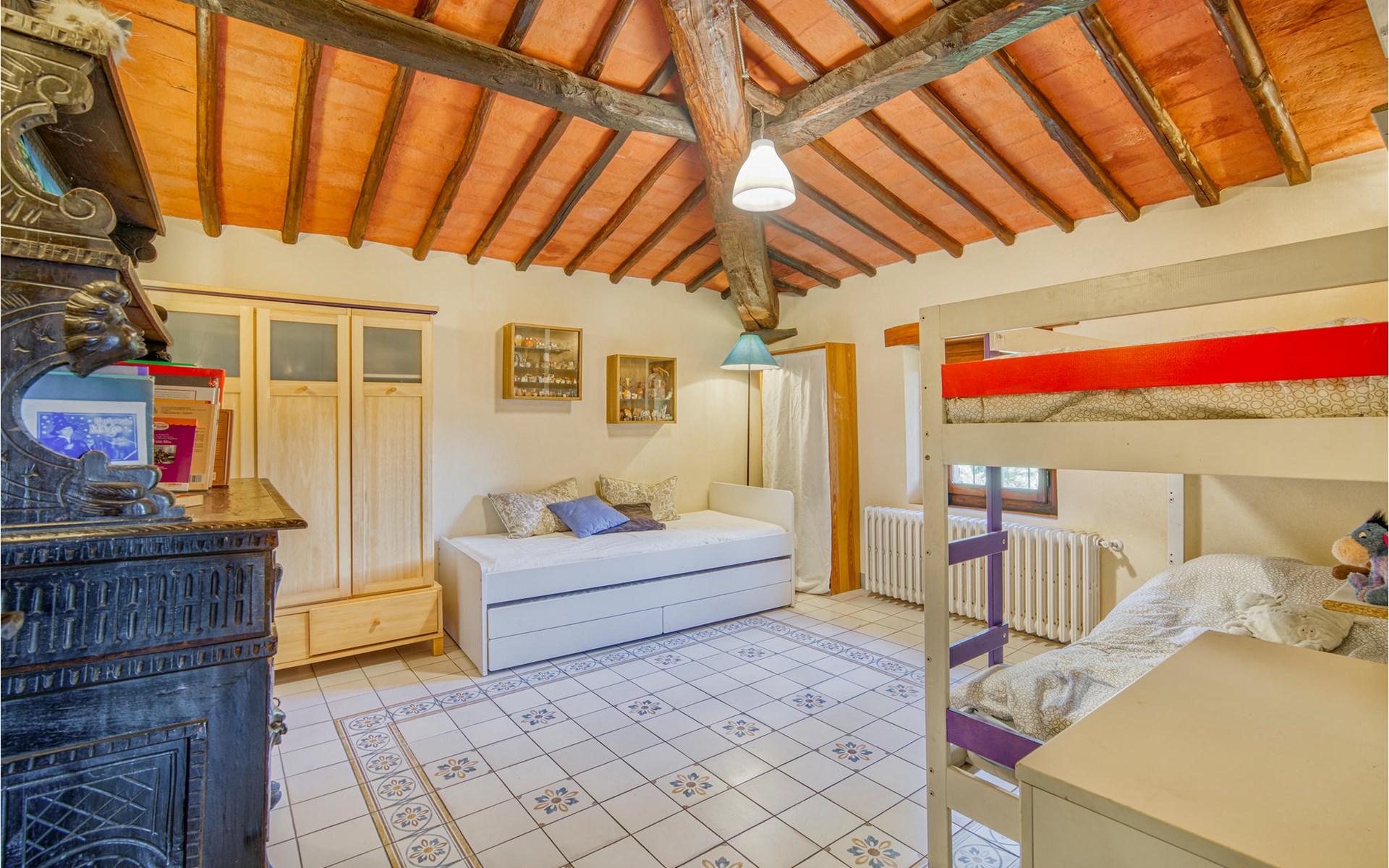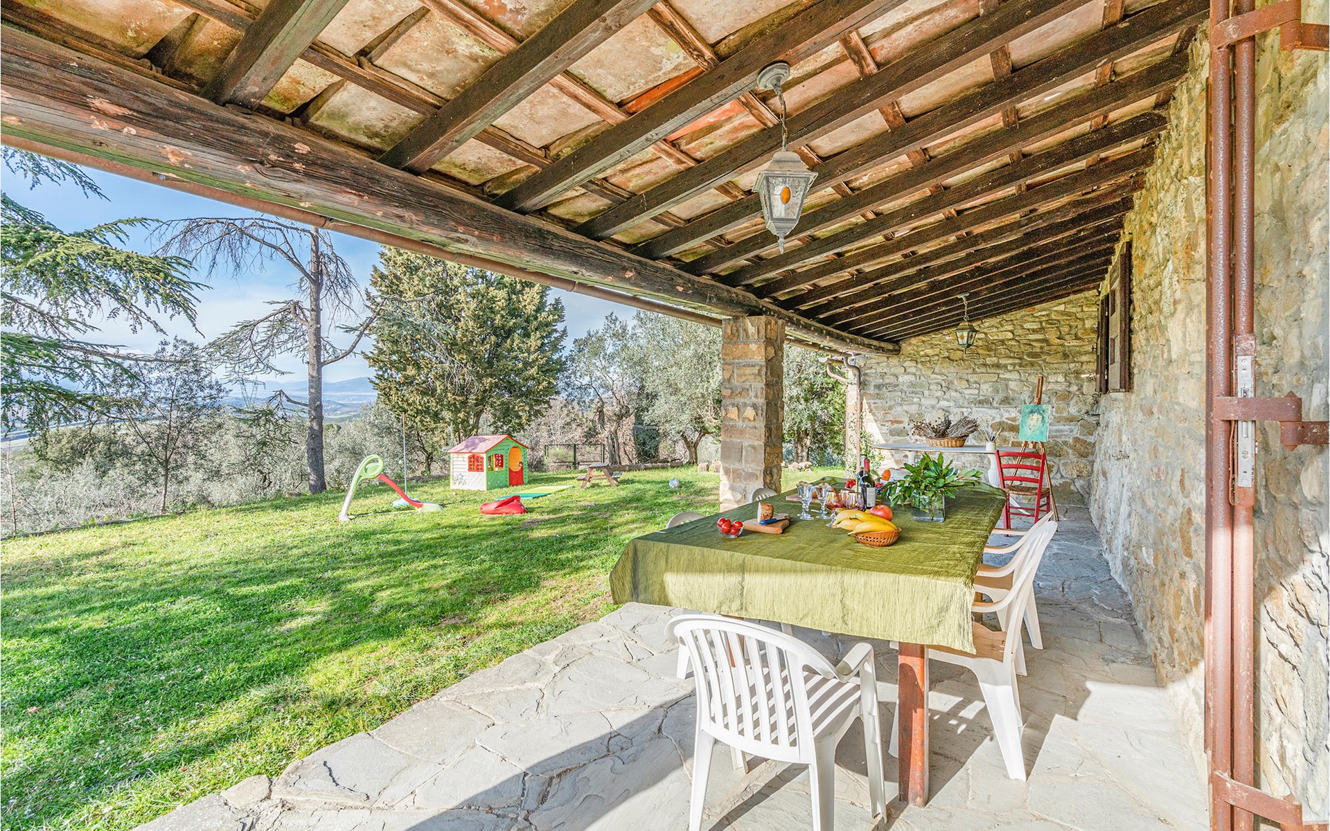 Dieses geräumige und extra kinderfreundliche Ferienhaus bietet ideale Bedingungen für einen wunderschönen Familienurlaub in der Toskana. Das Haus erstreckt sich über zwei Etagen, bietet Platz in 3 Schlafzimmern, 1 Badezimmer, 2 Wohnräumen und einem separaten WC. Im schönen Wohnbereich mit hölzernen Decken können Sie vor dem Kamin entspannen und den Tag mit einem Glas Wein ausklingen lassen. Der Kamin ist von zwei Seiten einsehbar und daher auch vom Essplatz sichtbar. Für Unterhaltung ist mit Fitnessgeräten, TV und WLAN gesorgt.