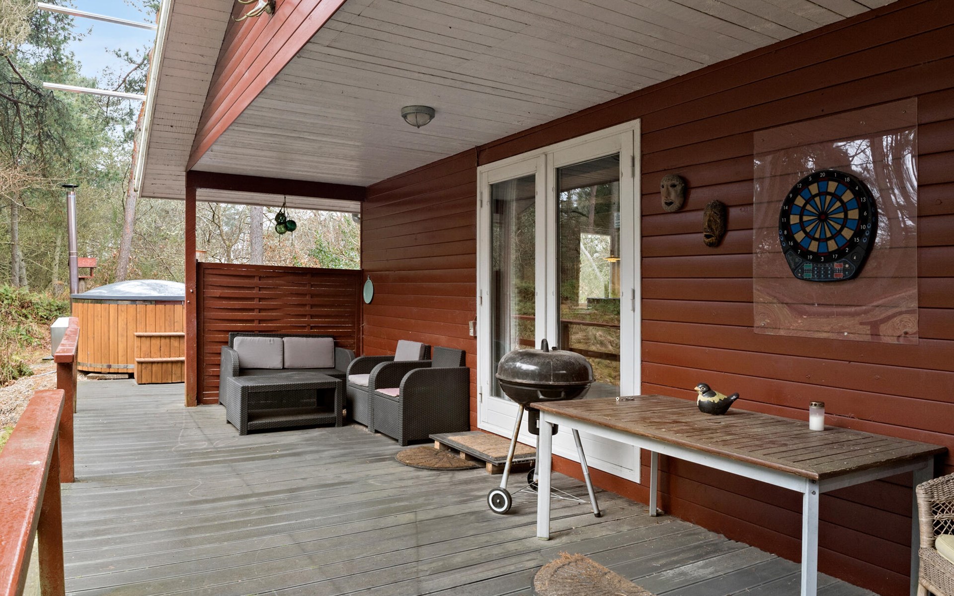 Gehen Sie nach draußen und erleben Sie die pure Natur. Das große Grundstück bietet Ihnen absolute Privatsphäre und viel Platz zum Verweilen. Entspannen Sie auf der Terrasse, während Sie den Blick über die bewaldete Landschaft schweifen lassen. Das Finnische Holzbad im Freien sorgt für pure Erholung, während die gemütliche Grillecke gute Bedingungen für gesellige Abende bietet.
