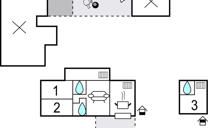 Das Grundstück umfasst zudem einen Kinderspielplatz und eine Kegelbahn. Eine zweite, schattige Terrasse hat einen schönen Blick auf den überdachten Sommergarten mit Tischtennis und Darts. Es gibt auch Badmintonschläger, Poolspiele, Brettspiele, Bücher, Fahrräder und alle Geräte für Kinder und Babys. Der diskrete Besitzer wohnt einige Wochen im Jahr in einem anderen Haus auf dem Gelände. Vom Parkplatz aus erreichen Sie das Haus über 7 Stufen. Zugang zur Südterrasse über 4 Stufen.