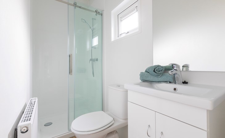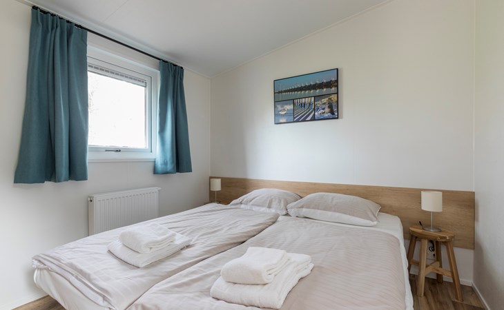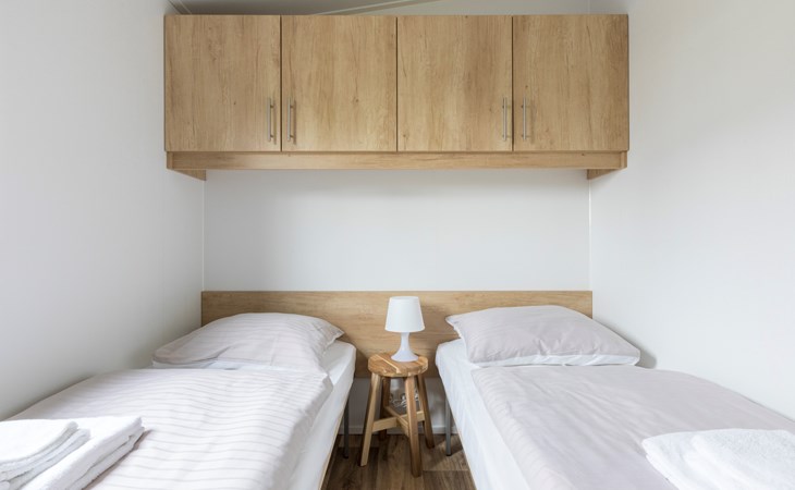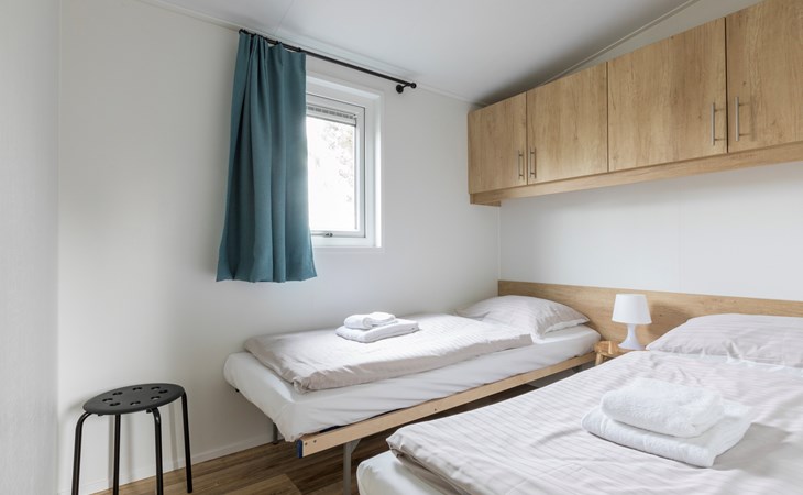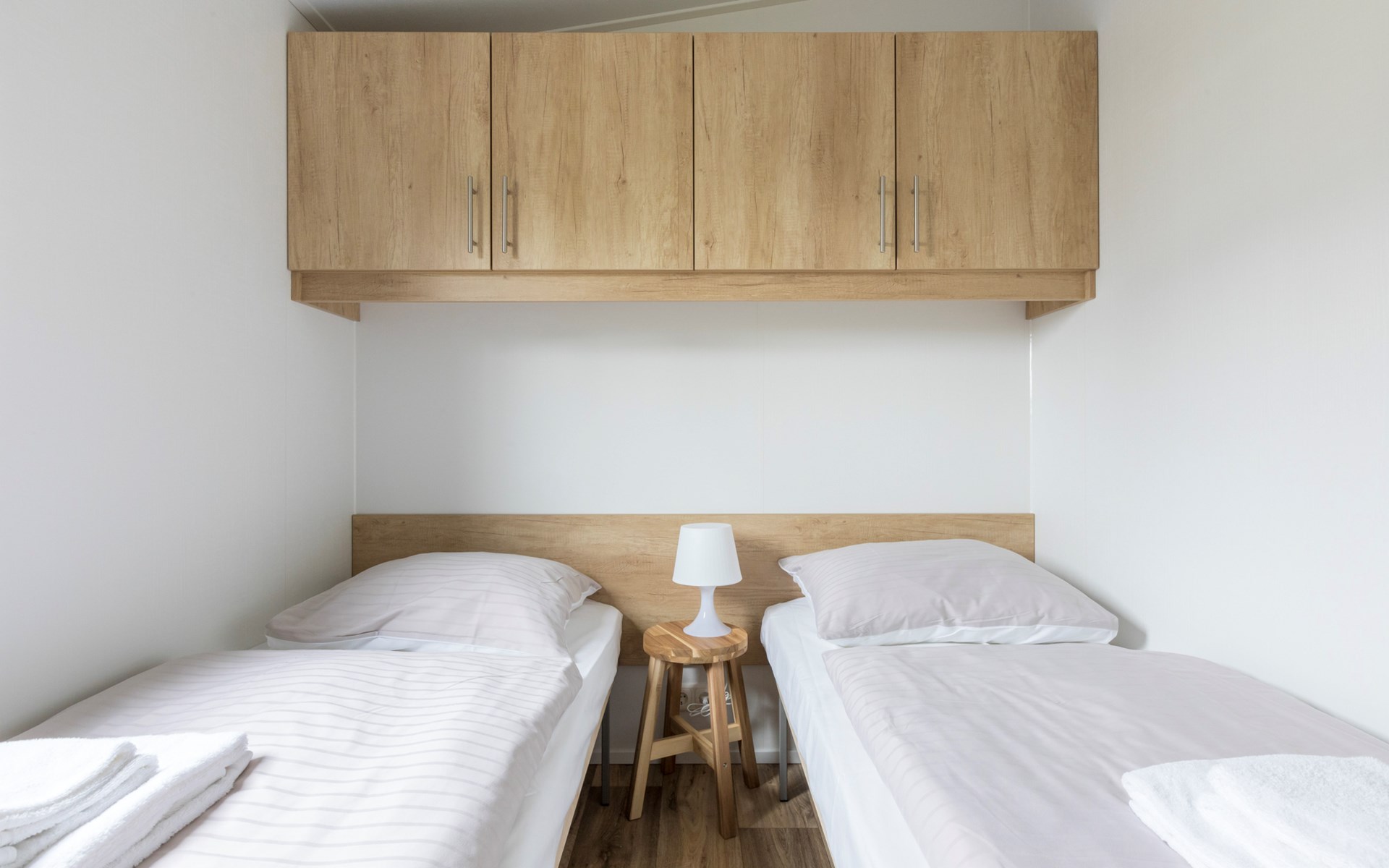 Die Chalets verfügen über zwei Schlafzimmer: eines mit einem Doppelbett (180x200 cm) und eines mit zwei Einzelbetten (80x200 cm). Das Badezimmer enthält eine Dusche, Toilette und ein Waschbecken mit Stauraum darunter. Auf der Veranda können Sie unter dem Dach herrlich genießen, sitzend am Gartentisch mit Platz für 4 Personen.