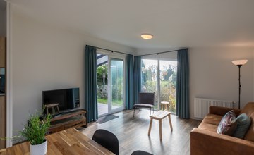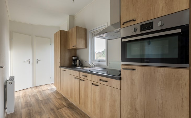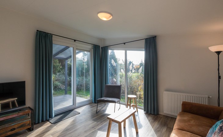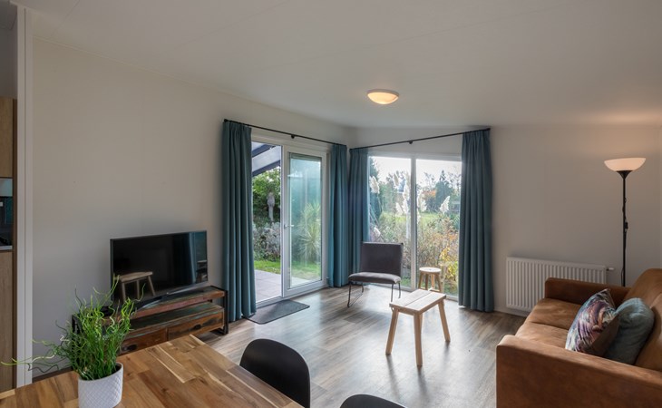 Sobald Sie die Schwelle Ihres Chalets überschreiten, beginnt der Genuss. Bequemlichkeit und Komfort sind die Basis jedes Chalets. Vom Wohnzimmer mit gemütlicher Sitzecke blicken Sie auf den schönen Garten und treten direkt auf Ihre eigene Veranda. Im Wohnbereich befindet sich auch ein gemütlicher Essbereich mit Platz für 4 Personen. Die Küche ist voll ausgestattet und verfügt über eine Spülmaschine, eine Kombi-Mikrowelle, einen Kühlschrank mit Gefrierfach, eine Kaffeemaschine und einen Wasserkocher. Eine hervorragende Basis, um gemütlich in Ihrem Chalet zu kochen und gemeinsam zu essen.