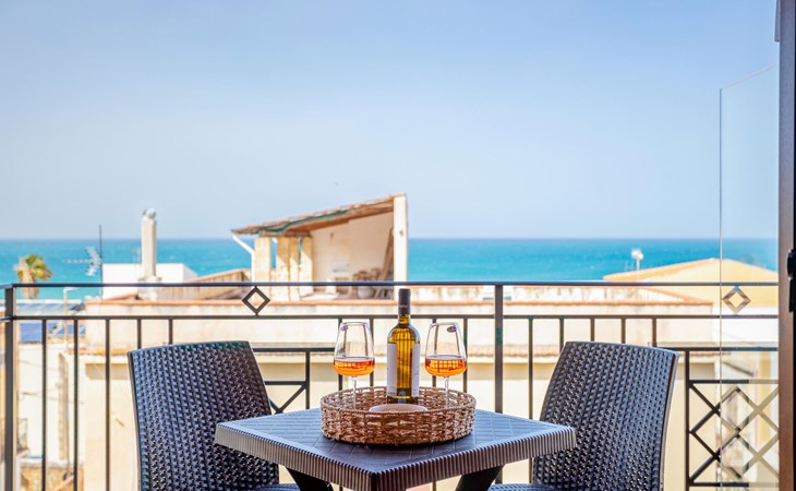 Servieren Sie sich ein ausgiebiges Frühstück auf dem Balkon und lassen Sie den Blick über das blaue Meer schweifen. Abends können Sie hier wunderschöne Sonnenuntergänge bei einem Glas Wein genießen.