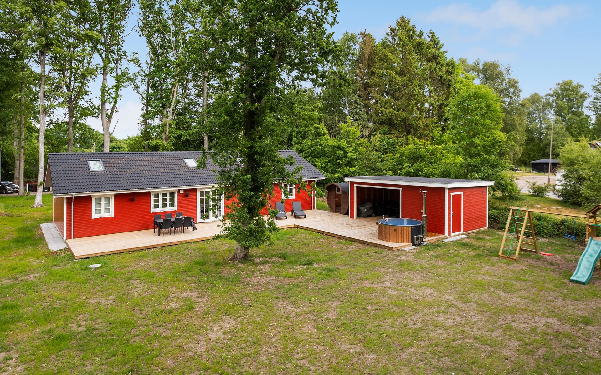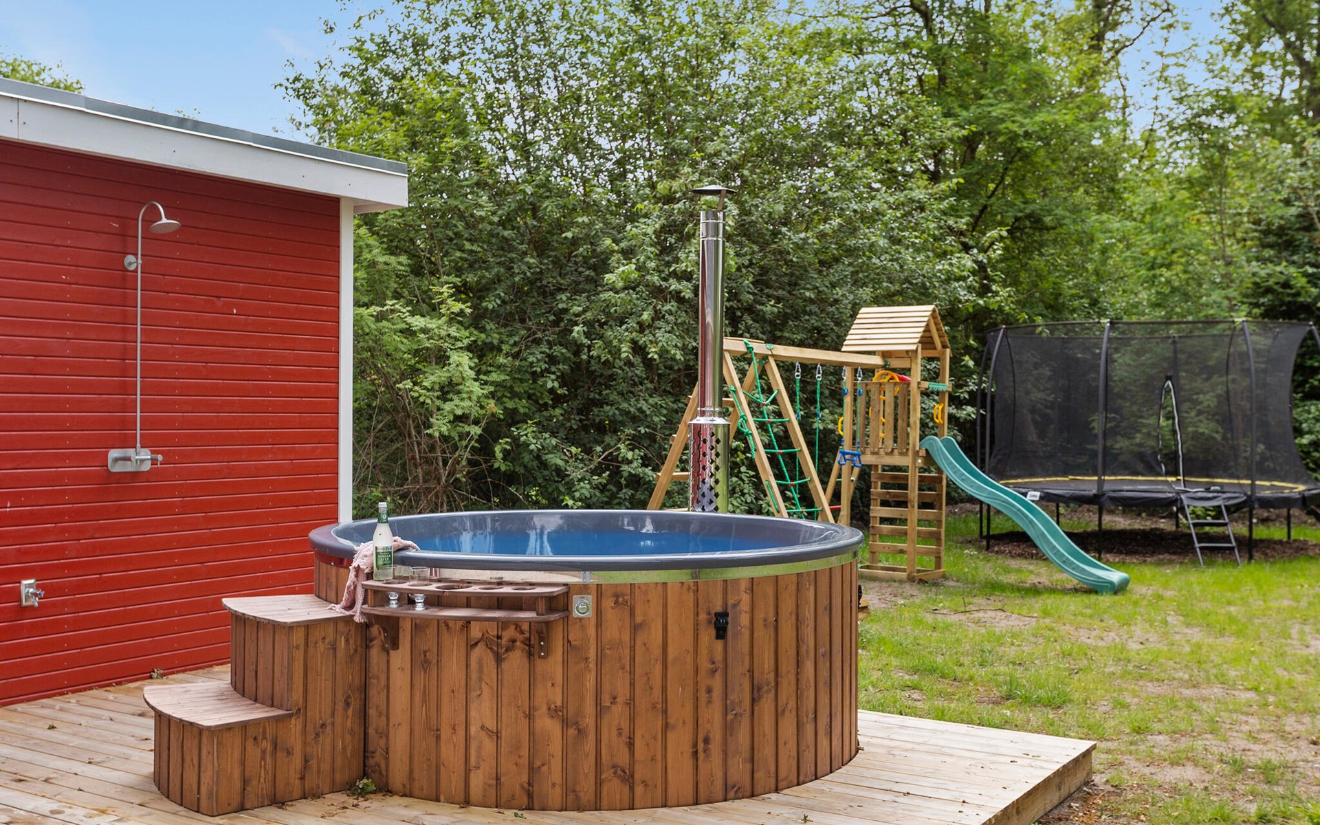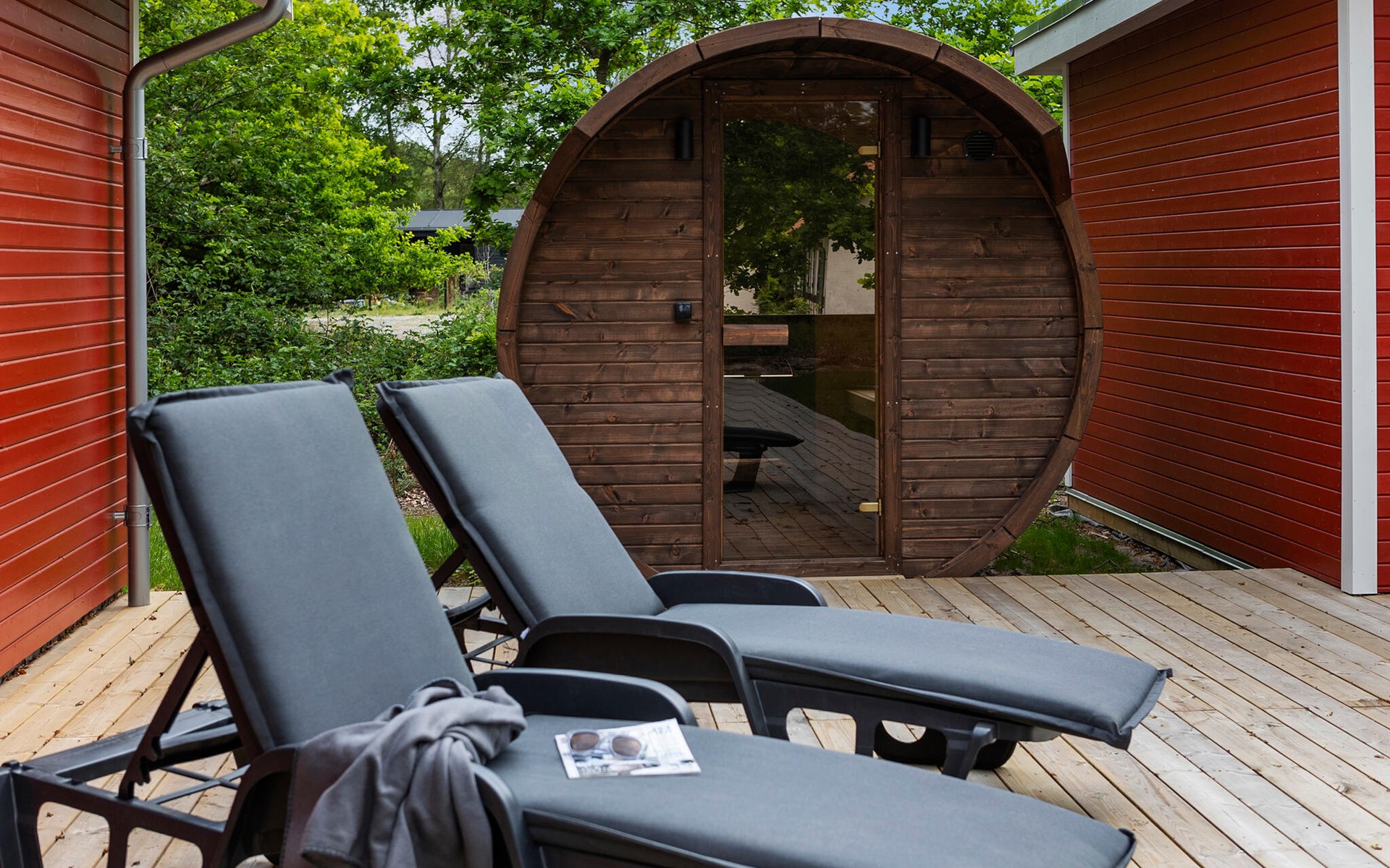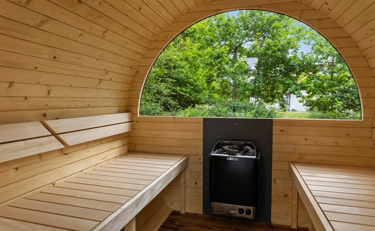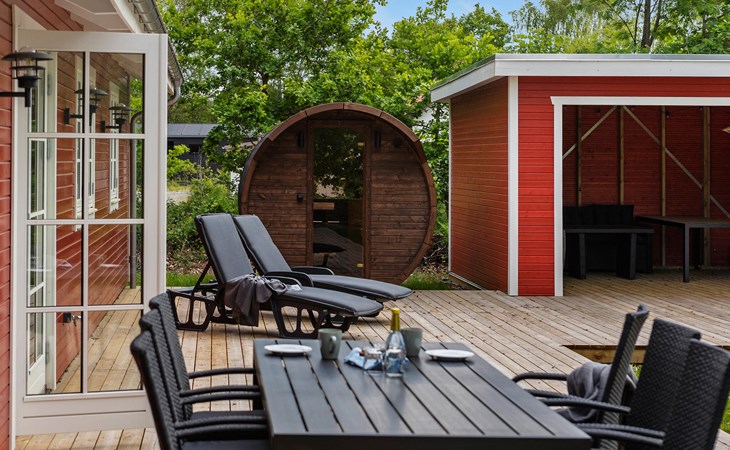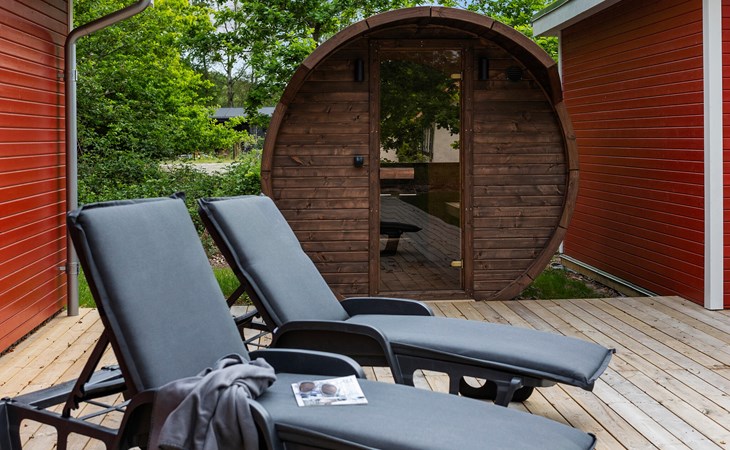 Auf der großzügigen Terrasse können Sie die ruhige Atmosphäre genießen und die hauseigenen Wellness-Angebote nutzen. Relaxe Sie in der wohltuenden Wärme der Fasssauna und hüpfen Sie zwischendurch immer wieder in das behagliche Finnische Holzbad.