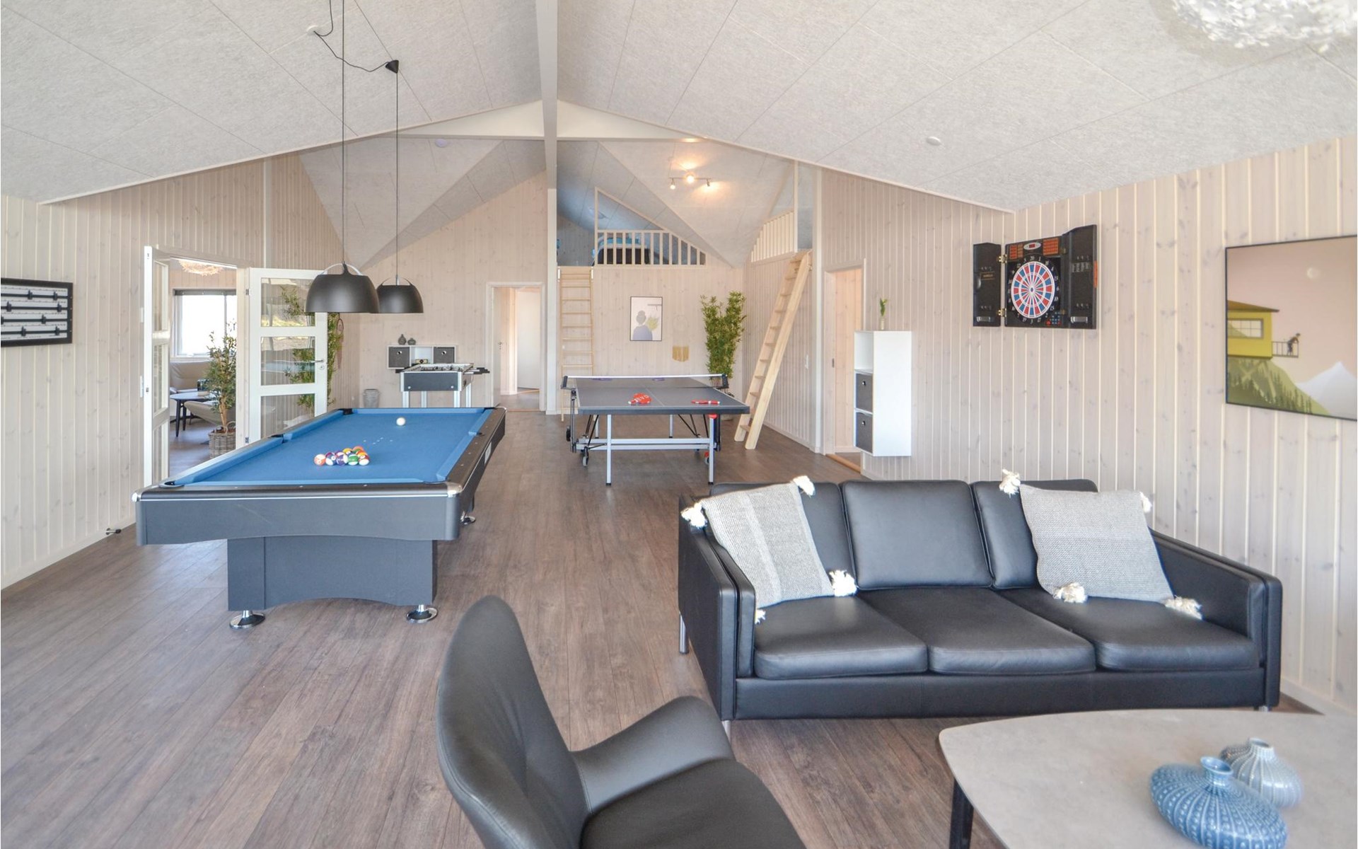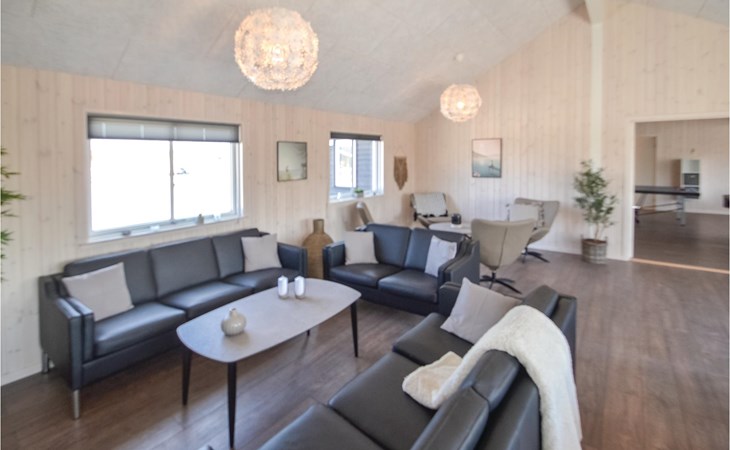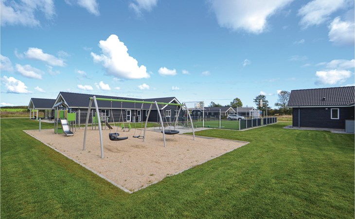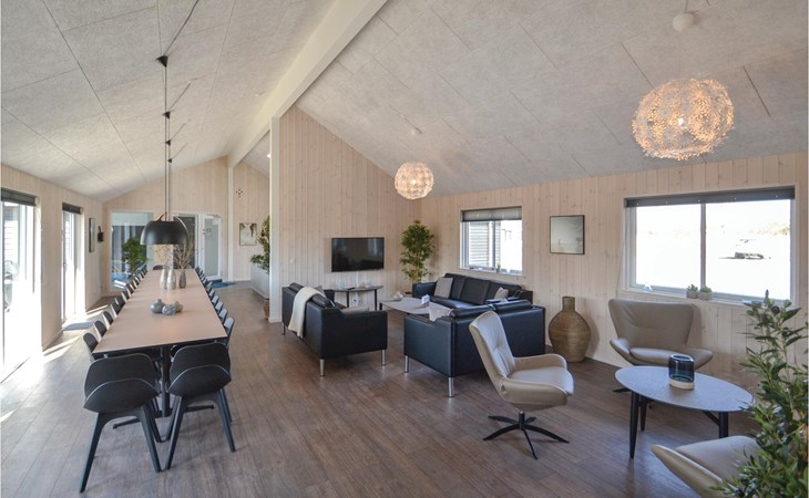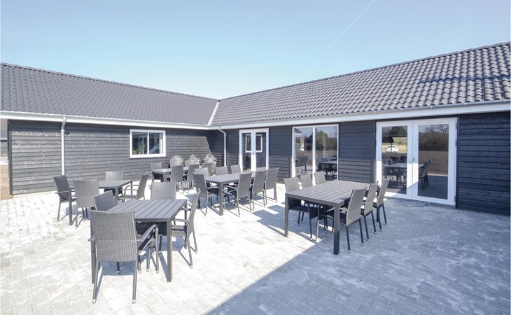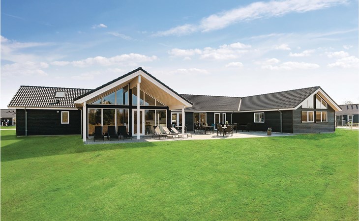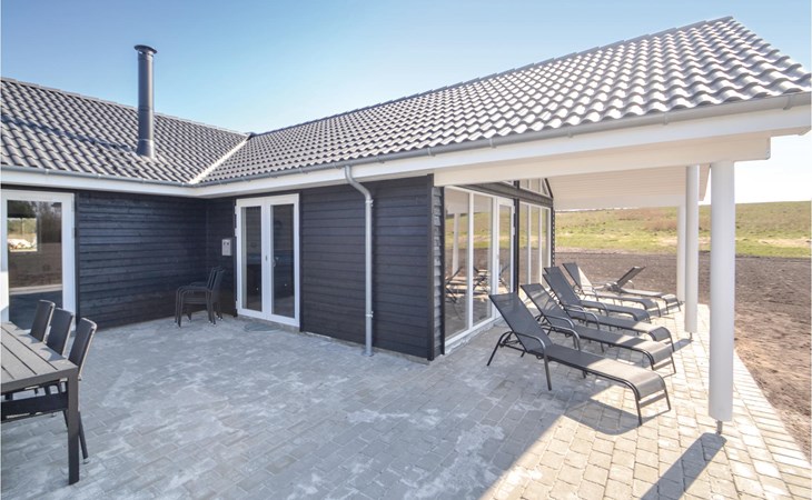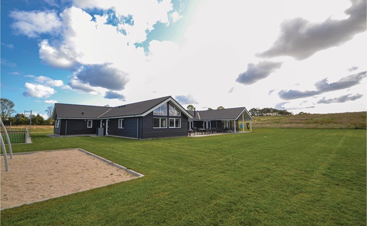 Insgesamt verfügt das Ferienhaus über fünf Badezimmer. Auf der großen, teilweise überdachten Terrasse können Sie grillen und die dänische Sonne genießen. Es gibt auch einen Sandkasten und ein Trampolin. Das Haus ist auch mit Ladestecker für Elektroautos ausgestattet.
