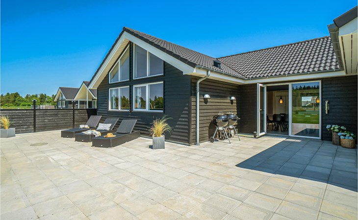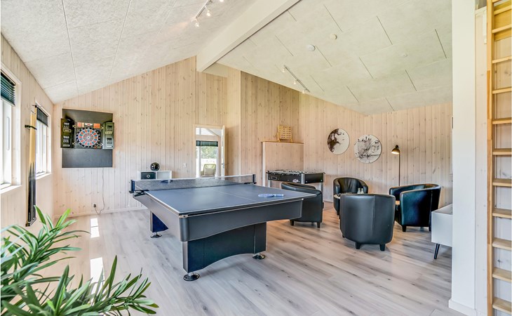 Das luxuriöse Ferienhaus eignet sich ideal für eine große oder mehrere Familien. Der Garten ist eingezäunt, sodass Kinder und Hunde unbeschwert und sicher spielen können. Die komfortable Wohnküche verfügt über eine Sofagruppe, TV sowie einen langen Esstisch mit Sitzgelegenheiten für alle. Machen Sie es sich an kühlen Abenden am Kaminofen gemütlich und bereiten Sie in der stilvoll eingerichteten Küche köstliche Mahlzeiten zu. Fordern Sie sich im Aktivitätsraum gegenseitig zu einer Partie Billard, Tischtennis oder Tischfußball heraus, während sich die Zuschauer ein kühles Getränk an der Hausbar gönnen. Das Haus hat einen eigenen Wellnessbereich mit beheiztem Swimmingpool, Wasserrutsche und Gegenstromanlage. Entspannen Sie auch im Whirlpool und genießen Sie die Wärme der Sauna.