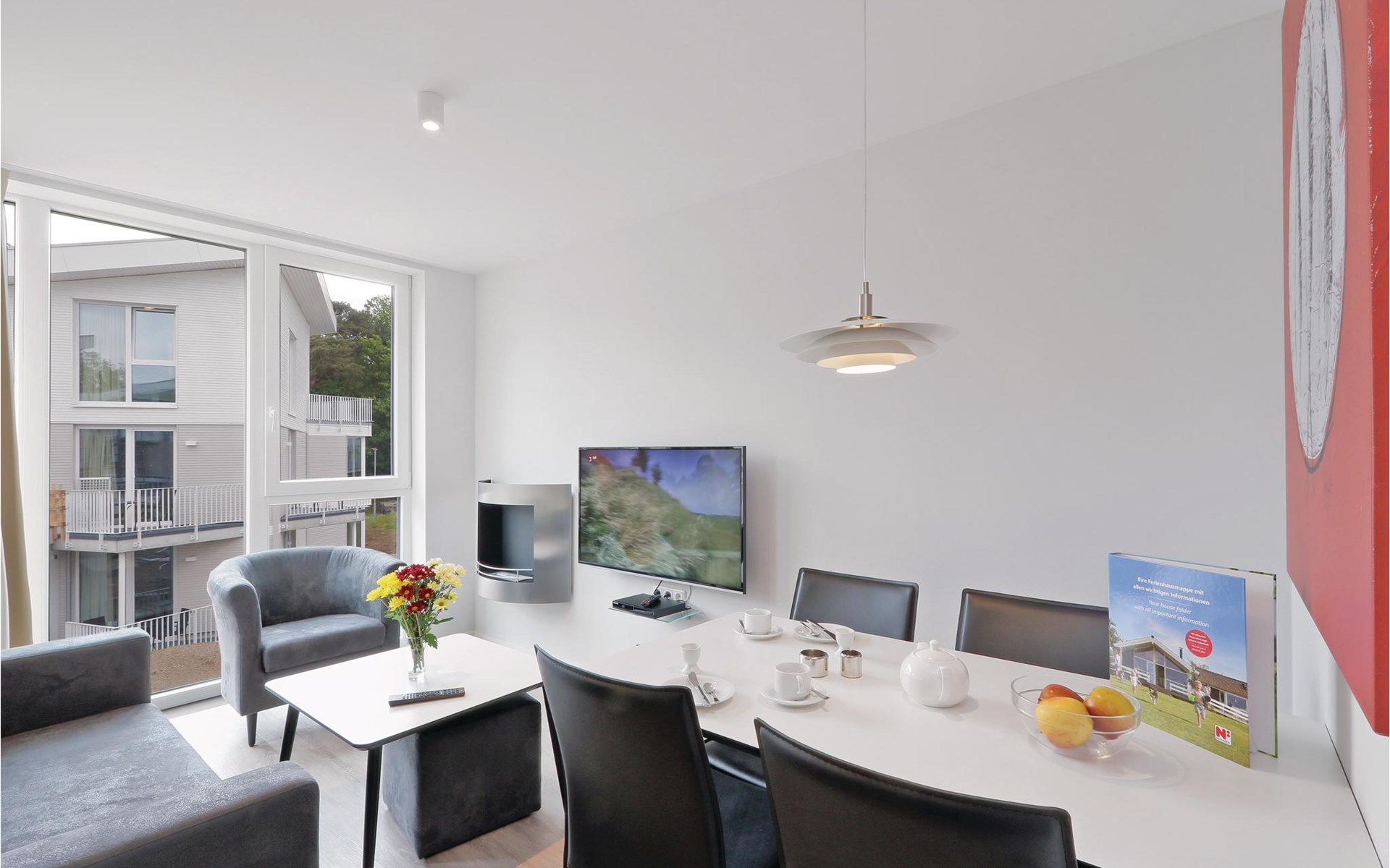 Der Wohnbereich verfügt über einen Erker aus Glas, dadurch ist die Ferienwohnung besonders hell und lichtdurchflutet. Hier befinden sich ebenfalls die Küchenzeile, das Schlafsofa sowie der Bio-Ethanolkamin. Dieser taucht Ihre Ferienwohnung in ein angenehmes Licht. Den Balkon erreichen Sie vom separaten Schlafzimmer aus. Hier können Sie gemeinsam frühstücken oder einfach nur die frische Ostseeluft genießen.