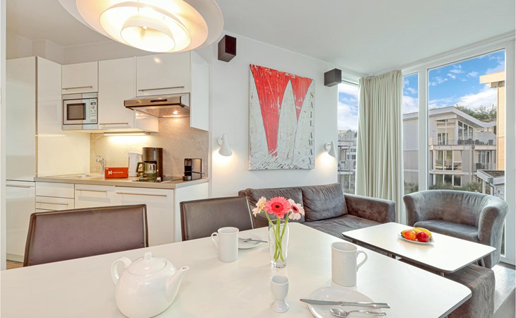 Genießen Sie Ihren Urlaub an der Ostsee im neuen Ferienresort BeachBay auf dem Priwall in Lübeck Travemünde. Die komfortable Ferienwohnung befindet sich im 1. Obergeschoss der Dünenvilla in ruhiger Lage, hinter den Promenadenvillen. Die im Strandhausstil gebaute Unterkunft fügt sich perfekt in die angelegte Dünenlandschaft ein.