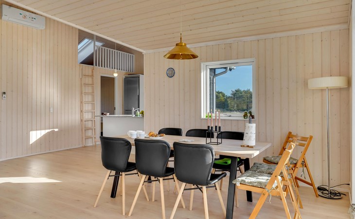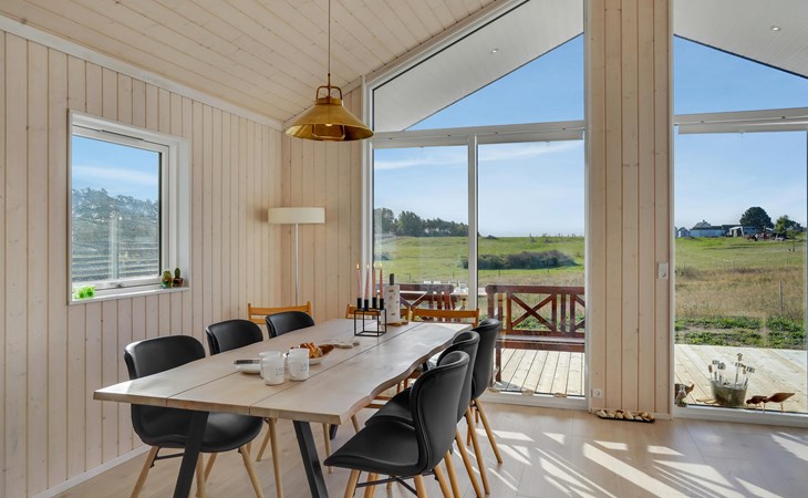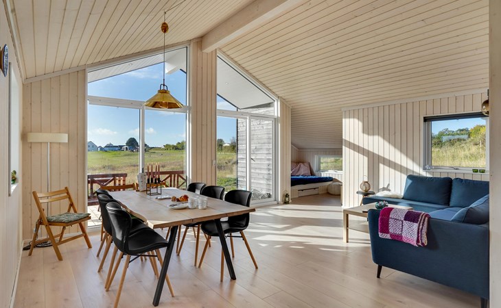 In naturschöner Umgebung finden Sie auf der charmanten Halbinsel Røsnæs dieses geräumige, helle Ferienhaus. Das Herzstück des komfortabel ausgestatteten Hauses bildet der große, offene Wohnbereich mit Fensterfront und Blick auf die Landschaft.
