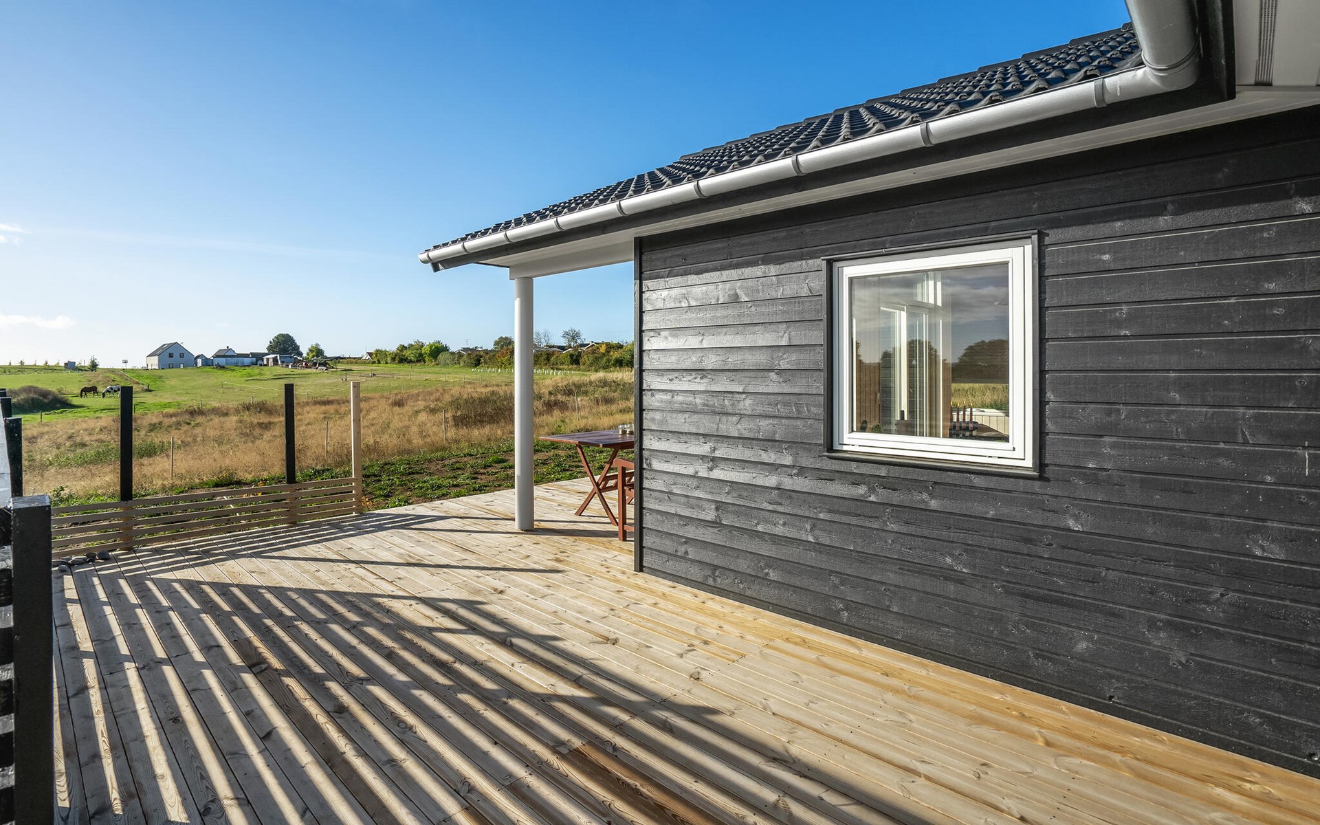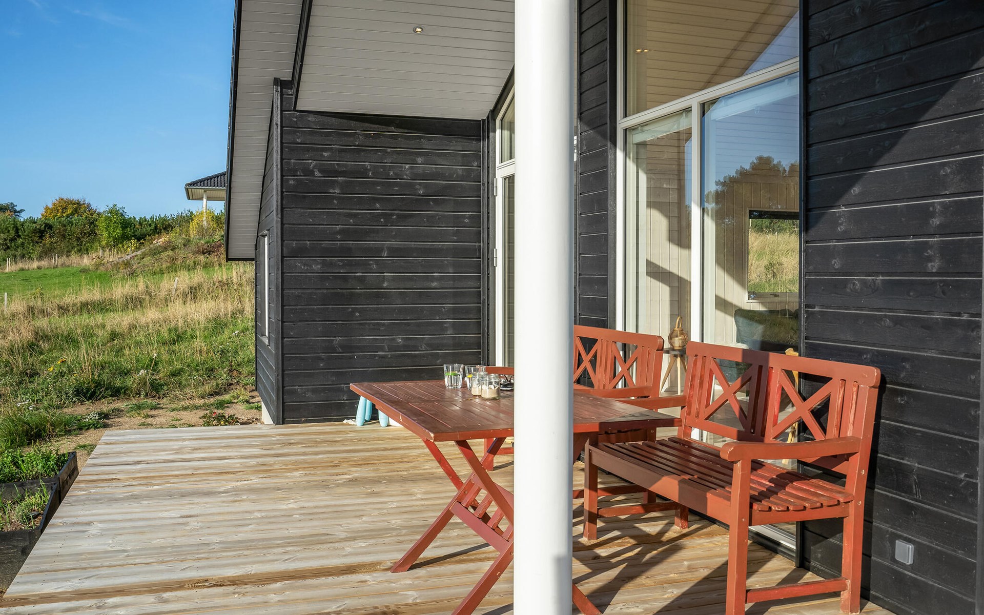 Vom Wohnzimmer aus gelangen Sie auf eine der schönen Holzterrassen mit Gartenmöbeln. Machen Sie sich es am Gartentisch bei einem frisch gebrühten Kaffee und einem guten Buch bequem. Für einen idyllischen, stimmungsvollen Ausklang des Tages finden Sie hier den perfekten Ort.