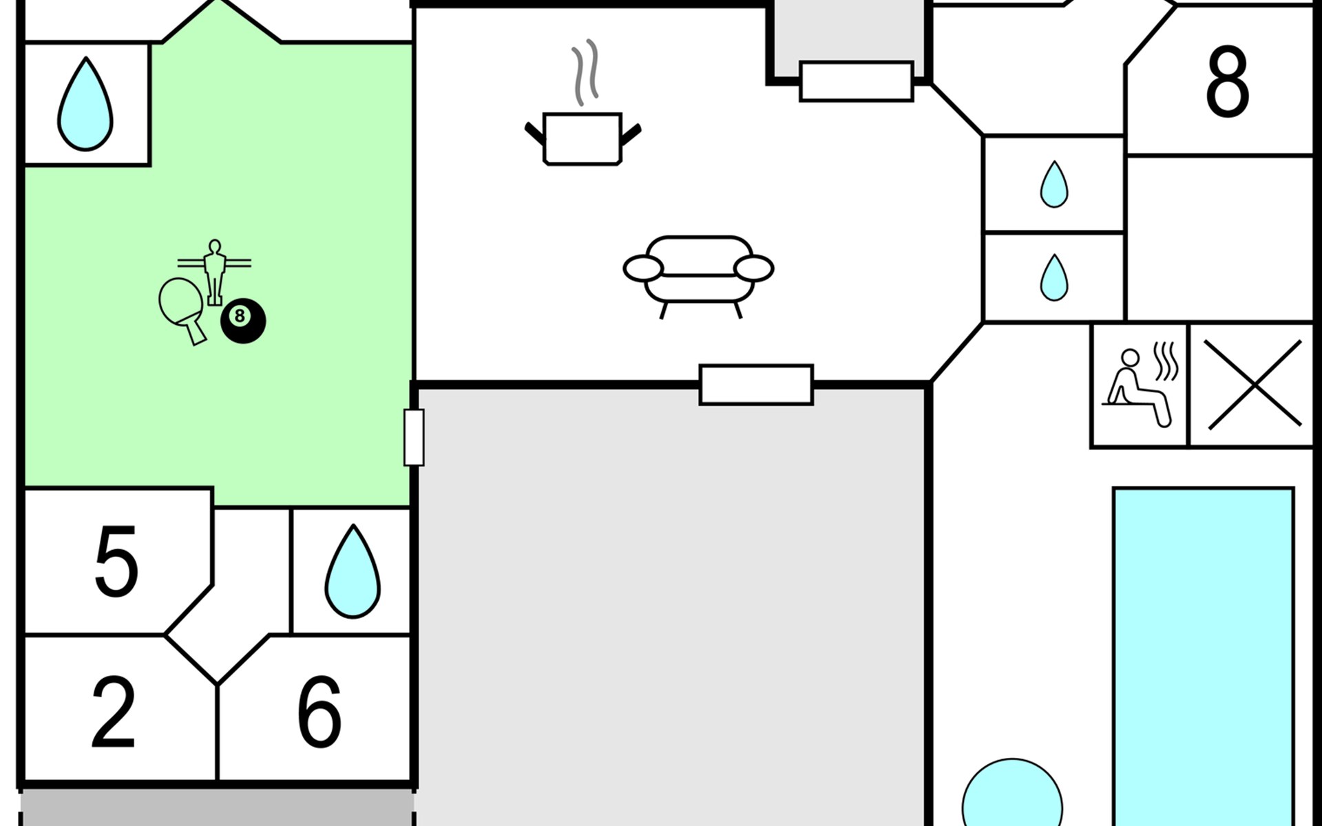 In der Nähe der Ferienstadt Blåvand mit ihren vielen Möglichkeiten und dem schönen Strand erwartet Sie dieses prächtige Ferienhaus mit Swimmingpool, dessen viele Aktivitätsmöglichkeiten zu jeder Jahreszeit einen perfekten Rahmen um Ihren Urlaub bilden werden. Im Haus erwartet Sie jeder erdenkliche Luxus, und es ist um mehrere Schlafbereiche mit jeweils eigenem Badezimmer eingerichtet, so dass es hervorragend für mehrere Familien geeignet ist, die zusammen Urlaub machen möchten. Der große Schlafboden mit Platz für vier Personen wird ganz sicher bei den Kindern ein Hit sein. Das Haus ist mit schalldämmenden Decken ausgestattet, was den Aufenthalt besonders angenehm macht. Im Haus ist besonders viel Wert auf Luxus gelegt worden, was besonders im beeindruckenden Poolbereich deutlich wird. Dort erwartet Sie ein großer Pool mit Wasserrutsche, ein Whirlpool für 4-6 Personen und eine Sauna. Im geräumigen Aktivitätsraum können Sie Spiele wie Billard, Tischtennis, Darts oder Tischfußball und mehr spielen. An der Bar können Sie sich interessante Cocktails mixen oder einfach kaltes Bier und andere Getränke direkt aus dem Kühlschrank der Bar servieren. Die Küche ist besonders gut ausgestattet und verfügt über zwei Herde, zwei Waschmaschinen und zwei Kühl- und Gefrierschänke, so dass auch viele Köche hier gar nichts verderben, wenn gemeinsam ein leckeres Festessen zubereitet wird. Den dänischen Sommer können Sie auf der Terrasse genießen, während die Kinder schaukeln oder im Sandkasten buddeln. Es gibt auch eine überdachte Terrasse mit offenem Kamin und Loungemöbeln. Wenige hundert Meter von Haus liegt der schönste Minigolfplatz Dänemarks.