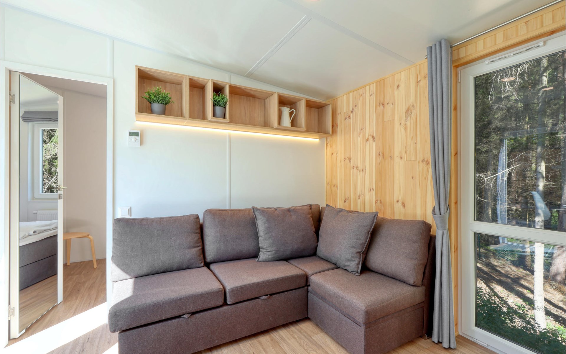 Der gemütliche Wohnbereich mit Schlafcouch, Essbereich und gut ausgestatteter Küchenzeile lädt zu gemeinsamen Stunden mit der Familie ein. Im separaten Schlafzimmer lässt es sich wunderbar träumen. Die Schlafcouch im Wohnbereich ist 170 cm lang und daher nur für Kinder geeignet. Zusätzlich verfügt das Tiny Haus über ein eigenes Bad mit Dusche.