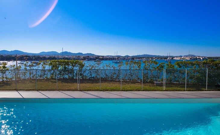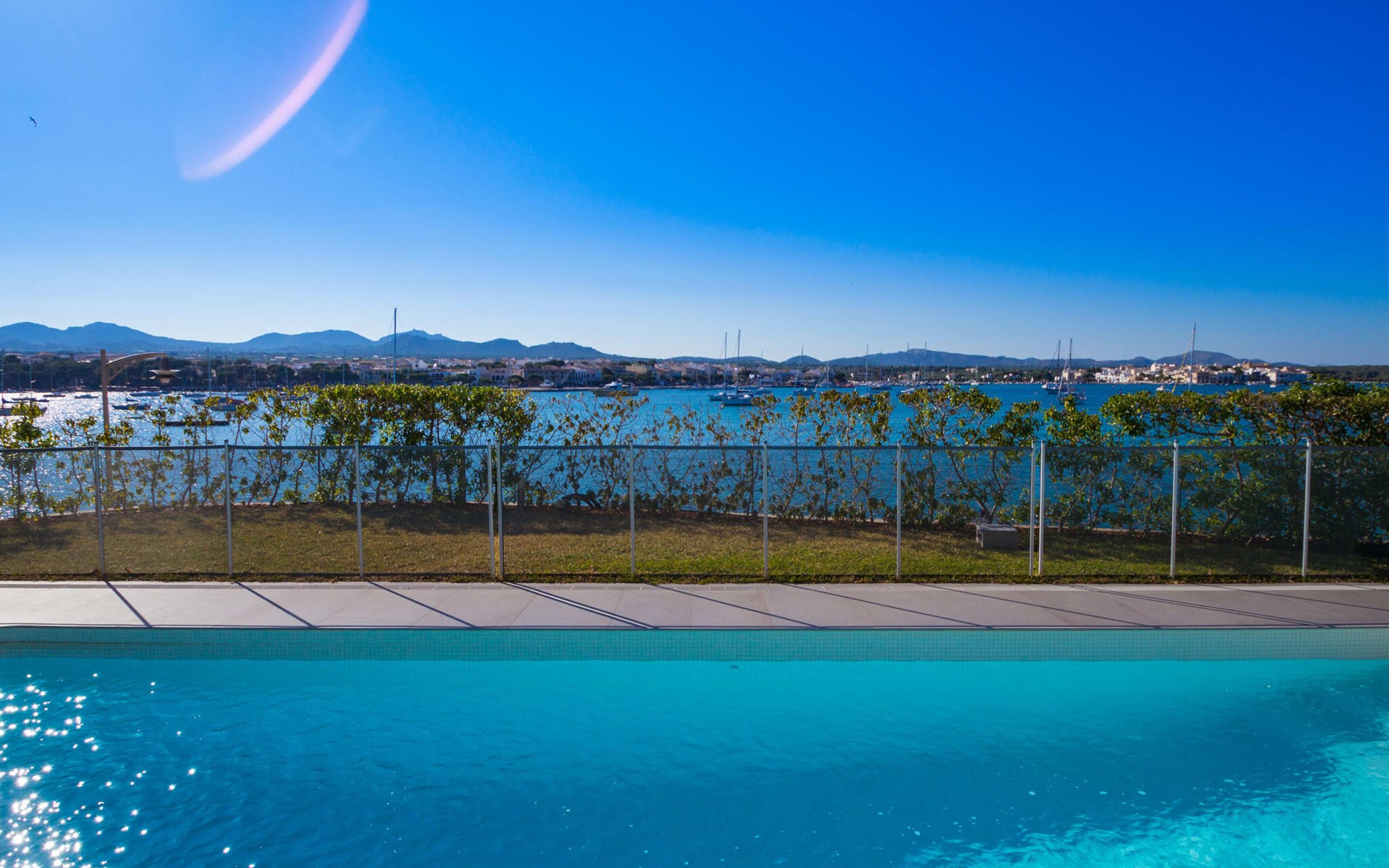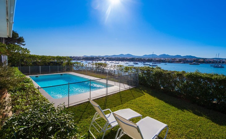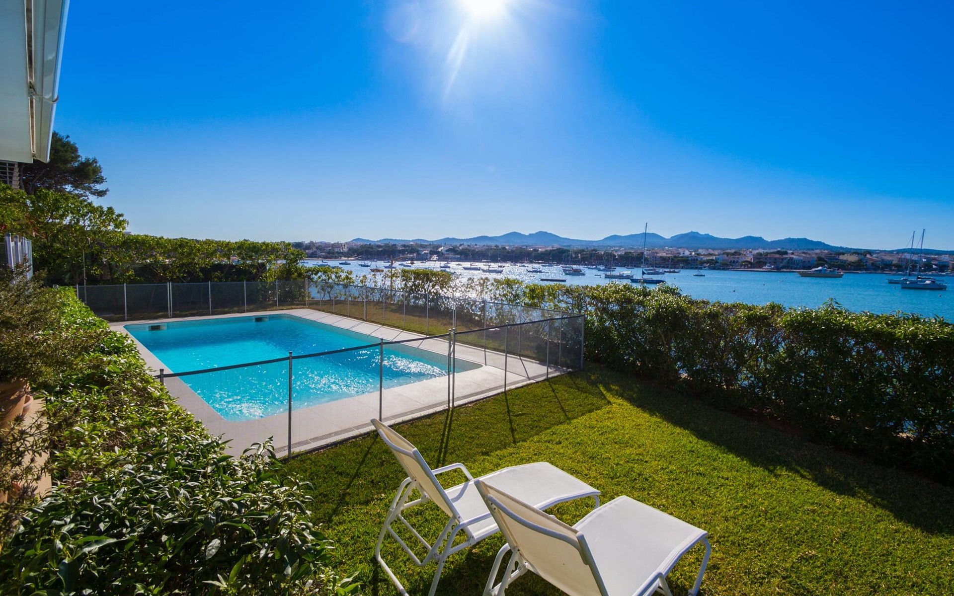 Der äußerst schöne Pool ist in das Haus integriert und verfügt über einen Zaun, um mögliche mitreisende Kleinkinder zu schützen. Darüber hinaus dient es als Absicherung, um Privatsphäre und Gemütlichkeit zu gewährleisten. Eine Sonnenterrasse sowie die angrenzende Liegewiese laden zum ausgiebigen Entspannen und Sonnenbaden auf einer der bequemen Liegestühle ein. Für den Fall, dass die Sonne zu stark scheint, stehen zwei Sonnenschirme zur Verfügung. Die Terrasse direkt am Pool bietet zu jeder Tageszeit luftigen Schatten und einen modernen Esstisch, von dem aus man nur staunend auf das herrliche Panorama blicken kann, das direkt vor einem liegt. So oder so ist es ein Vergnügen, den Tag im Morgenlicht zu beginnen oder nachts die funkelnden Lichter des Hafens zu bestaunen. Direkt an der Ecke und strategisch günstig am Sonnenlauf positioniert, befindet sich der herrliche Lounge-Bereich, in dem man nach Lust und Laune entspannen und den Zauber dieses Ortes genießen kann. Die überwiegend weiße Farbe verleiht der Umgebung ein exquisites Design und bildet gleichzeitig einen tollen Kontrast zum tiefblauen Himmel und dem Meer.