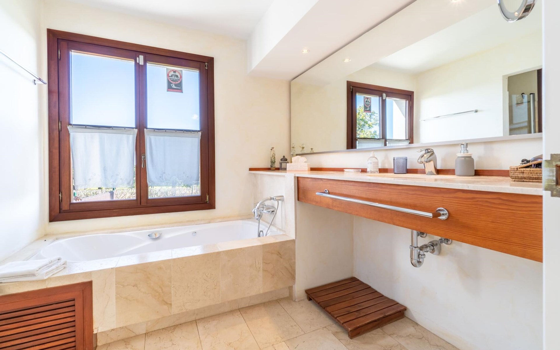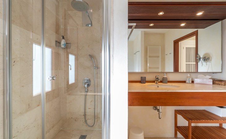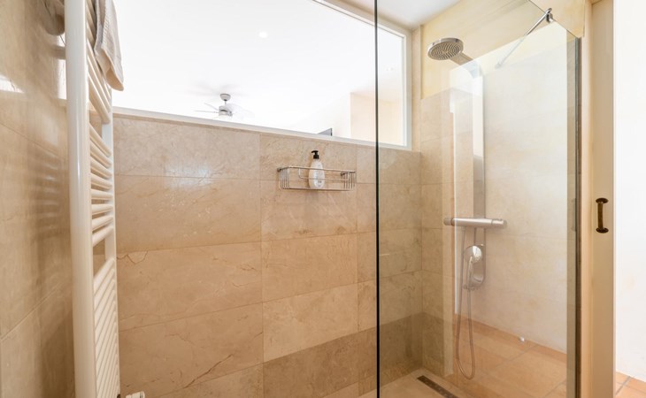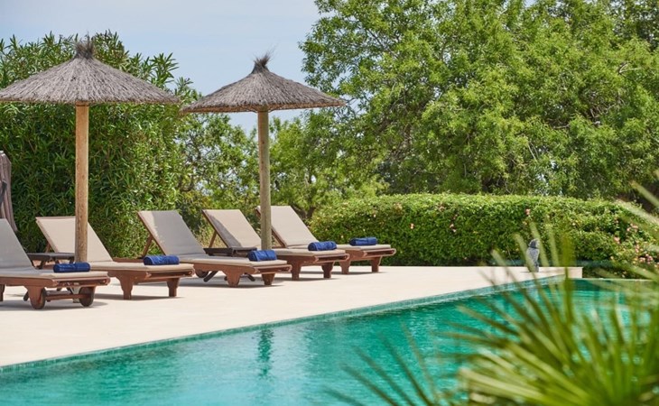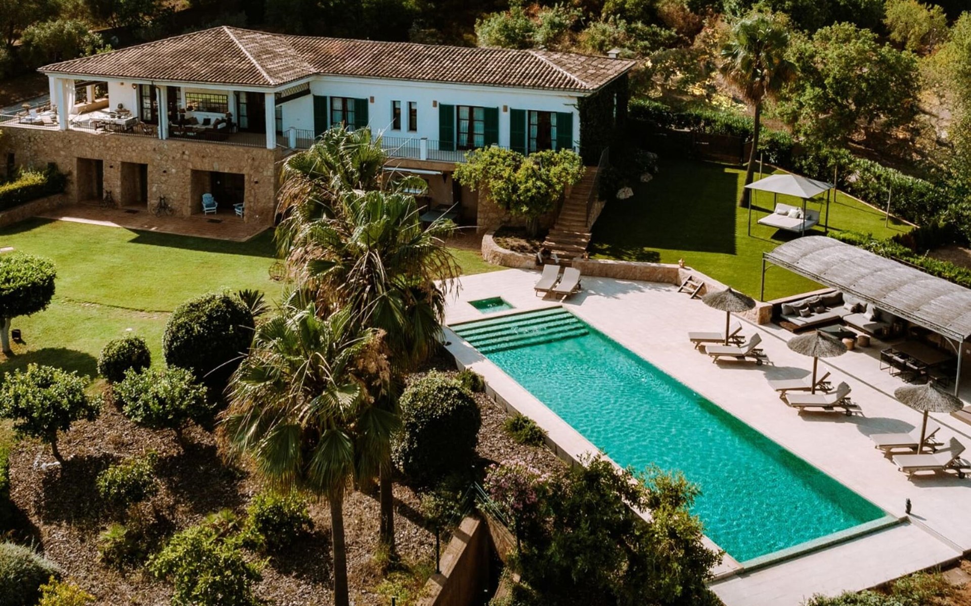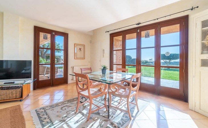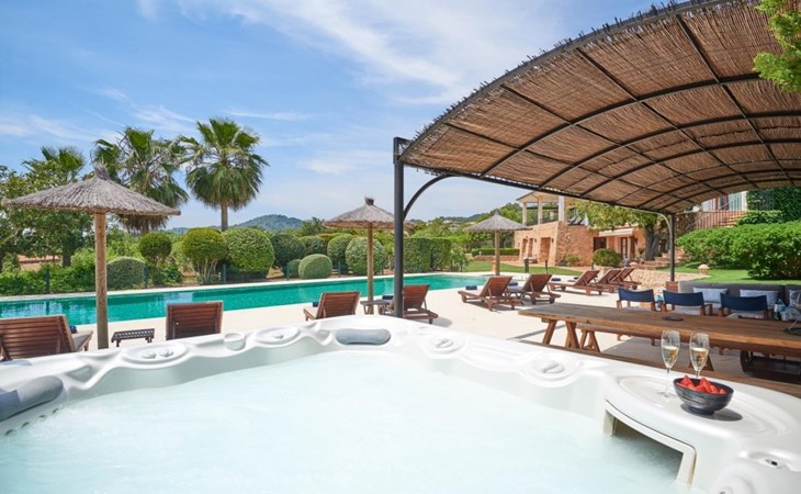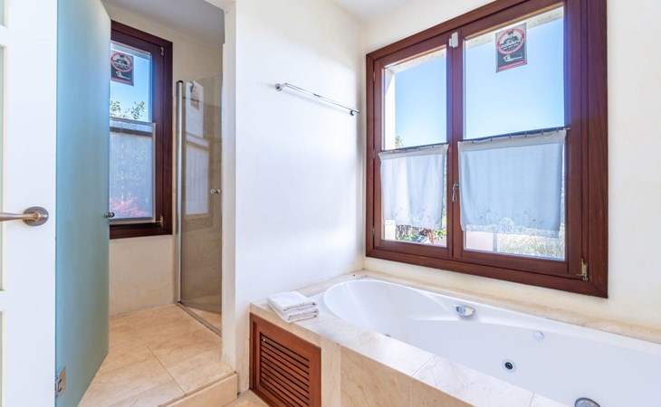 Die Villa „Luxury Golf d'Or“ ist ein echter Glücksfall für alle, die ihren Urlaub in absoluter Privatsphäre verbringen möchten, ohne auf den Service eines guten Hotels verzichten zu müssen. Diese Anforderungen lassen sich an dieser Stelle problemlos kombinieren. Auf den unglaublichen 500 m² Wohnfläche können Sie sich nach Belieben in kleinen oder großen Gruppen aufteilen und sich trotzdem ungestört fühlen und gleichzeitig eine Zimmerreinigung und einen Frühstücksservice buchen. Das 6.000 m² große Grundstück gleicht einem paradiesischen Garten mit Rasenflächen, schönen Pflanzen, kleinen Wegen und kleinen Mauern. Rund um das Haus finden sich einladende Sitzgelegenheiten in der Sonne oder im Schatten, so dass man nach Belieben die unterschiedlichsten schönen Plätze erkunden und verweilen kann. Das Highlight des Gartens ist die Poollandschaft mit einem sehr eleganten Pool und der angrenzenden, teilweise überdachten Sonnenterrasse. Auf den hochwertigen Liegen kann man nach Lust und Laune entspannen und ein erfrischendes Bad im gesamten 18 m langen Becken genießen. Eine erfrischende Außendusche und ein moderner Whirlpool runden diesen Wellnessbereich luxuriös ab. Was für ein Vergnügen es ist, zu jeder Tages- und Nachtzeit im Whirlpool an der frischen Luft zu liegen!