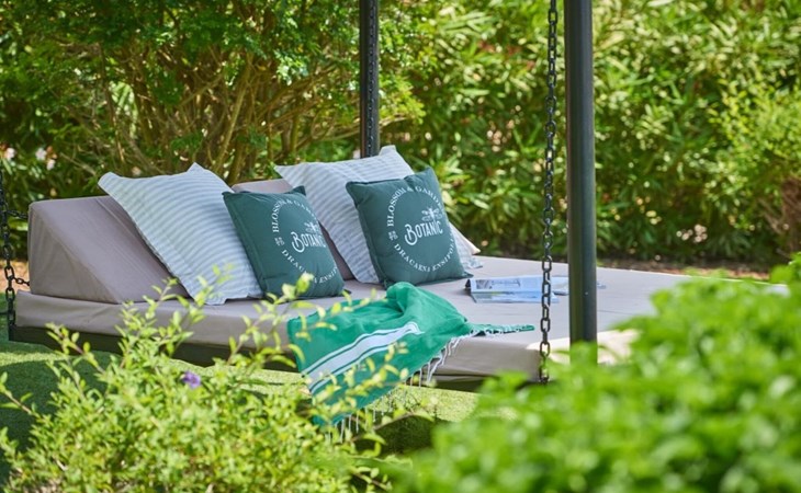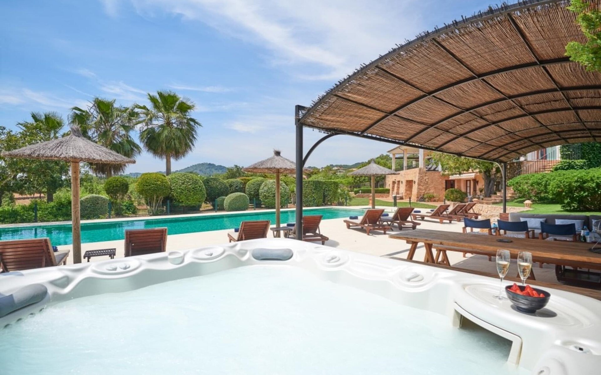 Vom Pool führt ein kleiner Weg zum Haus, das seitlich über eine trendige Outdoor-Lounge verfügt, die zum Entspannen und Genießen der traumhaften Aussicht von den bequemen Sofas aus einlädt.