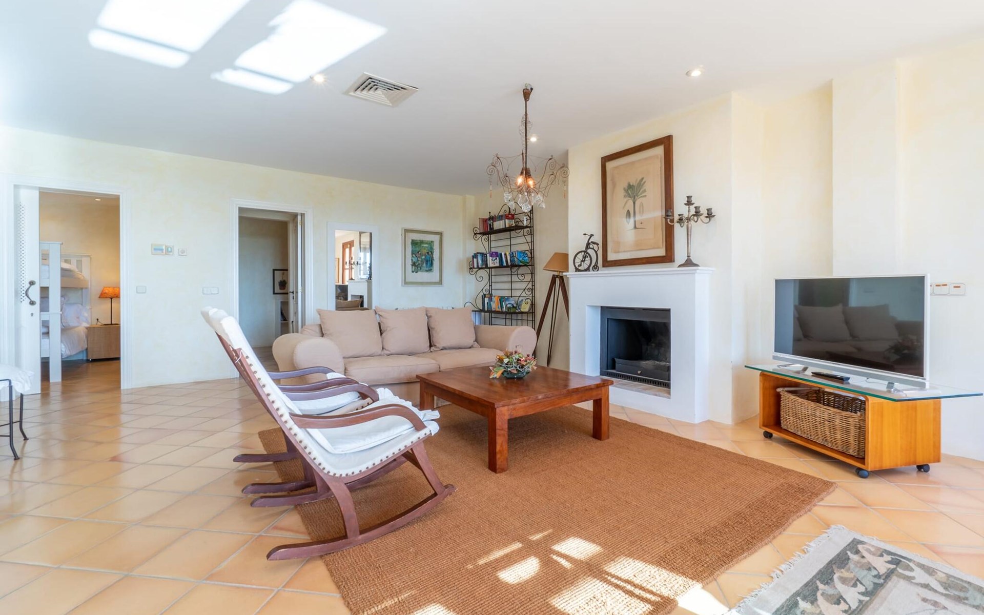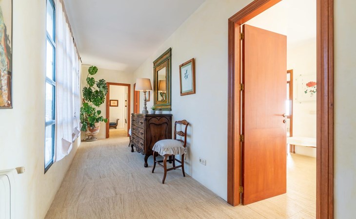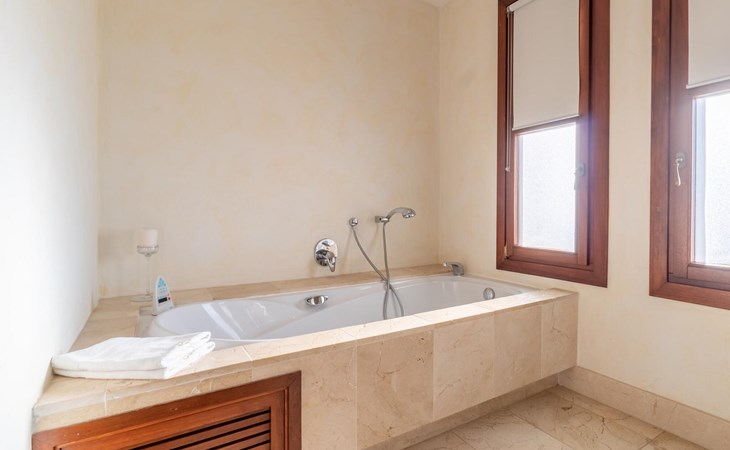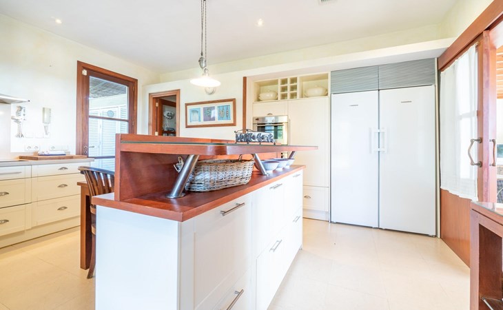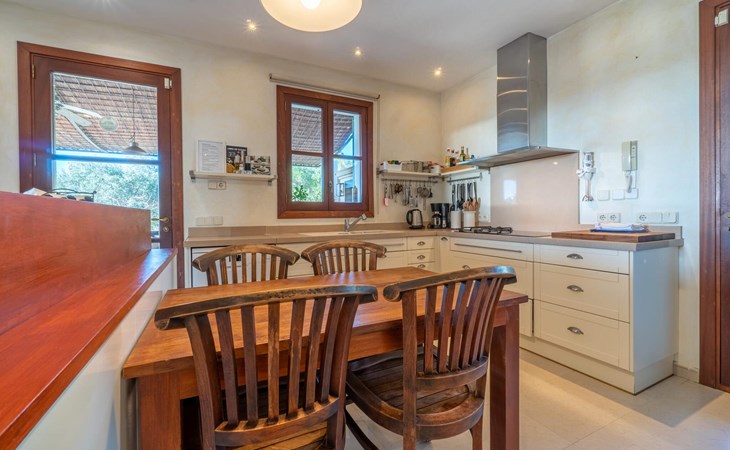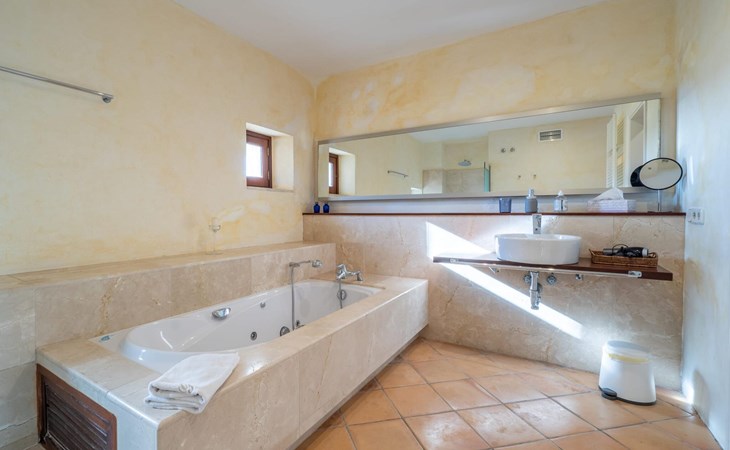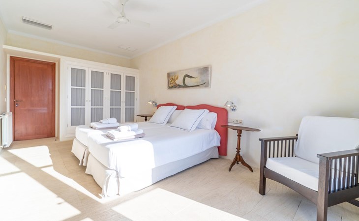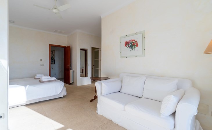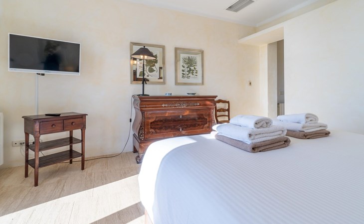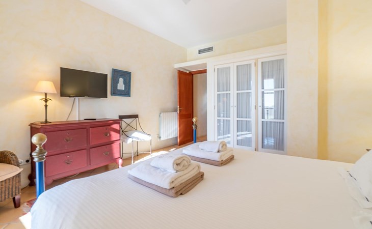 Beim Betreten des Hauses wird man von einer außergewöhnlich heimeligen Atmosphäre empfangen und von einem ästhetisch ansprechenden Wohnambiente umhüllt. Elegante Einzelstücke und hochwertige Materialien überraschen in einer sehr harmonischen Kombination. Ein großes Wohn-/Esszimmer bietet einen Esstisch für acht Personen, sowie eine äußerst gemütliche Sofaecke. Auch der Flachbildfernseher ist bequem im Wohnraum platziert. An kühleren Abenden kann man sogar beim Kaminlicht entspannen und an der Wärme eines Feuers sitzen. Die helle und freundlich gestaltete Küche ist komplett ausgestattet mit Kühlschrank, Backofen, Herd, Geschirrspüler, Toaster sowie Wasserkocher und Kaffeemaschine. Hier besteht zusätzlich die Möglichkeit, zu viert eine Mahlzeit einzunehmen. Zusätzliche Ess- und Wohnräume ergänzen die bisherige Beschreibung in vielerlei Hinsicht, so dass auch eine große Reisegruppe problemlos ihren ganz privaten Rückzugsort einnehmen kann. Die Schlafzimmer (alle fünf Doppelzimmer verfügen über ein eigenes Badezimmer, drei davon verfügen über eine Hydromassage-Badewanne) sind großzügig geschnitten, mit hochwertigen Möbeln ausgestattet und zeigen ein elegantes Design. Der Verzicht auf viele störende Accessoires verleiht diesen Räumen ein helles und raffiniertes Erscheinungsbild, das zweifellos dazu anregt, eine angenehme Ruhe zu suchen. Auch in den Schlafzimmern kommt das geschmackvolle Design voll zur Geltung. Diese präsentieren sich in einem hochmodernen Stil, sind sehr funktional und großzügig geschnitten.