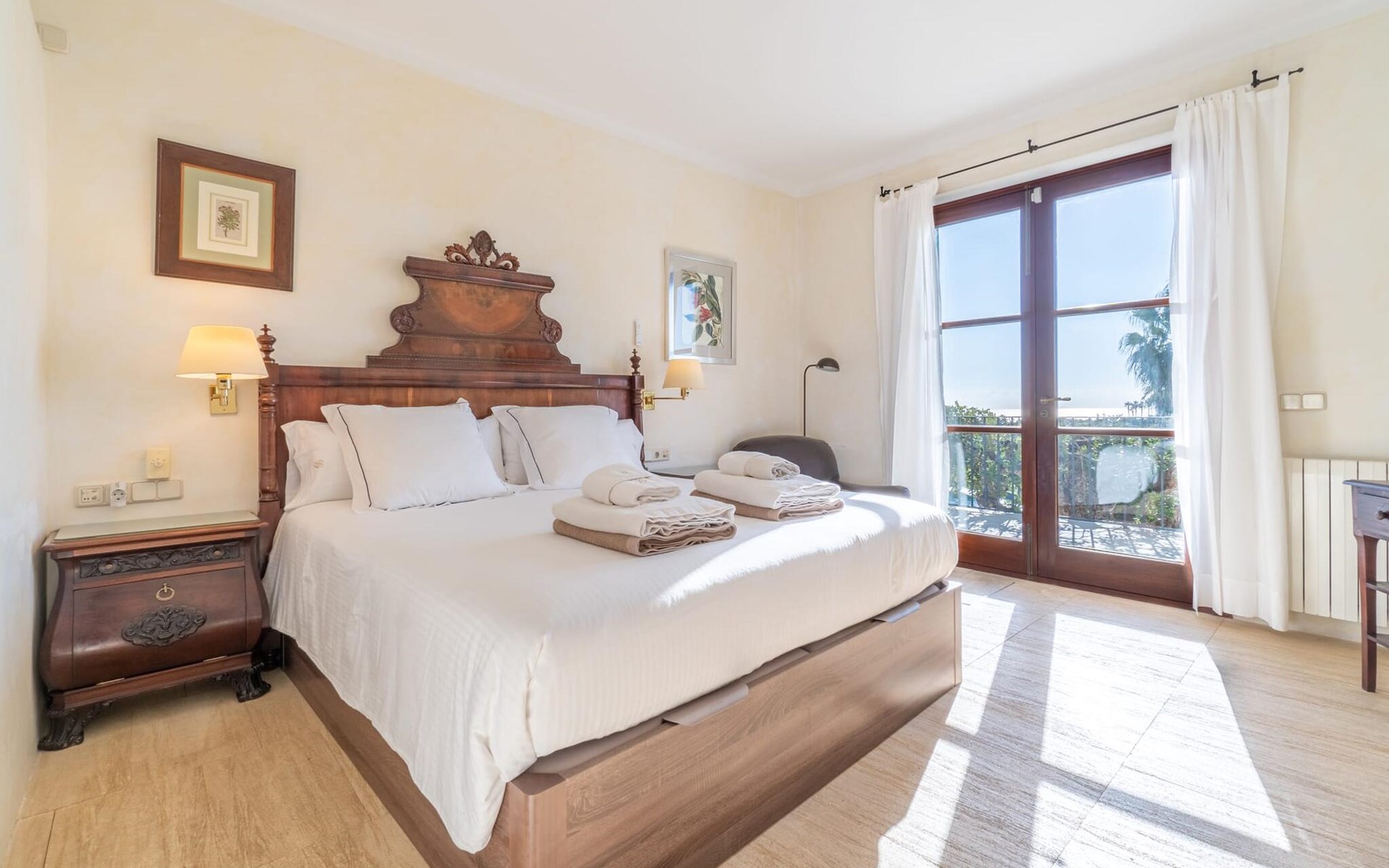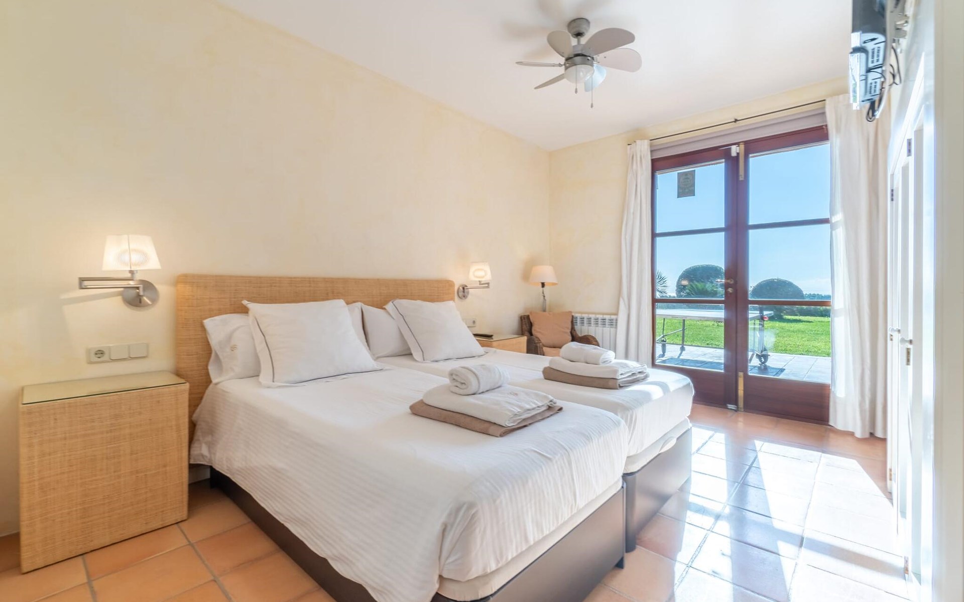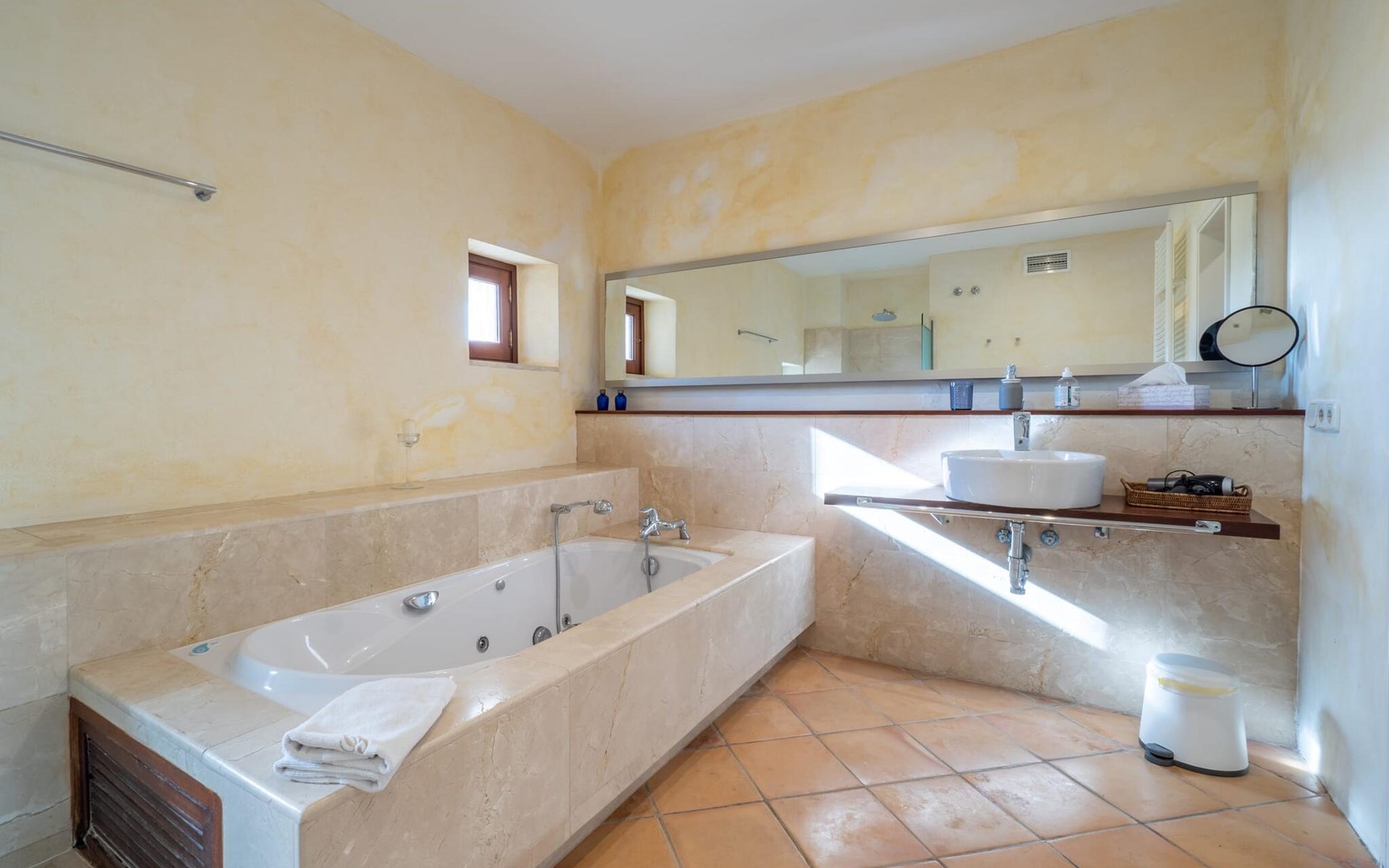 Beim Betreten des Hauses wird man von einer außergewöhnlich heimeligen Atmosphäre empfangen und von einem ästhetisch ansprechenden Wohnambiente umhüllt. Elegante Einzelstücke und hochwertige Materialien überraschen in einer sehr harmonischen Kombination. Ein großes Wohn-/Esszimmer bietet einen Esstisch für acht Personen, sowie eine äußerst gemütliche Sofaecke. Auch der Flachbildfernseher ist bequem im Wohnraum platziert. An kühleren Abenden kann man sogar beim Kaminlicht entspannen und an der Wärme eines Feuers sitzen. Die helle und freundlich gestaltete Küche ist komplett ausgestattet mit Kühlschrank, Backofen, Herd, Geschirrspüler, Toaster sowie Wasserkocher und Kaffeemaschine. Hier besteht zusätzlich die Möglichkeit, zu viert eine Mahlzeit einzunehmen. Zusätzliche Ess- und Wohnräume ergänzen die bisherige Beschreibung in vielerlei Hinsicht, so dass auch eine große Reisegruppe problemlos ihren ganz privaten Rückzugsort einnehmen kann. Die Schlafzimmer (alle fünf Doppelzimmer verfügen über ein eigenes Badezimmer, drei davon verfügen über eine Hydromassage-Badewanne) sind großzügig geschnitten, mit hochwertigen Möbeln ausgestattet und zeigen ein elegantes Design. Der Verzicht auf viele störende Accessoires verleiht diesen Räumen ein helles und raffiniertes Erscheinungsbild, das zweifellos dazu anregt, eine angenehme Ruhe zu suchen. Auch in den Schlafzimmern kommt das geschmackvolle Design voll zur Geltung. Diese präsentieren sich in einem hochmodernen Stil, sind sehr funktional und großzügig geschnitten.