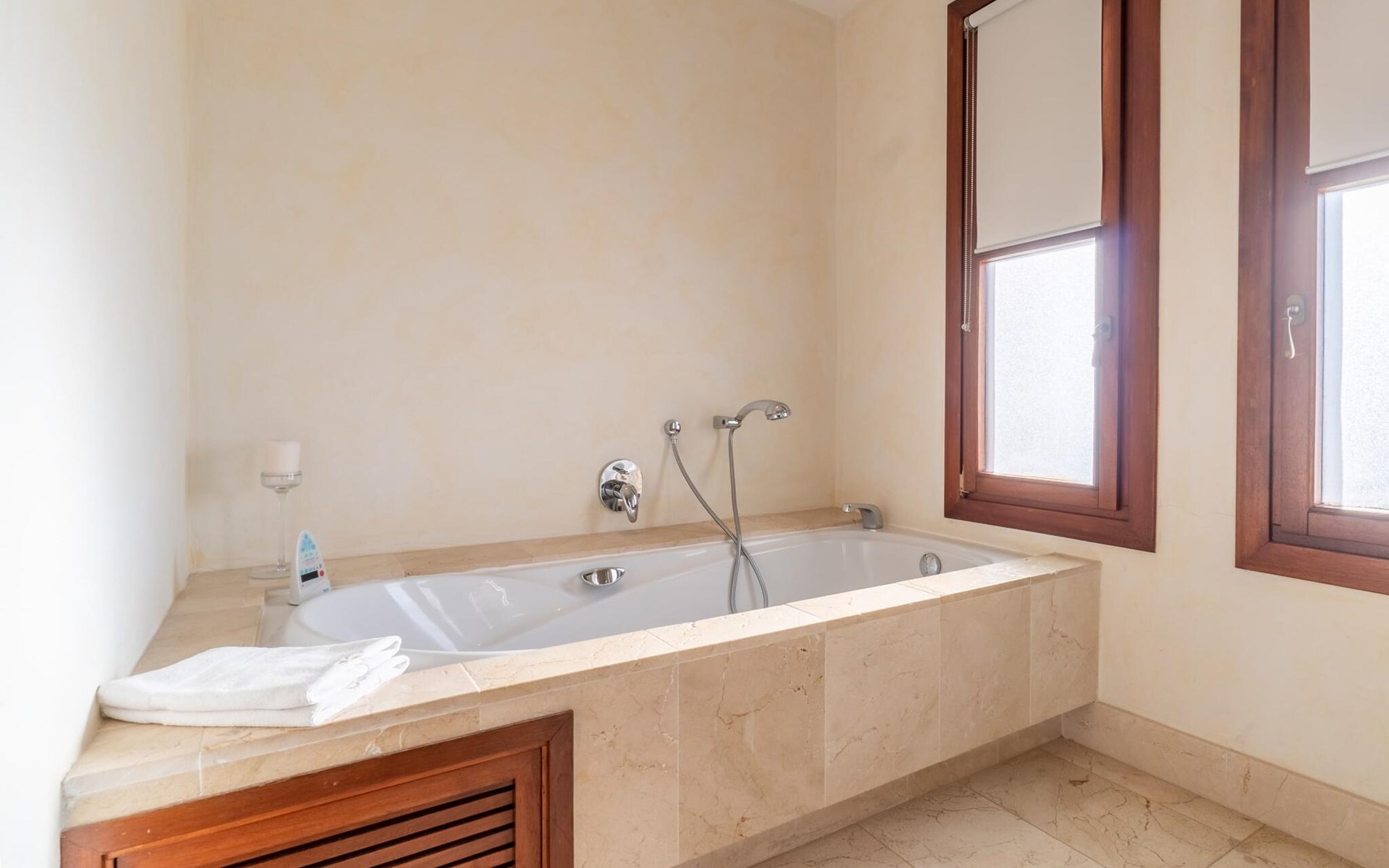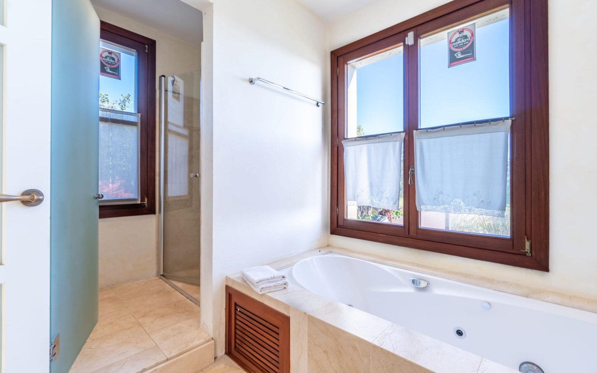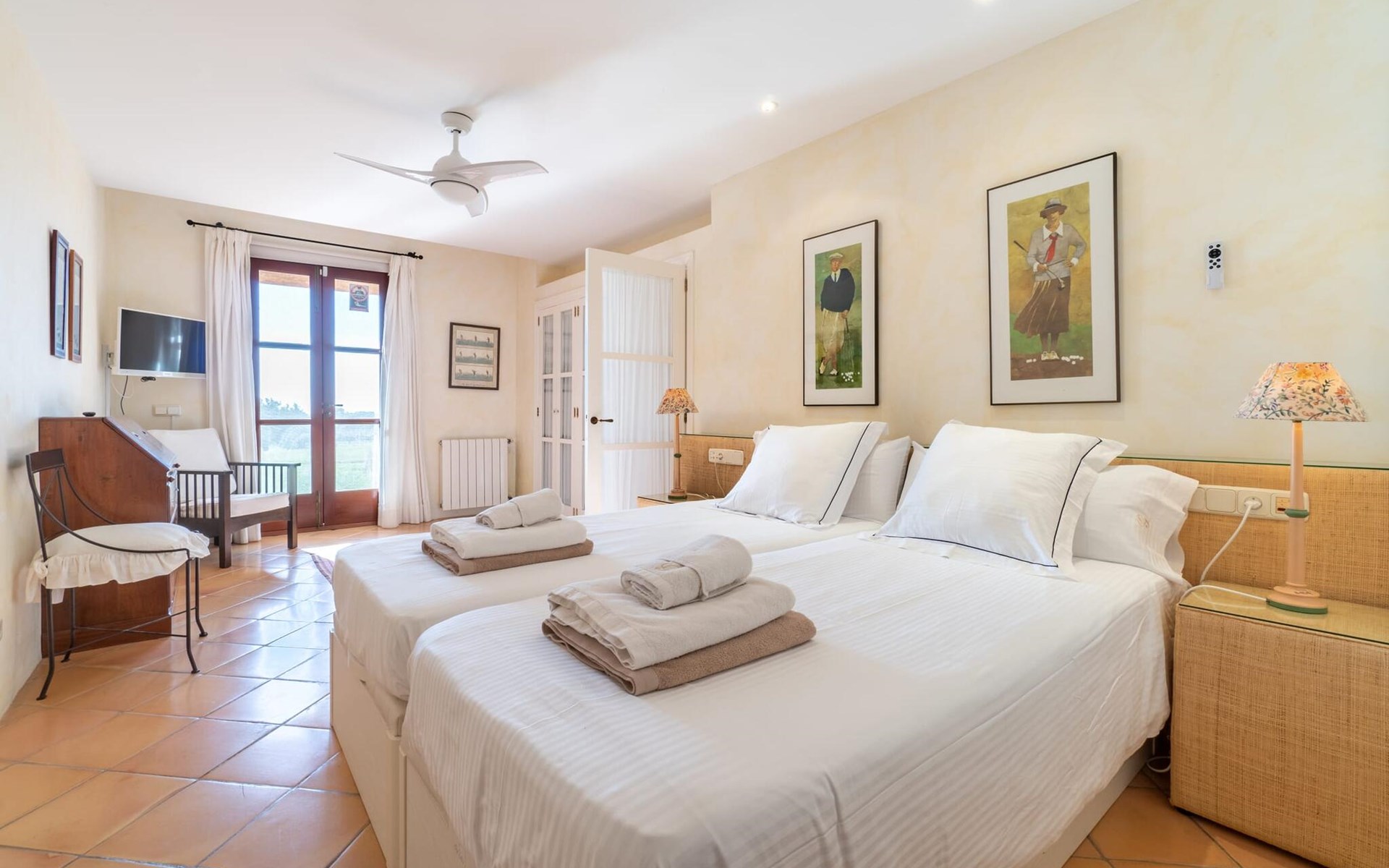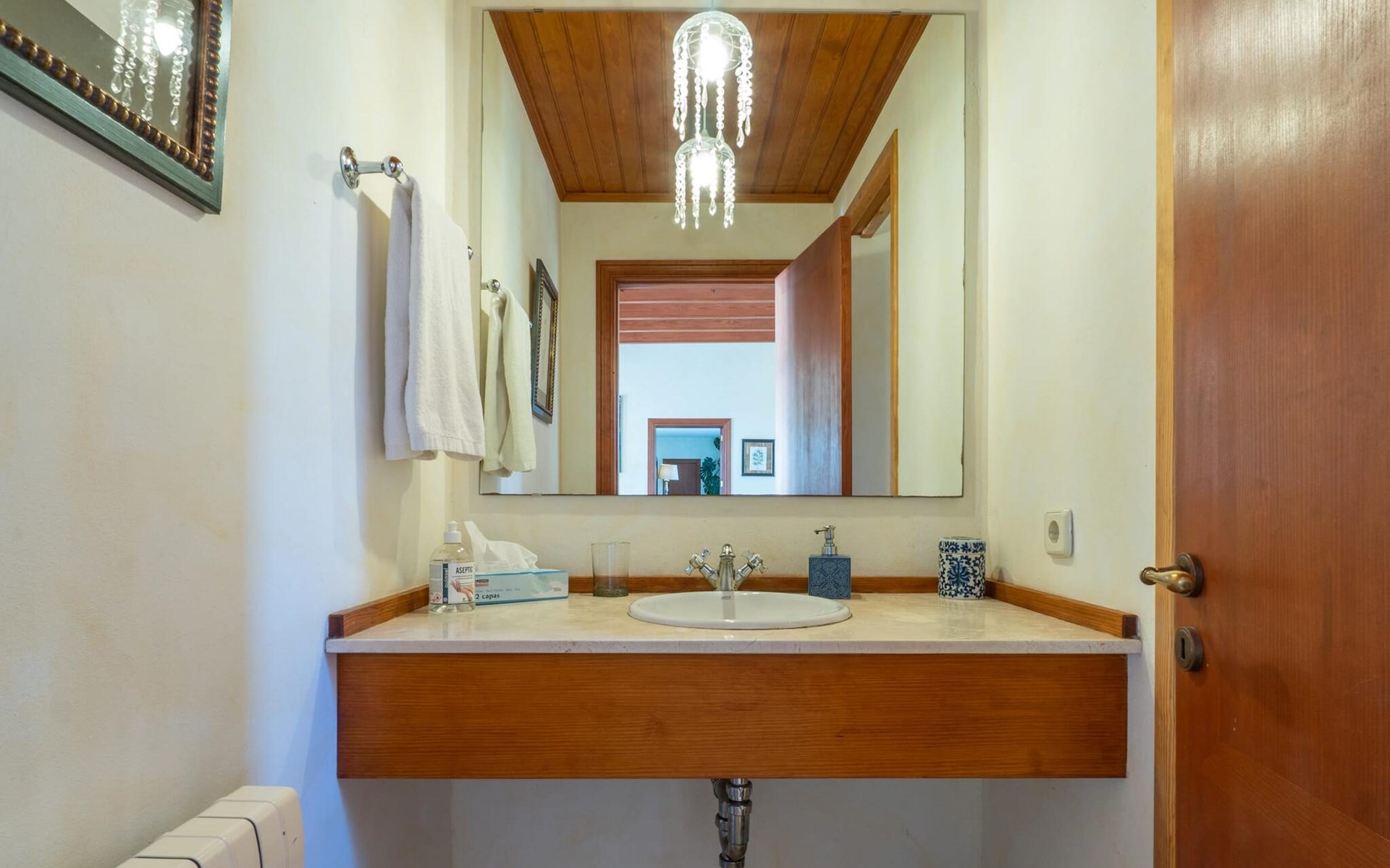 Beim Betreten des Hauses wird man von einer außergewöhnlich heimeligen Atmosphäre empfangen und von einem ästhetisch ansprechenden Wohnambiente umhüllt. Elegante Einzelstücke und hochwertige Materialien überraschen in einer sehr harmonischen Kombination. Ein großes Wohn-/Esszimmer bietet einen Esstisch für acht Personen, sowie eine äußerst gemütliche Sofaecke. Auch der Flachbildfernseher ist bequem im Wohnraum platziert. An kühleren Abenden kann man sogar beim Kaminlicht entspannen und an der Wärme eines Feuers sitzen. Die helle und freundlich gestaltete Küche ist komplett ausgestattet mit Kühlschrank, Backofen, Herd, Geschirrspüler, Toaster sowie Wasserkocher und Kaffeemaschine. Hier besteht zusätzlich die Möglichkeit, zu viert eine Mahlzeit einzunehmen. Zusätzliche Ess- und Wohnräume ergänzen die bisherige Beschreibung in vielerlei Hinsicht, so dass auch eine große Reisegruppe problemlos ihren ganz privaten Rückzugsort einnehmen kann. Die Schlafzimmer (alle fünf Doppelzimmer verfügen über ein eigenes Badezimmer, drei davon verfügen über eine Hydromassage-Badewanne) sind großzügig geschnitten, mit hochwertigen Möbeln ausgestattet und zeigen ein elegantes Design. Der Verzicht auf viele störende Accessoires verleiht diesen Räumen ein helles und raffiniertes Erscheinungsbild, das zweifellos dazu anregt, eine angenehme Ruhe zu suchen. Auch in den Schlafzimmern kommt das geschmackvolle Design voll zur Geltung. Diese präsentieren sich in einem hochmodernen Stil, sind sehr funktional und großzügig geschnitten.