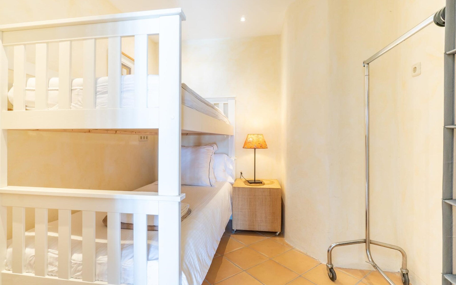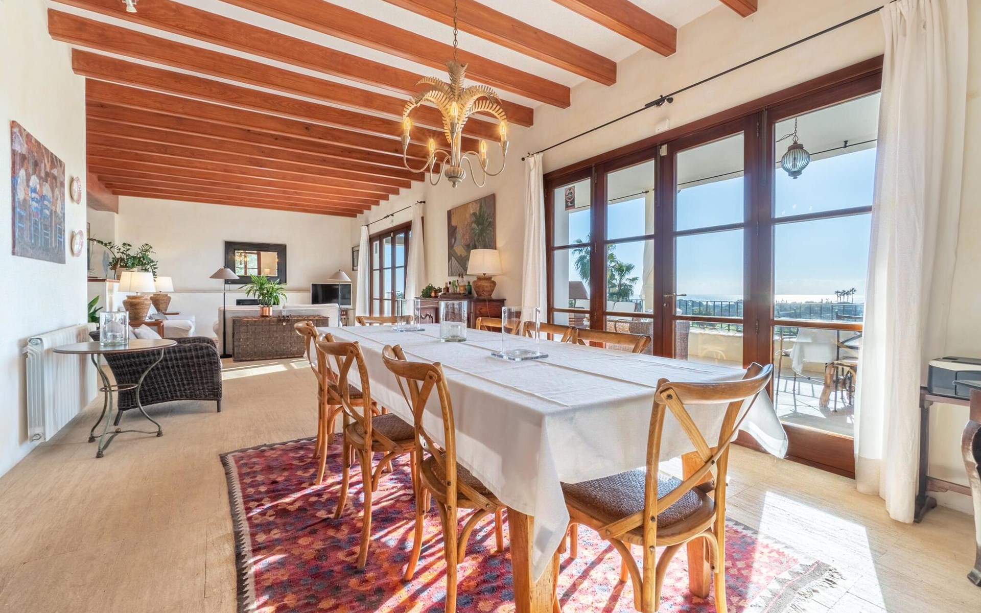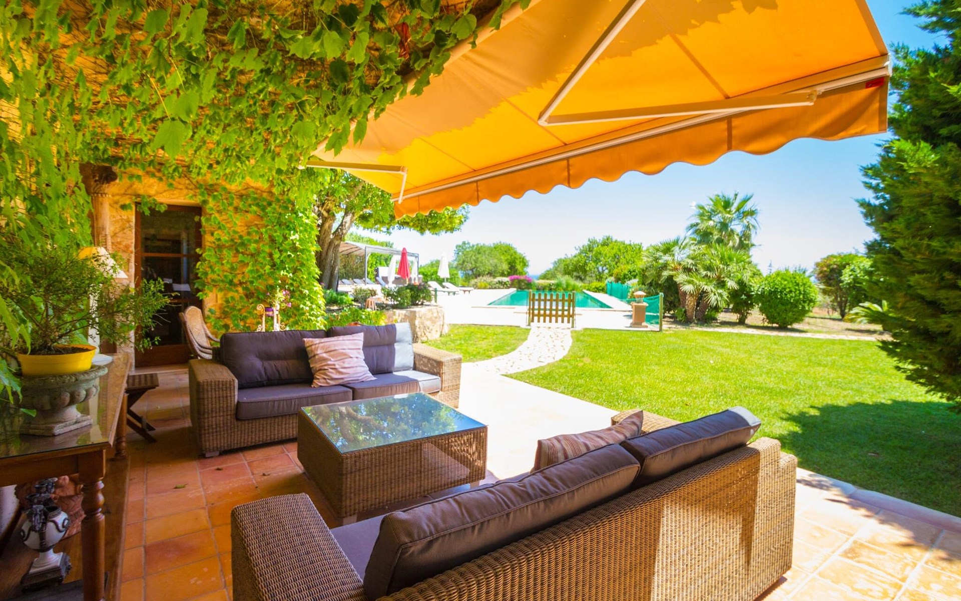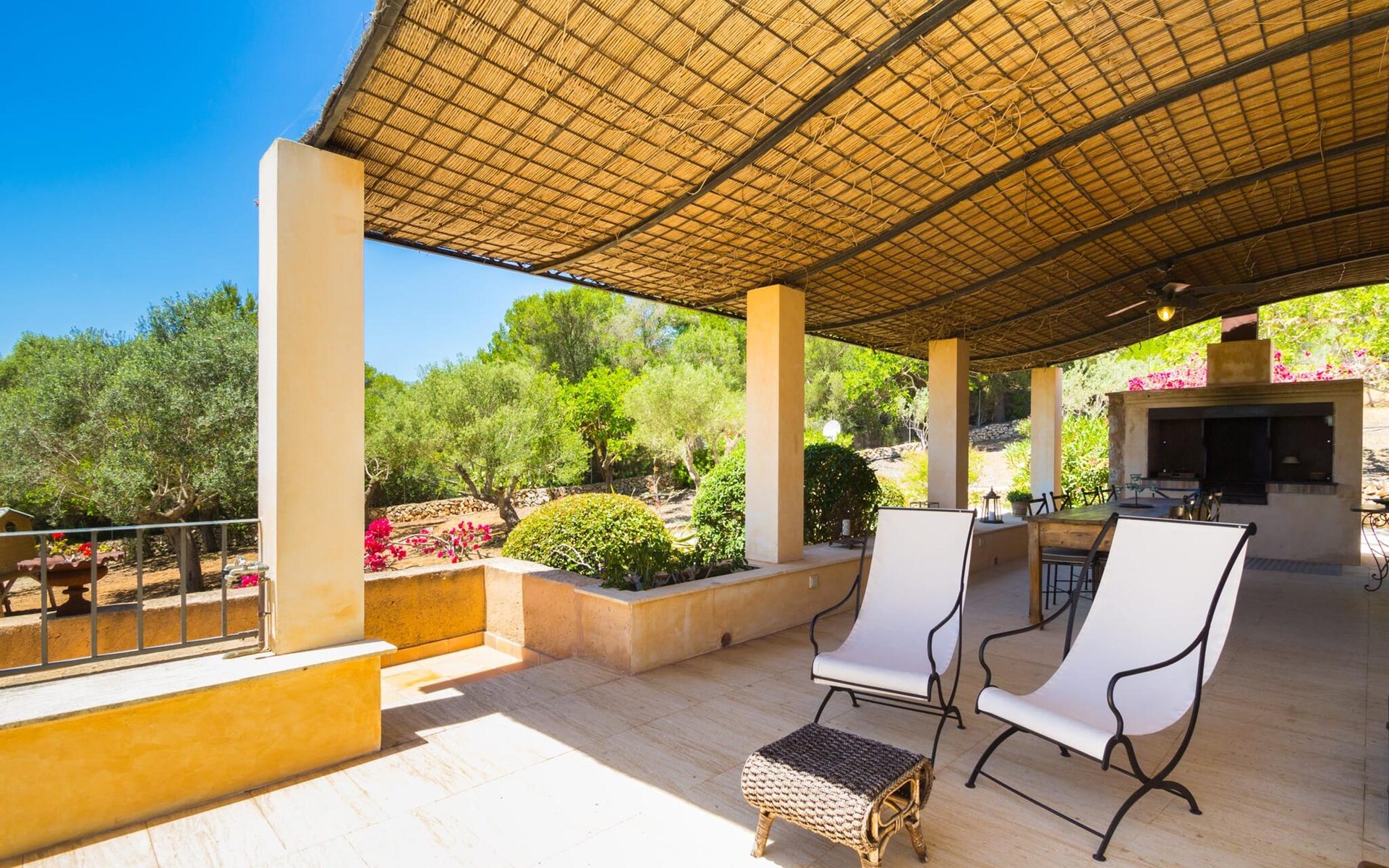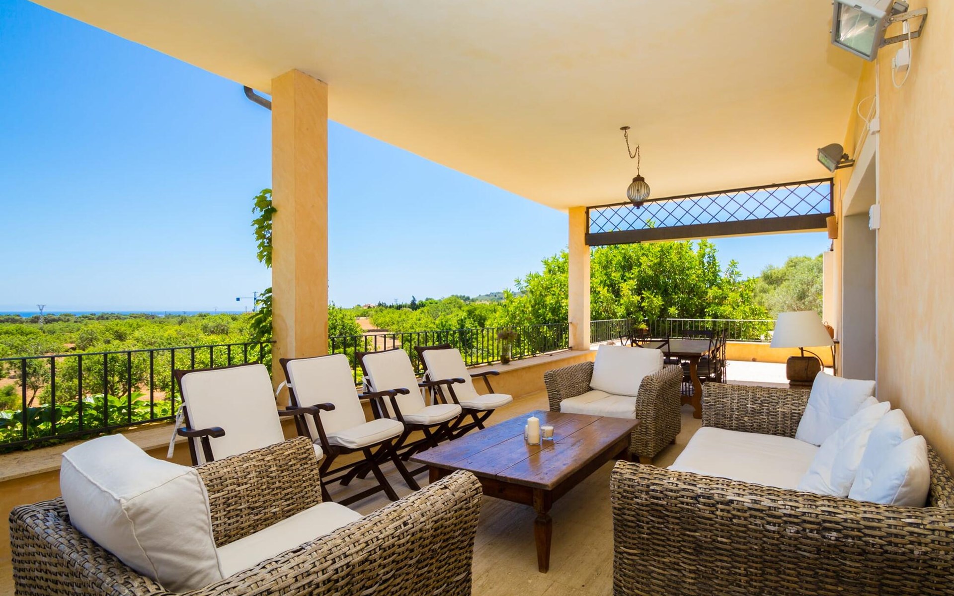 Die gelb gestrichene Fassade, das grüne Efeu und die Markise zaubern ein wunderbares Licht und eine sehr angenehme Atmosphäre. Von einer Hausecke aus gelangt man auf eine weitere Terrasse mit einer großen Fertigrasenfläche, die sicherlich zum Spielplatz für die eventuell mitreisenden Kinder wird. Mehrere himmelwärts gerichtete Stufen führen zum großen Balkon, der eine vielfältige Möbelauswahl für die unterschiedlichsten Ansprüche beherbergt. Hier finden Sie einen großen Esstisch neben einer weiteren Chill-Out-Zone mit verschiedenen modernen Sitzgruppen, die alle eines gemeinsam haben: einen fantastischen Weitblick bis zum Meer. Aber es gibt noch mehr. Auf der umzäunten Seite des Hauses gibt es einen angrenzenden Bereich mit einem eingebauten Grill an der Vorderseite und einem riesigen Massivholztisch davor. Warum nicht mit Freunden zusammenkommen und einen schönen Grillabend verbringen?