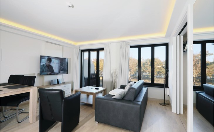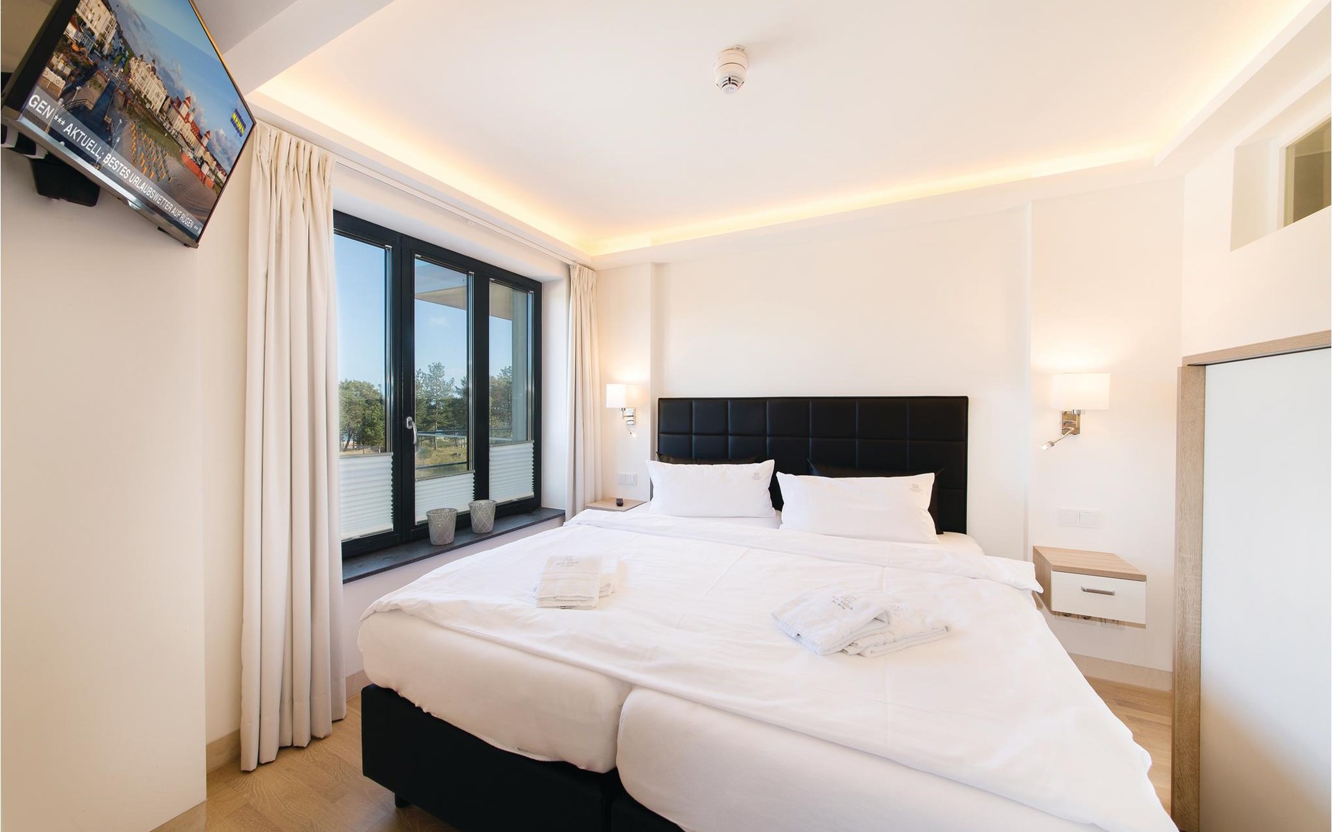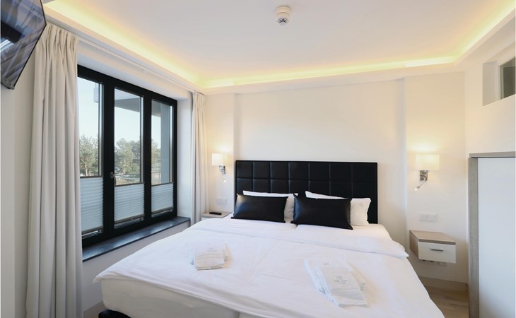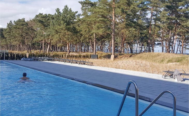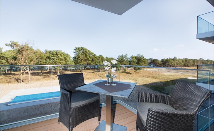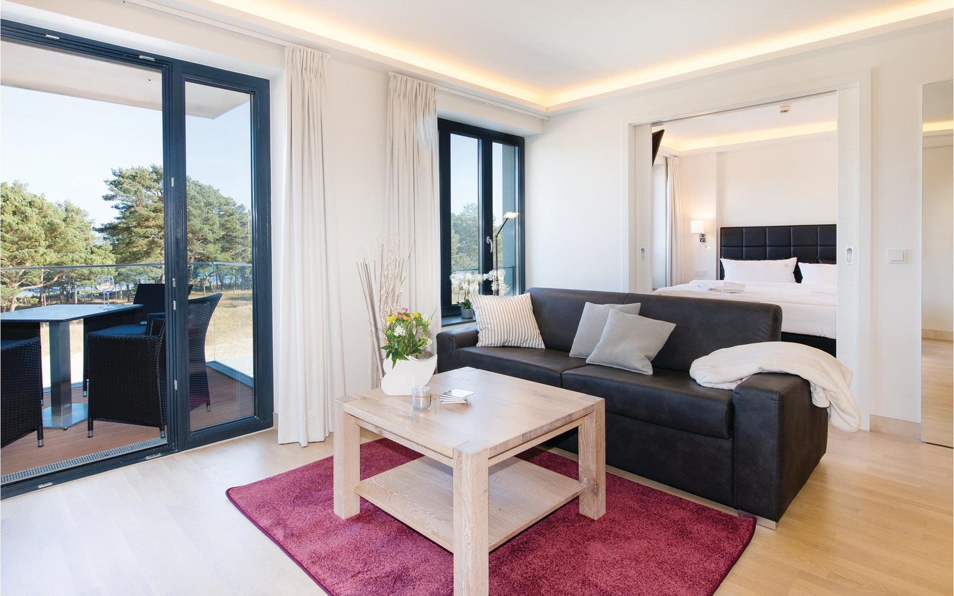 Auf über 40m2 finden Sie hier alle Annehmlichkeiten. Der großzügige, offene Wohnbereich ist dank der großen Fensterfronten lichtdurchflutet, der Blick öffnet sich und kann über den kleinen Kiefernwald bis hin zum türkisen Wasser der Ostsee schweifen. Vom Wohnbereich aus erreichen Sie den Balkon mit hochwertigen Gartenmöbeln. Entspannung pur! Der separate Schlafbereich ist durch eine moderne Schiebetür vom Wohnraum getrennt. Das Sofa im Wohnbereich kann in zwei weitere komfortable Schlafplätze umgewandelt werden.