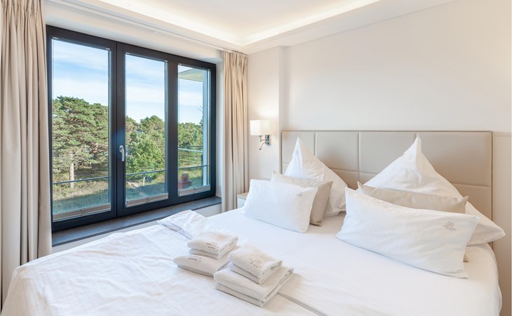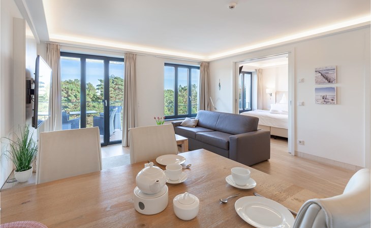 Auf über 40m2 finden Sie hier alle Annehmlichkeiten. Der großzügige, offene Wohnbereich ist dank der großen Fensterfronten lichtdurchflutet, der Blick öffnet sich und kann über den kleinen Kiefernwald bis hin zum türkisen Wasser der Ostsee schweifen. Vom Wohnbereich aus erreichen Sie den Balkon mit hochwertigen Gartenmöbeln. Entspannung pur! Der separate Schlafbereich ist durch eine moderne Schiebetür vom Wohnraum getrennt. Das Sofa im Wohnbereich kann in zwei weitere komfortable Schlafplätze umgewandelt werden.