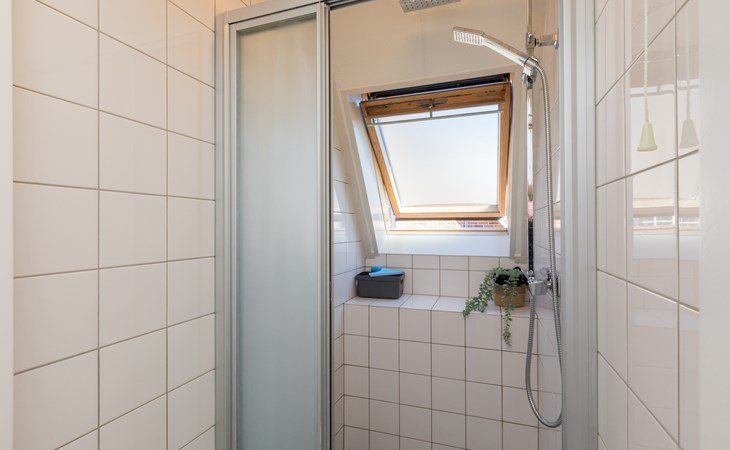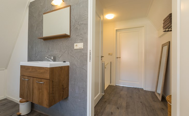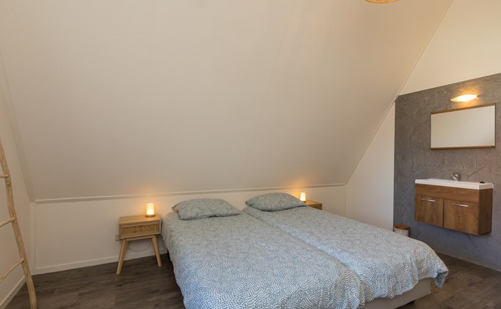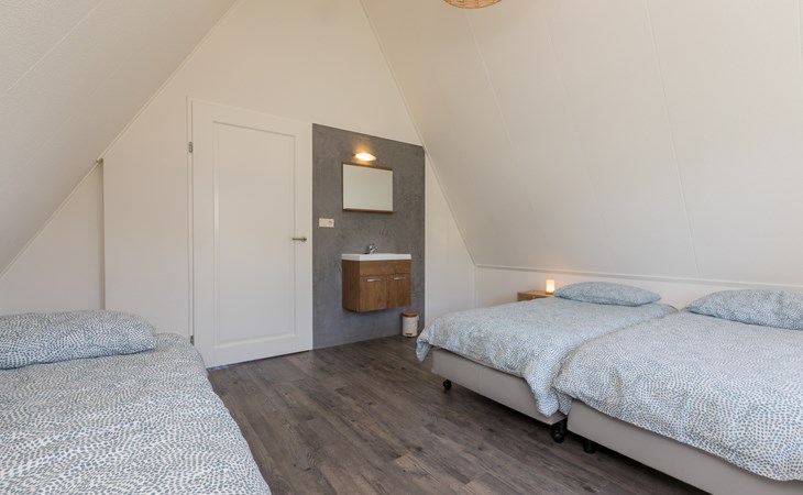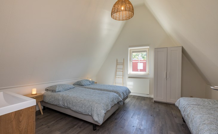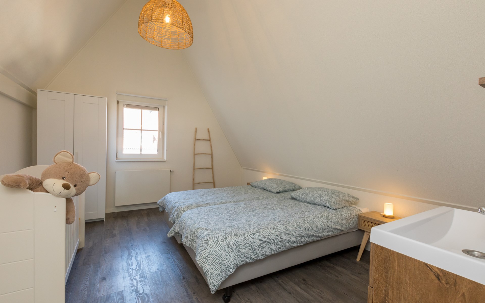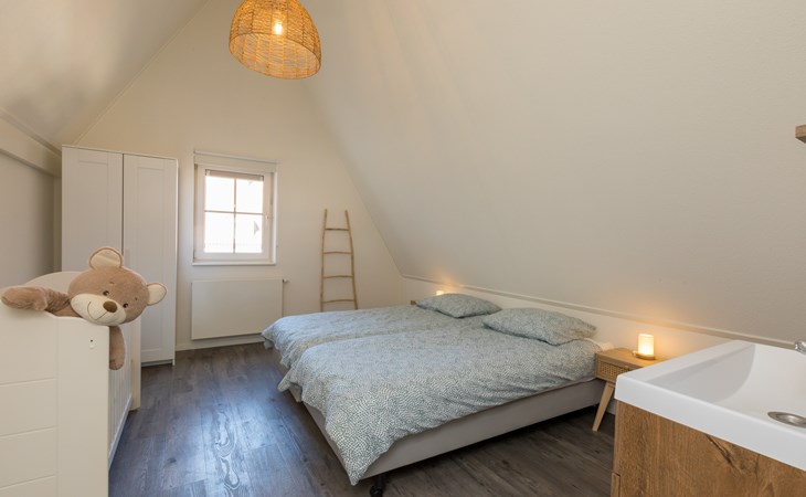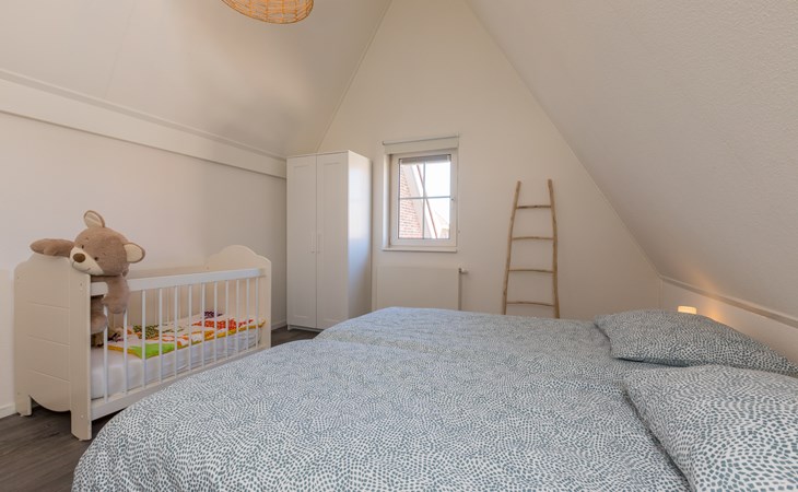 Im Obergeschoss befinden sich zwei Schlafzimmer. Beide sind mit Verdunkelungsvorhängen, einem Waschbecken und einem Badezimmerschrank ausgestattet. Im ersten Schlafzimmer sind zwei Einzelbetten (90 x 200 cm) und ein Kinderbett (60 x 120 cm) vorhanden. Im zweiten Schlafzimmer stehen drei Einzelbetten (90 x 200 cm). Das Badezimmer verfügt über eine Duschkabine. In dieser Ferienwohnung sind keine Haustiere erlaubt. Für die kleinsten Besucher gibt es ein Treppengitter und einen Hochstuhl. Zur Unterkunft gehört 1 Parkplatz.