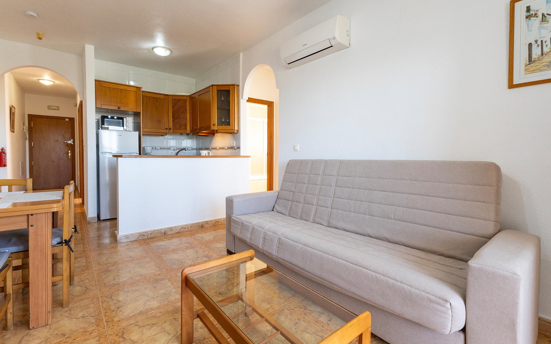Willkommen in dieser hellen und geschmackvoll eingerichteten Ferienwohnung an der Costa Blanca, die Sie zu erholsamen Tagen am Mittelmeer einlädt. Bereiten Sie in der offenen Küche Ihre Lieblingsmahlzeiten zu, nehmen Sie am einladenden Esstisch Platz und entspannen Sie nach einem erlebnisreichen Tag mit einem Brettspiel auf dem Sofa oder vertiefen Sie sich in ein gutes Buch.