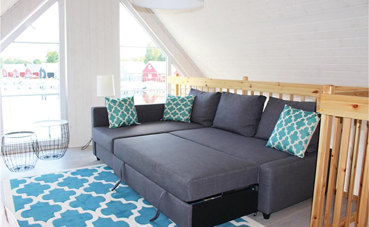 Dank der galerieartig angelegten ersten Etage und der riesigen Panoramafenster, die sich vom Boden bis zum Dach erstrecken, ist das Haus besonders hell und freundlich. Der Blick fällt immer wieder und von überall her auf die bezaubernde Landschaft, das Wasser und das bunte Treiben rundum.