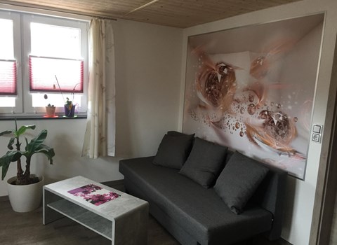 Die ca. 50 qm große Wohnung für 2 Erwachsene und 1 Kind (10 Jahre) erstreckt sich über zwei Etagen. Im unteren Bereich befindet sich das Wohnzimmer (Kaminofen inkl. Kaminholz, Couch, Flachbild-TV, Radio/ CD-Player), eine offene Küchenzeile (Kochplatten, Kühlschrank mit Tiefkühlteil), das Bad mit Dusche/WC sowie ein möblierter Wintergarten (Essecke). Über eine Treppe ist der offene Schlafbereich (1 x Doppelbett, 1 x Polsterliege 0,70 breit) im Obergeschoss erreichbar. Ein Kinderbett sowie Hochstuhl kann auf Anfrage zur Verfügung gestellt werden.