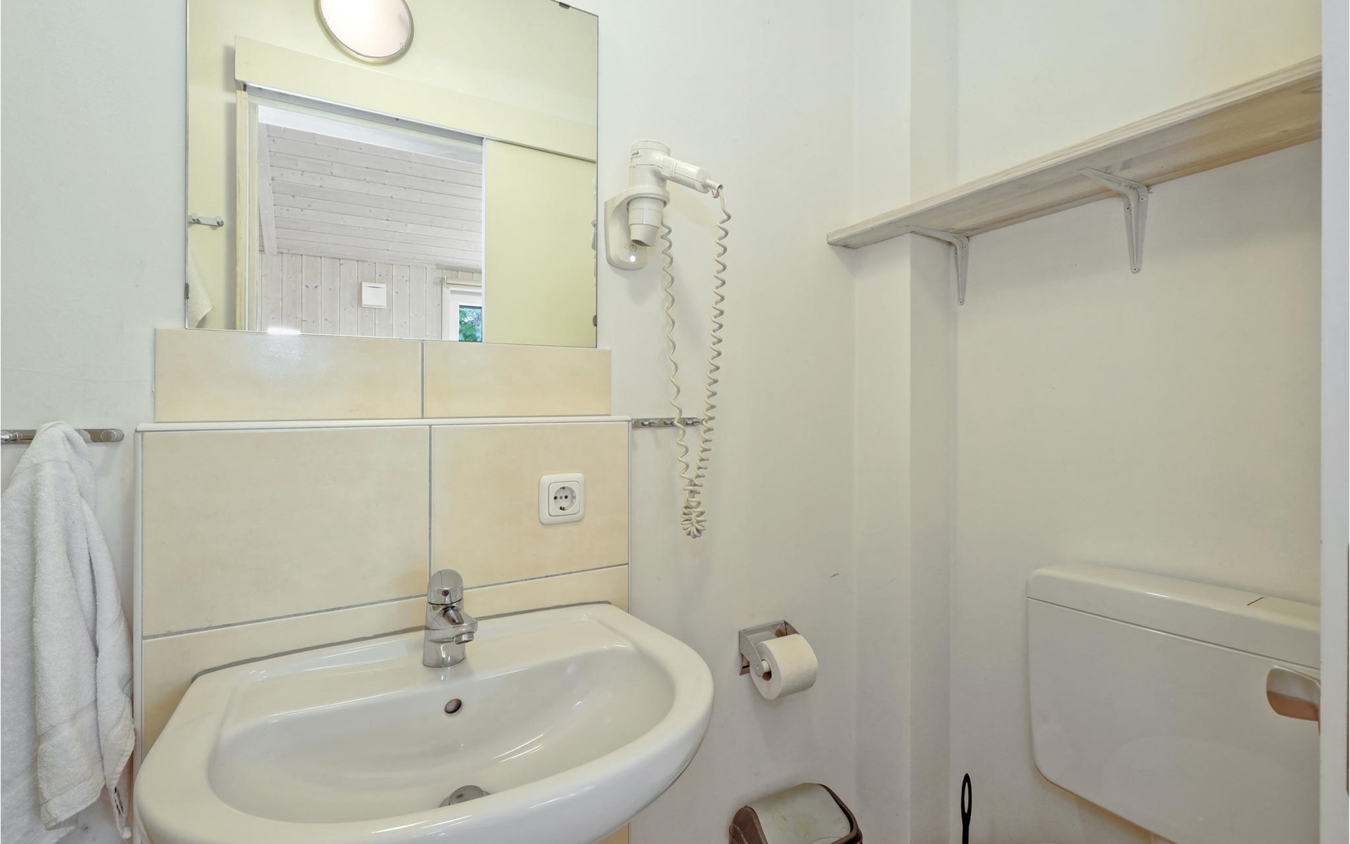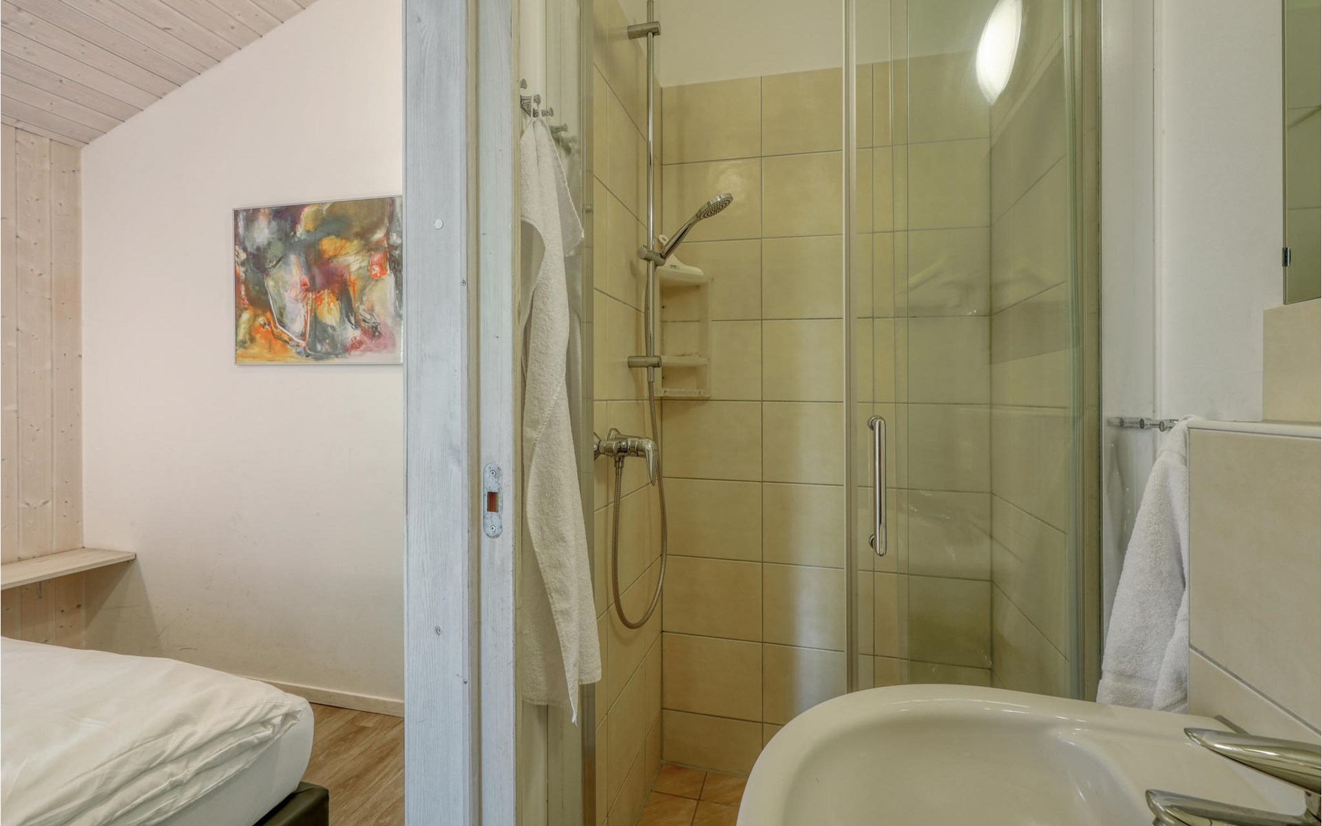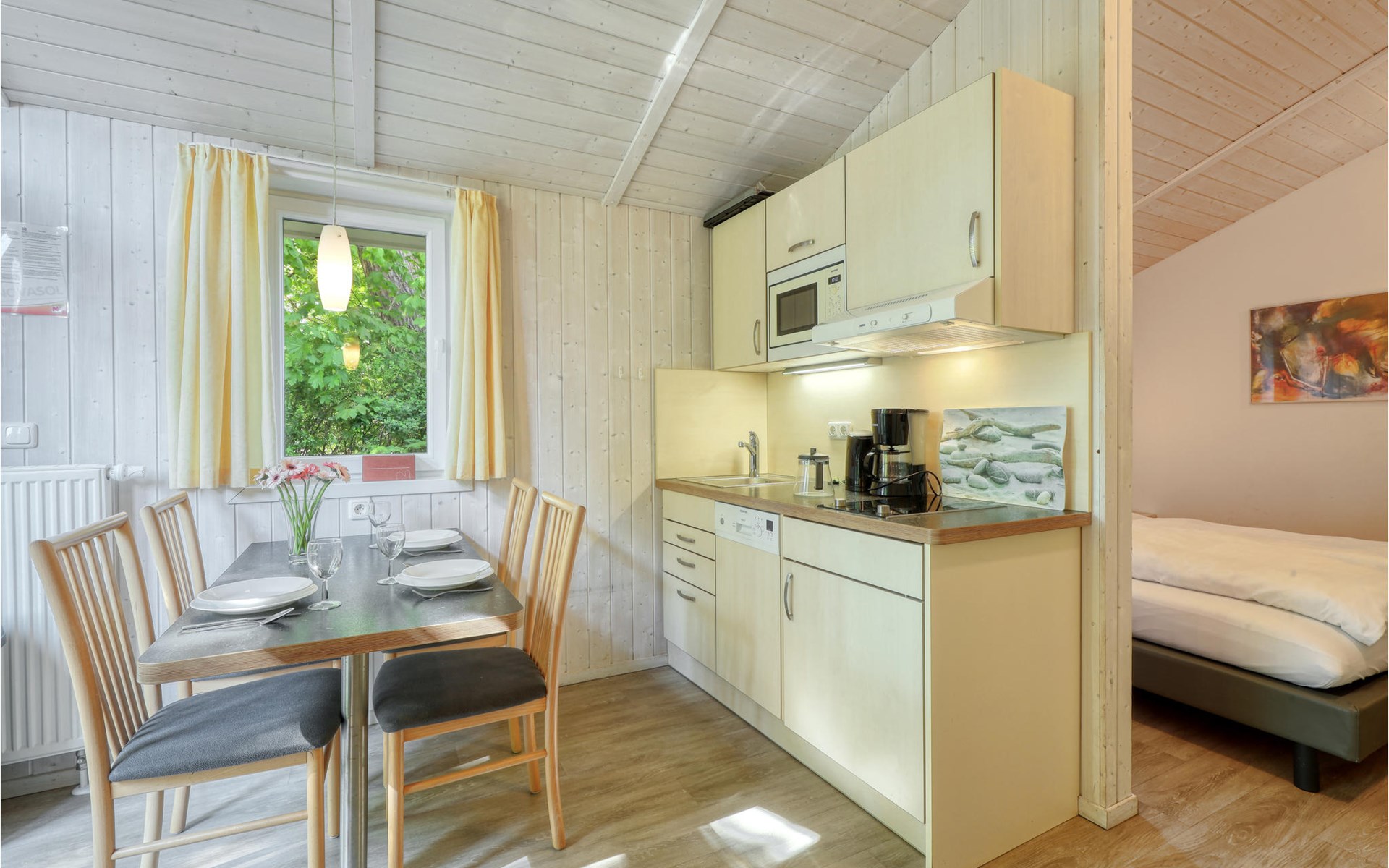 Mit 28 m² ist es besonders gut für den Urlaub zu zweit geeignet. Bei Bedarf finden zwei weitere Gäste Platz auf dem Schlafsofa im Wohnbereich. Auf Anfrage lässt sich auch ein Kinderbett zustellen. Bitte beachten Sie, dass zwischen Schlaf- und Wohnbereich keine Tür, sondern ein offener Durchgang ist.