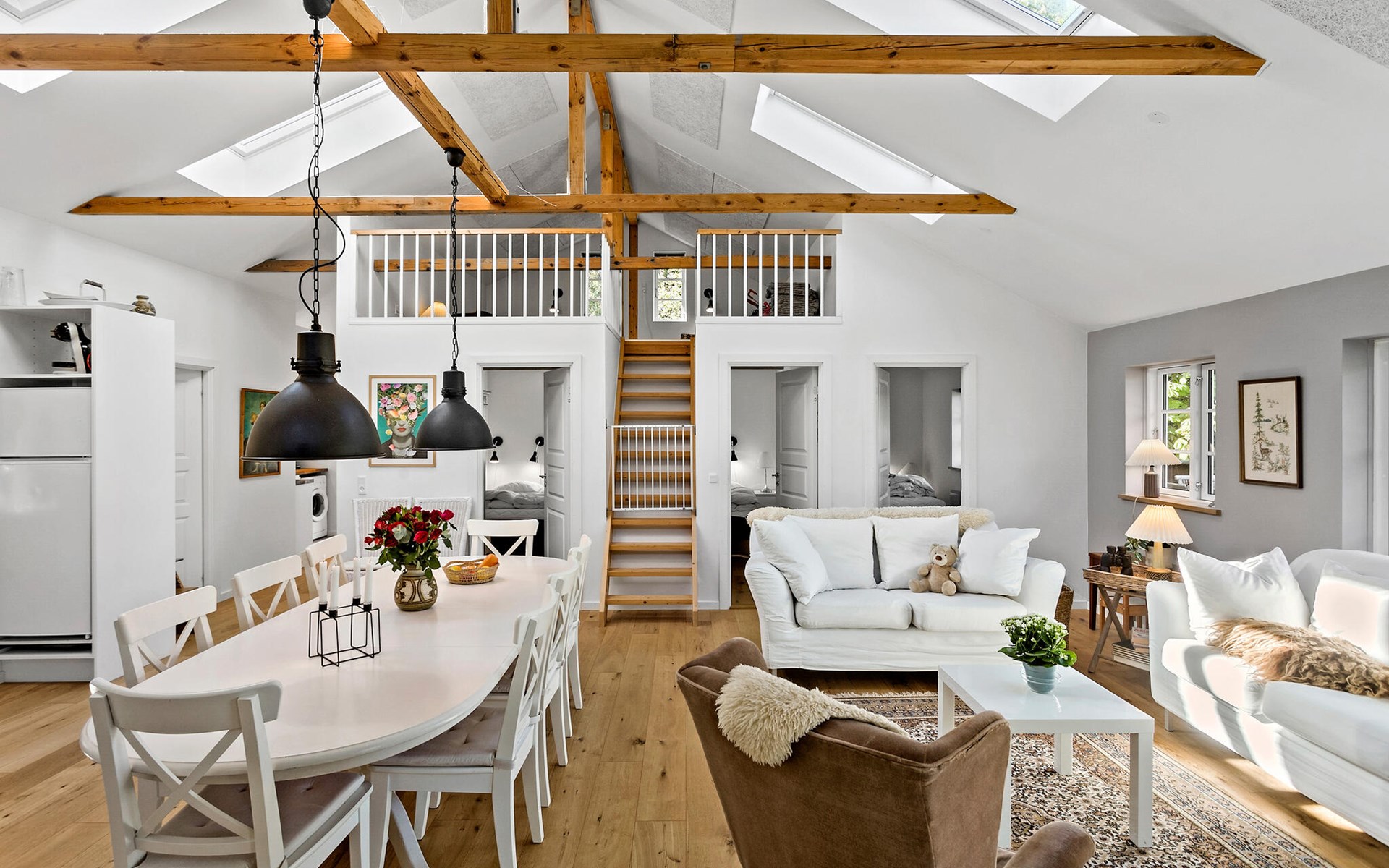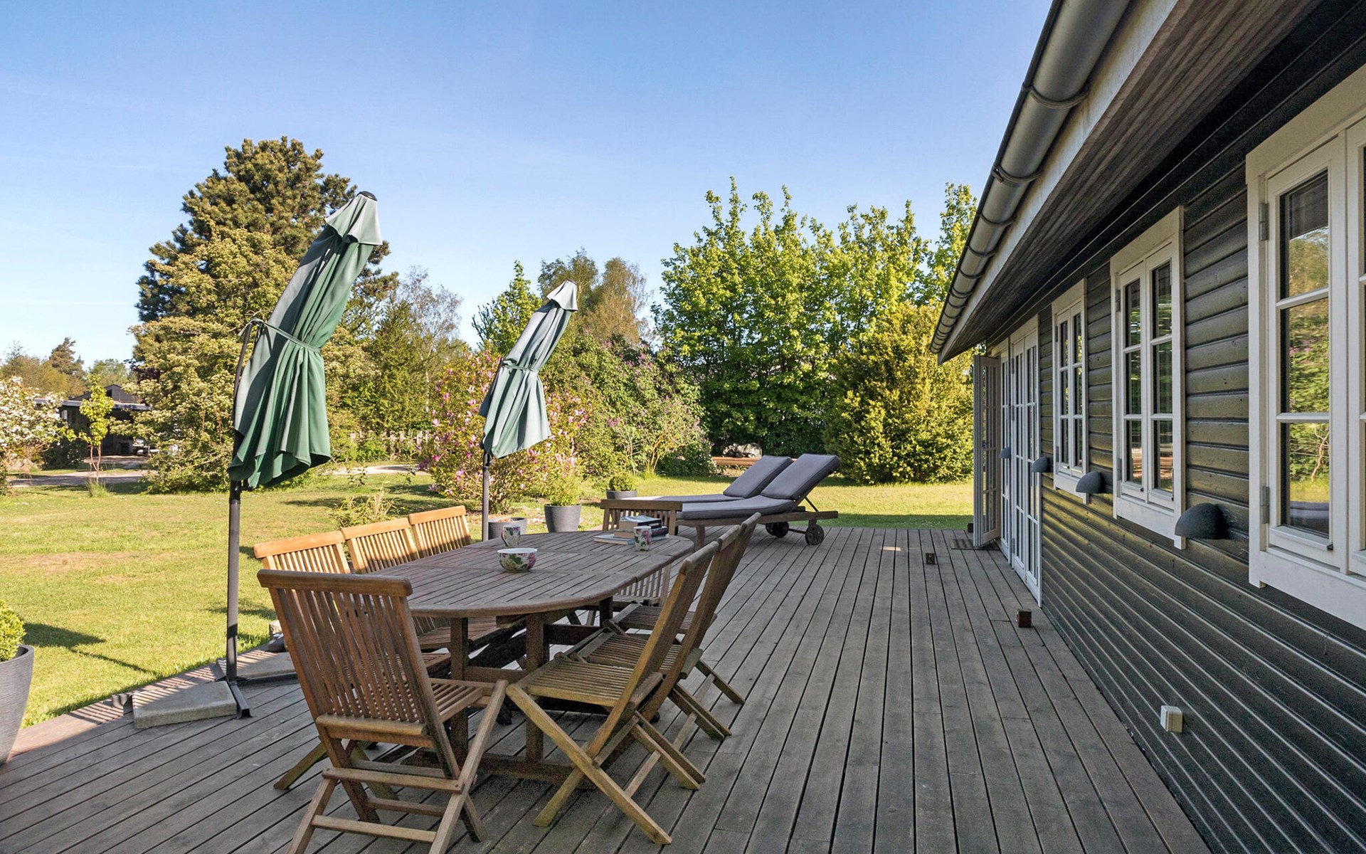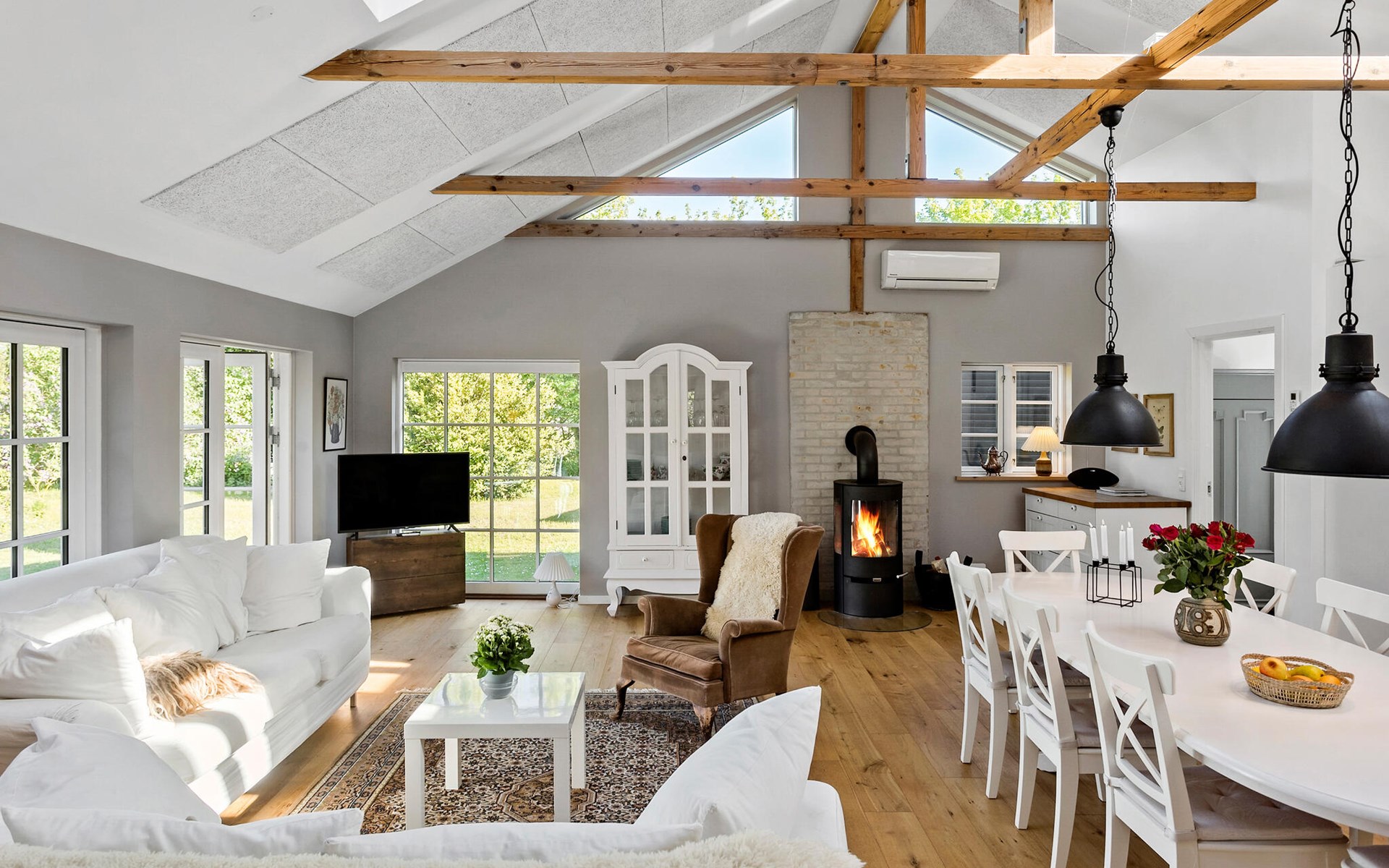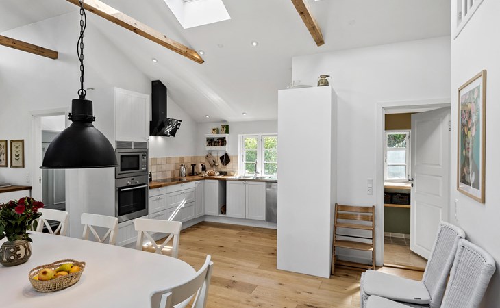 Dieses stilvolle und komfortable Ferienhaus bietet Ihnen und Ihrer Familie die Möglichkeit, eine wohlverdiente Auszeit zu genießen. Beginnen Sie Ihren Tag mit einem ausgiebigen Frühstück am Esstisch oder auf der sonnigen Terrasse, wo Sie die frische Luft und den Blick ins Grüne genießen können. Der großzügige Wohnbereich mit den stimmungsvollen Holzbalken an der Decke und den großen Fensterfronten lässt viel Licht herein und bietet einen herrlichen Blick auf den weitläufigen Garten. Machen Sie es sich auf den gemütlichen Sofas bequem und entspannen Sie mit einem guten Film oder einem spannenden Buch.