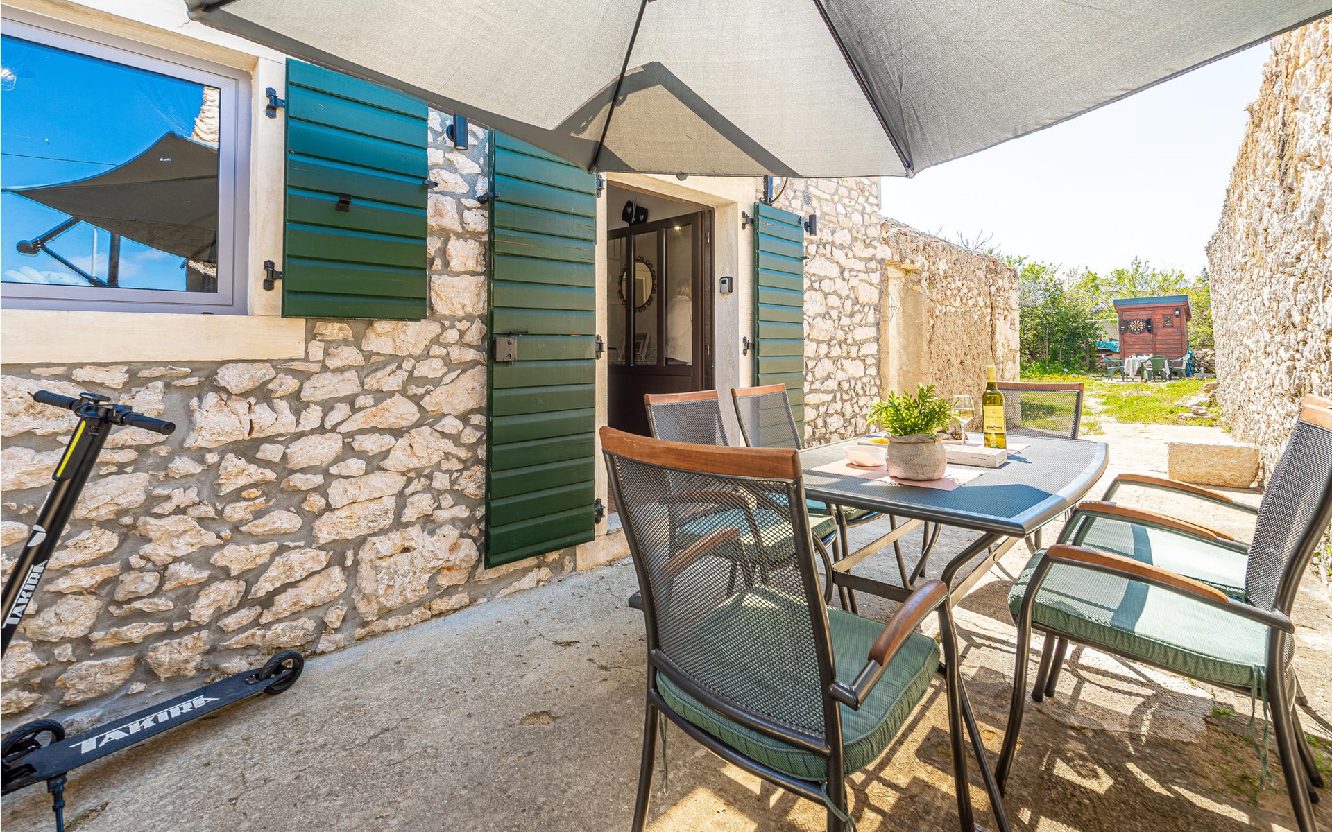 Neben dem Haus befindet sich ein kleiner Garten mit Sitzgelegenheit und Grill für die Gäste, für die es außerdem auch 2 Elektroroller gibt, auf denen Sie die Gegend erkunden können.