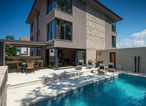 Villa Perlin ist ein modernes und luxuriöses Ferienhaus mit Pool am Rande des Dorfes Farini, etwa 10 km vom Meer entfernt.