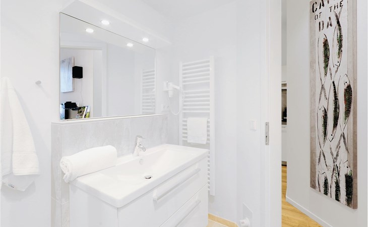 Im Wohnbereich können Sie es sich vor dem wohligen Licht des Bio-Ethanol-Kamins gemütlich machen. Das moderne Entertainmentsystem mit Blu-Ray-Player, Musikanlage mit MP3-Anschluss sowie 2 Flachbildfernsehern sorgt für ausreichend Unterhaltung. Im Wohnbereich befindet sich außerdem das Schlafsofa, welches zwei weitere Schlafplätze bietet. Alle Zimmer sind durch die bodentiefen Fenster hell und lichtdurchflutet und im skandinavischen Stil eingerichtet.
