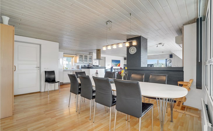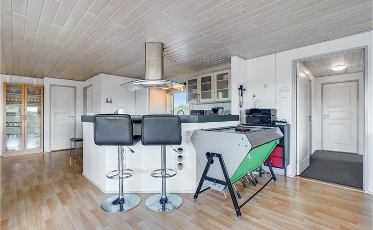 Im Wohnraum stehen Spiele, eine PS4 und ein Smart TV und ein Kaminofen. Vom großen Küchen- und Speisebereich haben Sie den Pool im Auge.