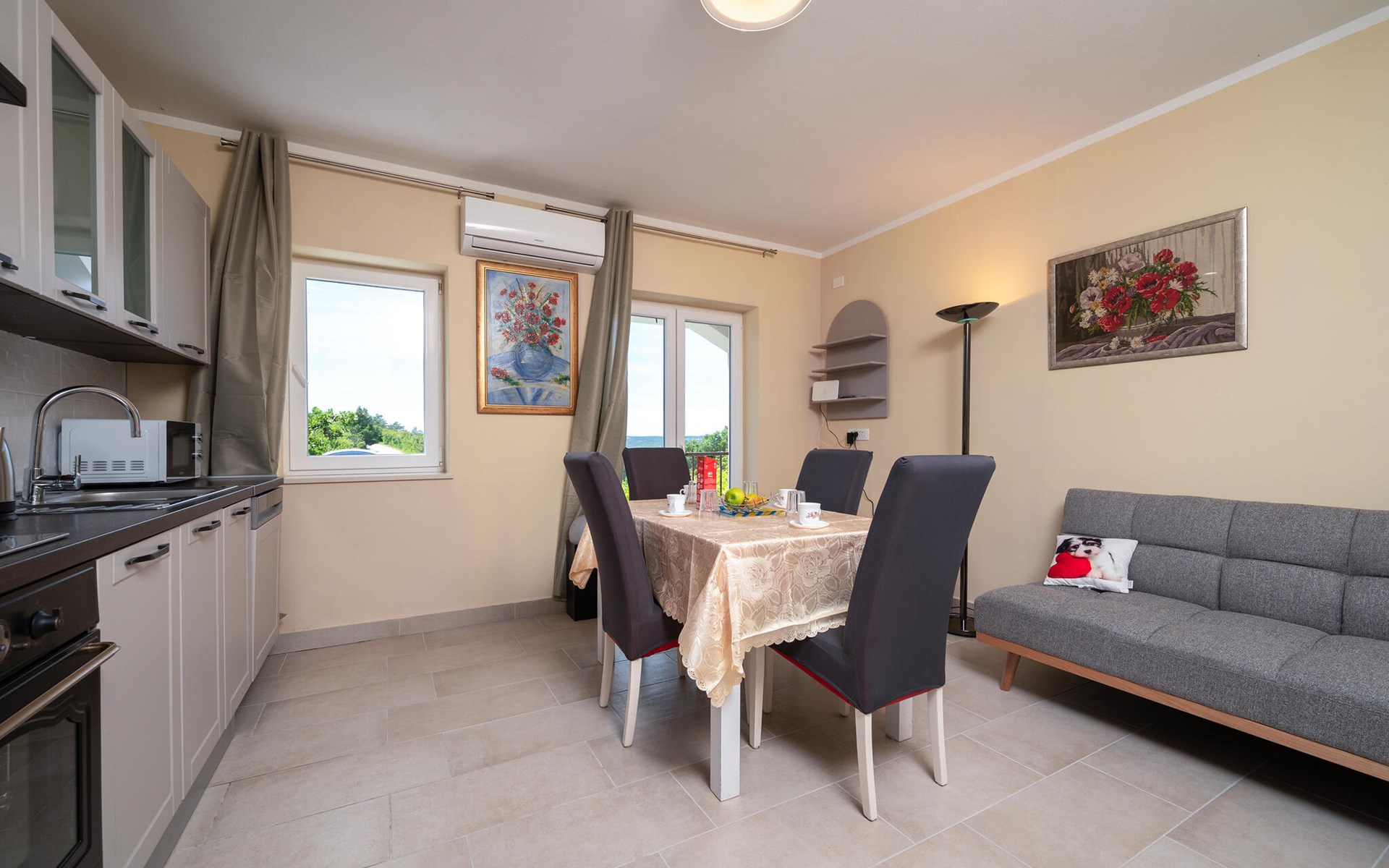 Gemeinsam mit Ihren Liebsten können Sie in dieser hellen und behaglichen Ferienwohnung erholsame Tage verbringen und einen schönen Blick auf die grüne Umgebung genießen. Freuen Sie sich auf geselliges Kochen in der offenen Küche und harmonische Mahlzeiten in der angenehmen Wohnatmosphäre. Lassen Sie einen langen Tag mit einem Kartenspiel ausklingen oder machen Sie es sich mit einem guten Buch auf dem Sofa gemütlich.