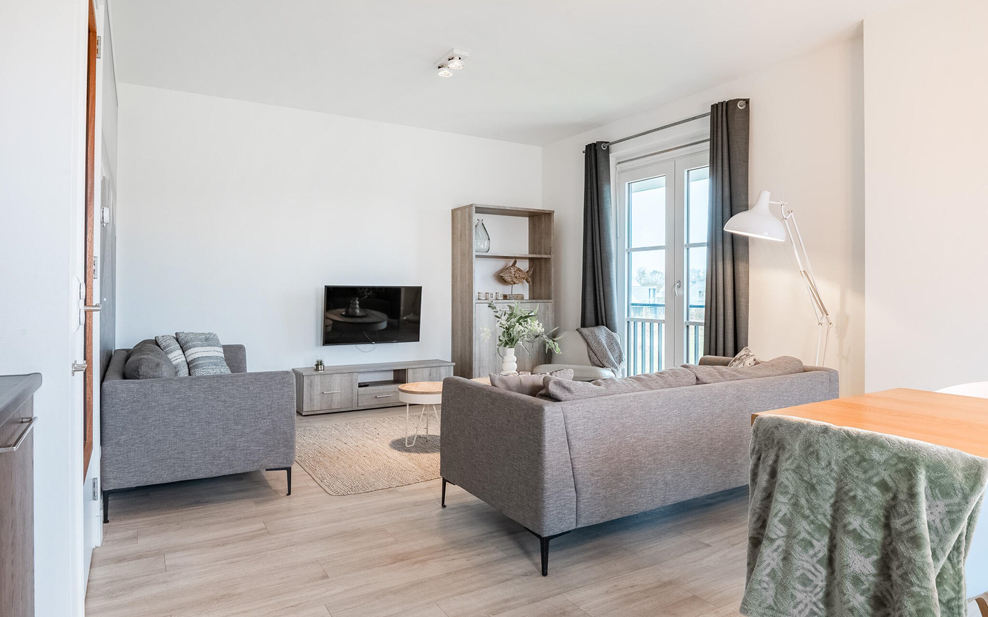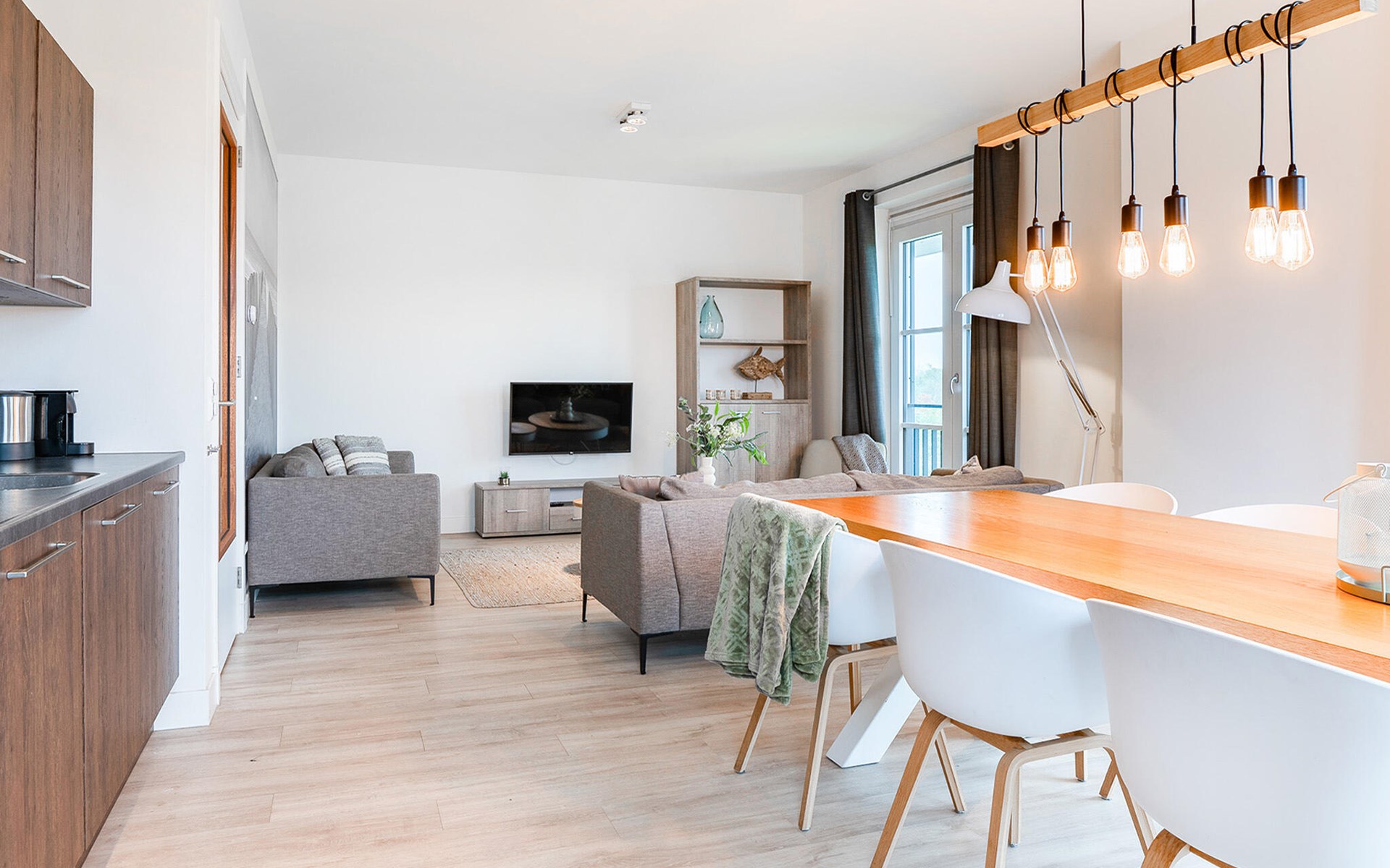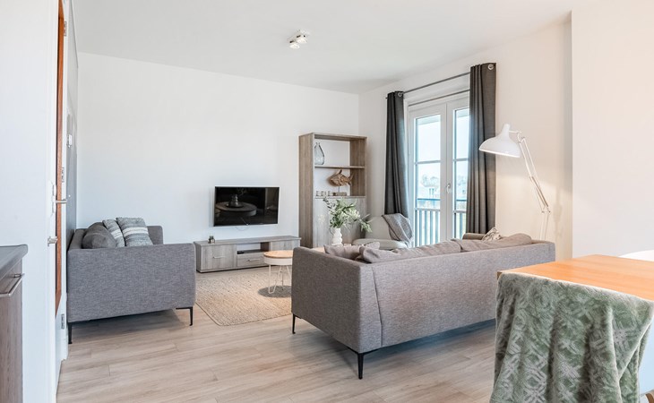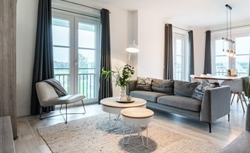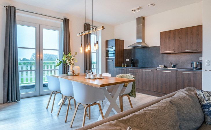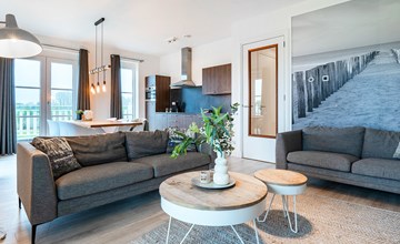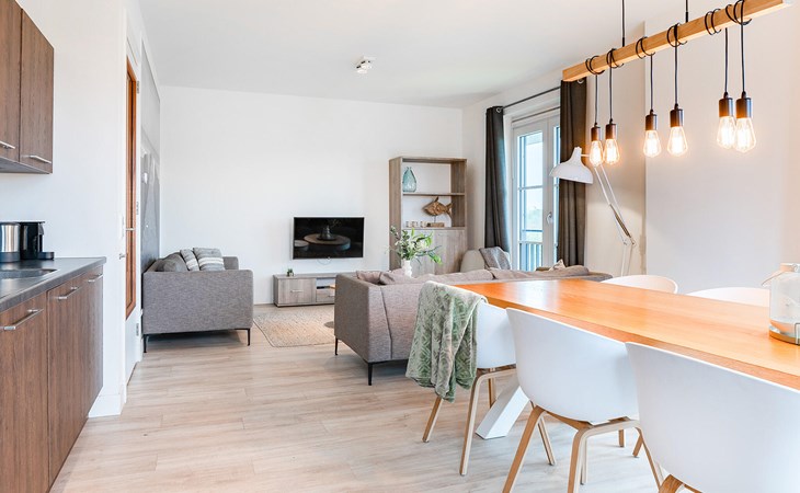 Diese moderne und luxuriöse Ferienwohnung in einem eleganten Apartmenthaus bietet Ihnen den perfekten Ort, um die Seele baumeln zu lassen. Die stilvolle Einrichtung und das helle, maritime Ambiente schaffen eine ruhige und einladende Atmosphäre. Hier haben Sie viel Platz, um sich mit Ihrer Familie oder Freunden wohlzufühlen. Kommen Sie im offenen Wohnraum zusammen, der die Küche sowie den Ess- und Wohnbereich gelungen miteinander verbindet und Sie zum gemeinsamen Kochen, Essen oder Ausruhen einlädt.