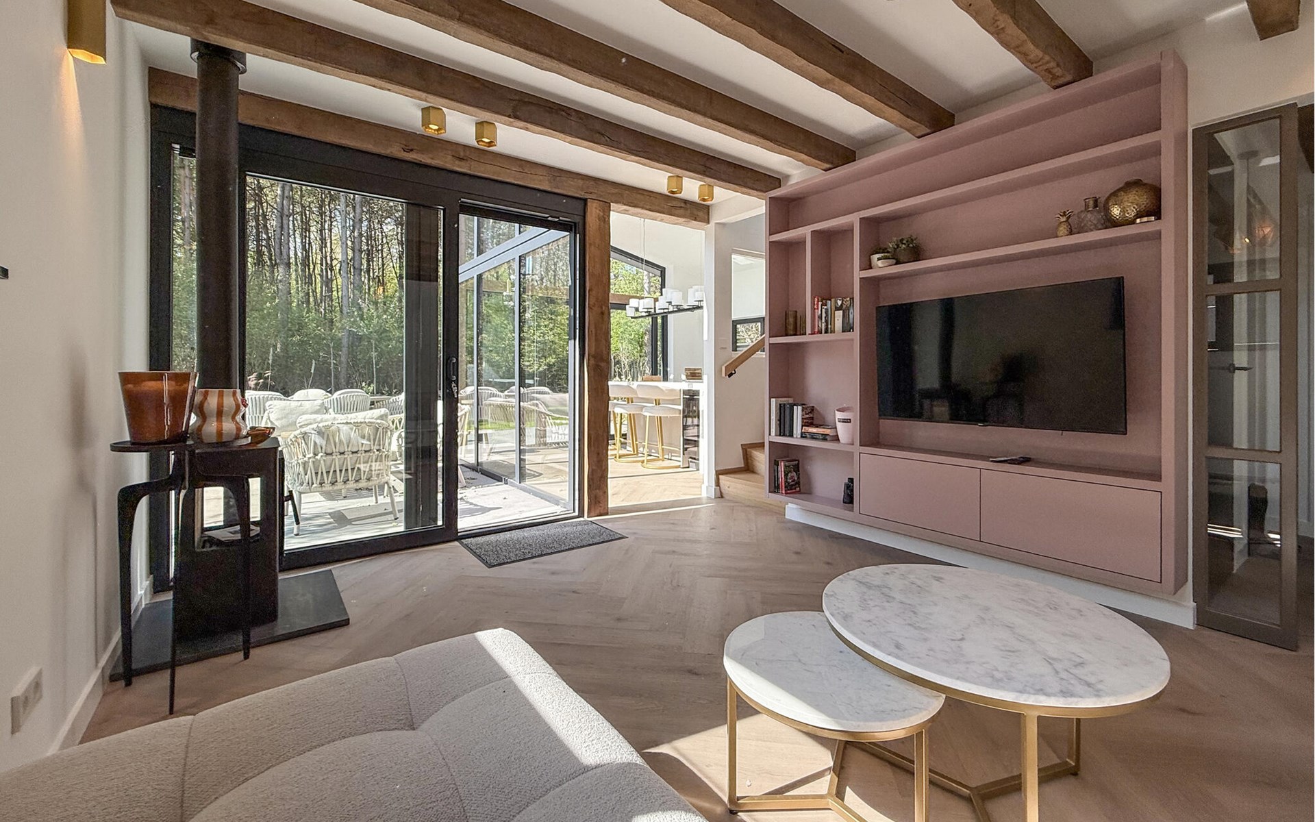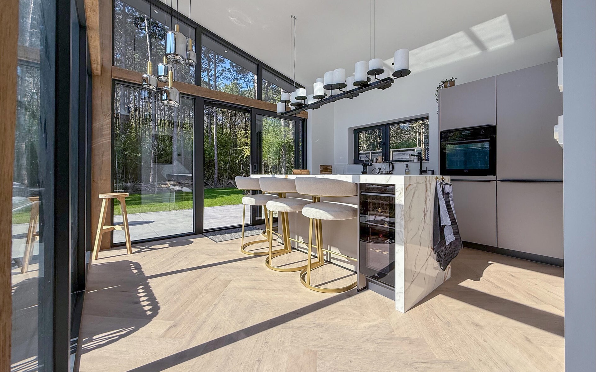 Ihr Ferienhaus überzeugt durch viel Komfort und seine ruhige Lage am Waldrand. Der helle Wohnbereich ist mit einem eleganten Ecksofa, Fernseher und Kaminofen ausgestattet. Entspannen Sie bei einem Film oder lesen Sie in aller Ruhe mit Blick ins Grüne. Die offene Designküche mit großzügiger Kochinsel und Barhockern lädt zu gemeinsamen Kochmomenten ein. Große Fensterfronten bringen die Natur direkt ins Haus und schaffen ein besonderes Raumgefühl.