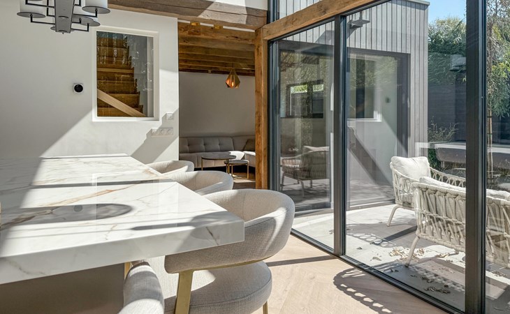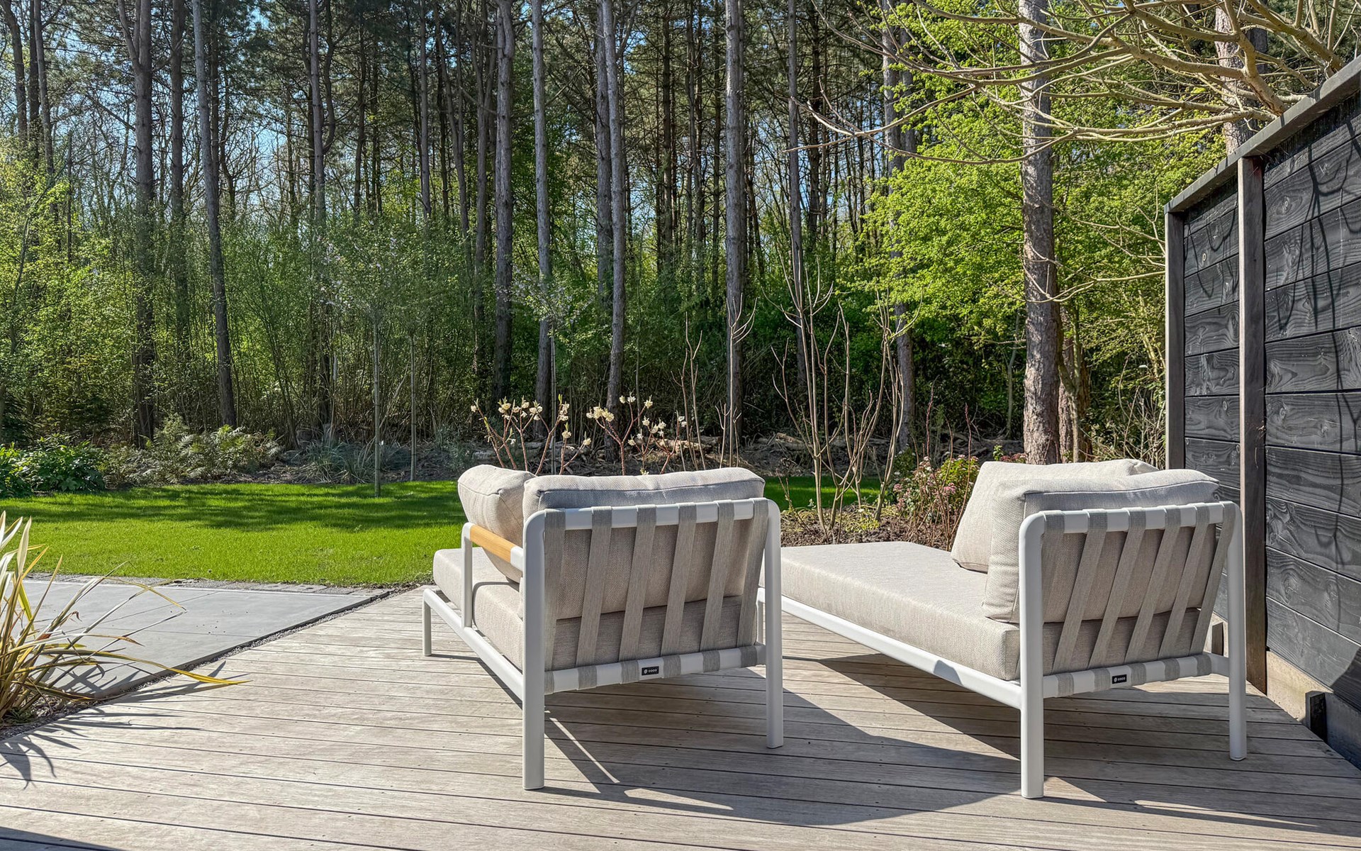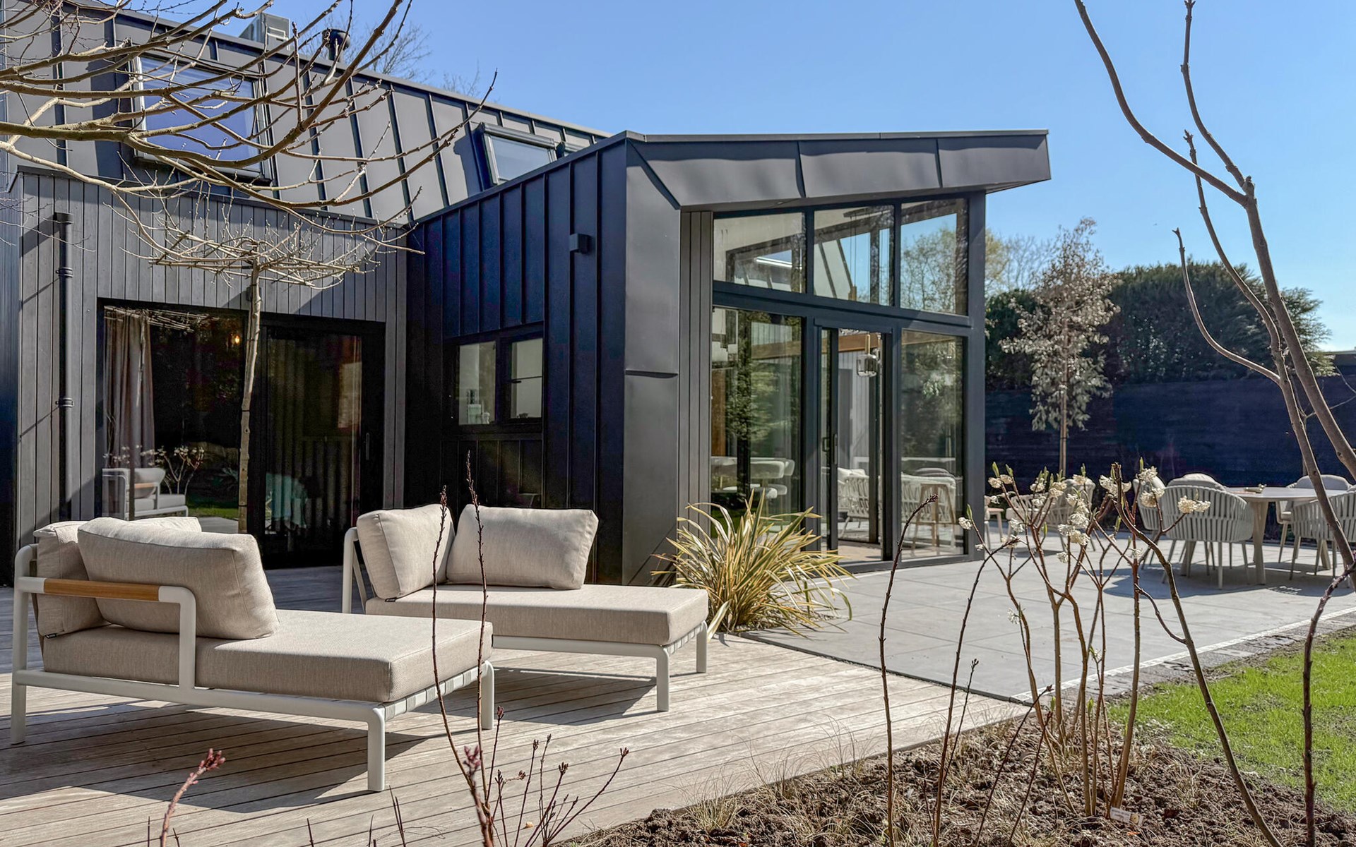 Genießen Sie moderne Eleganz und naturnahe Ruhe in diesem Luxus-Ferienhaus mit schönem Garten.