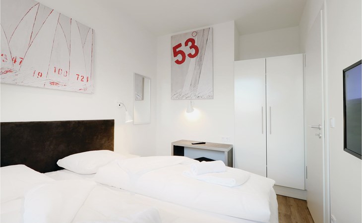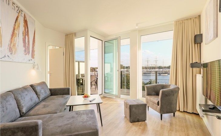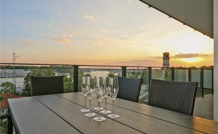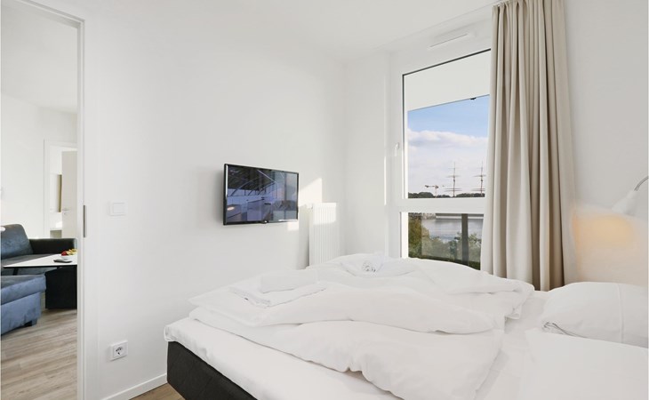 Ihre Ferienwohnung befindet sich im 3. Obergeschoss der Anlage, weshalb Sie eine einmalige Aussicht genießen. Von hier aus können Sie auf den Priwall, den Sandstrand sowie die Hafenausfahrt mit den vorbeiziehenden Schiffen blicken. Sie verfügt über zwei separate Schlafzimmer mit jeweils einem gemütlichen Doppelbett. Im Wohnbereich können Sie es sich vor dem wohligen Licht des Bio-Ethanol-Kamins gemütlich machen. Im Wohnbereich befindet sich außerdem das Schlafsofa, welches zwei weitere Schlafplätze bietet.