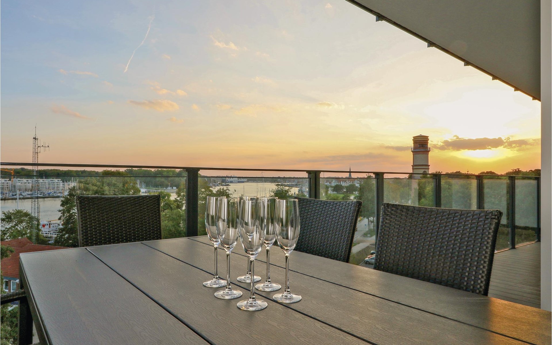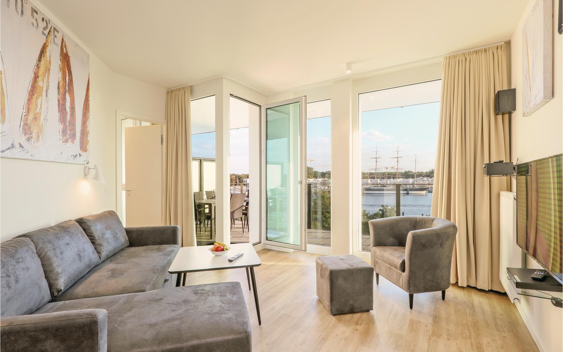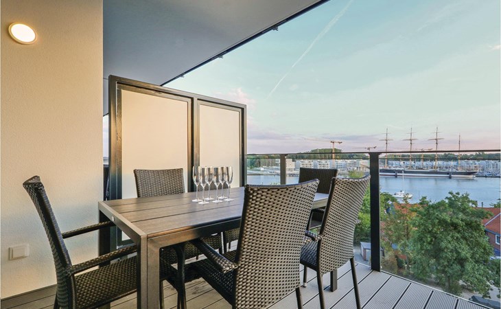 Auf dem Balkon, der nach Süden ausgerichtet ist, können Sie die frische Ostseeluft und das Rauschen der Wellen genießen, die vorbeiziehenden Schiffe beobachten oder gemeinsame Mahlzeiten mit der Familie einnehmen. Genießen Sie hier den wunderschönen Blick auf die Travemündung und die vorbeiziehende Schiffe sowie den Priwall bis hin zum feinen Sandstrand. Der Südbalkon bietet besonders viele Sonnenstunden. Gegen ein kleines Pfand können Sie sich an der Rezeption ein Fernglas ausleihen, mit dem Sie das Treiben der Umgebung und die Natur beobachten können.