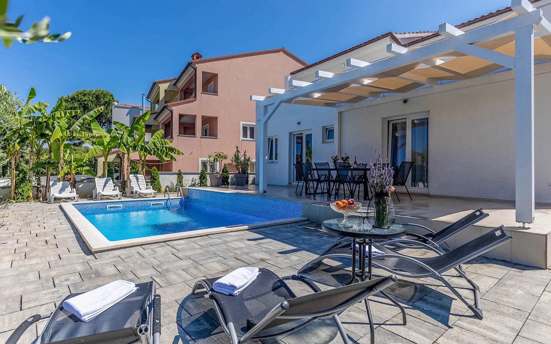 Auch der schöne Garten und Außenbereich ist herrlich, um die Zeit im Freien zu verbringen. Baden Sie im Pool, relaxen auf den Sonnenliegen und verweilen auf der Terrasse. Bereiten Sie im Grill leckere BBQs zu und planen gemeinsam Ihre nächsten Aktivitäten.