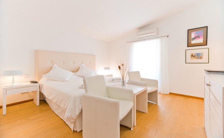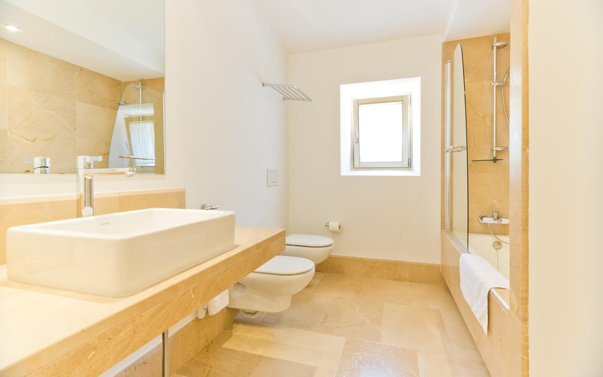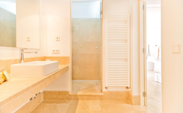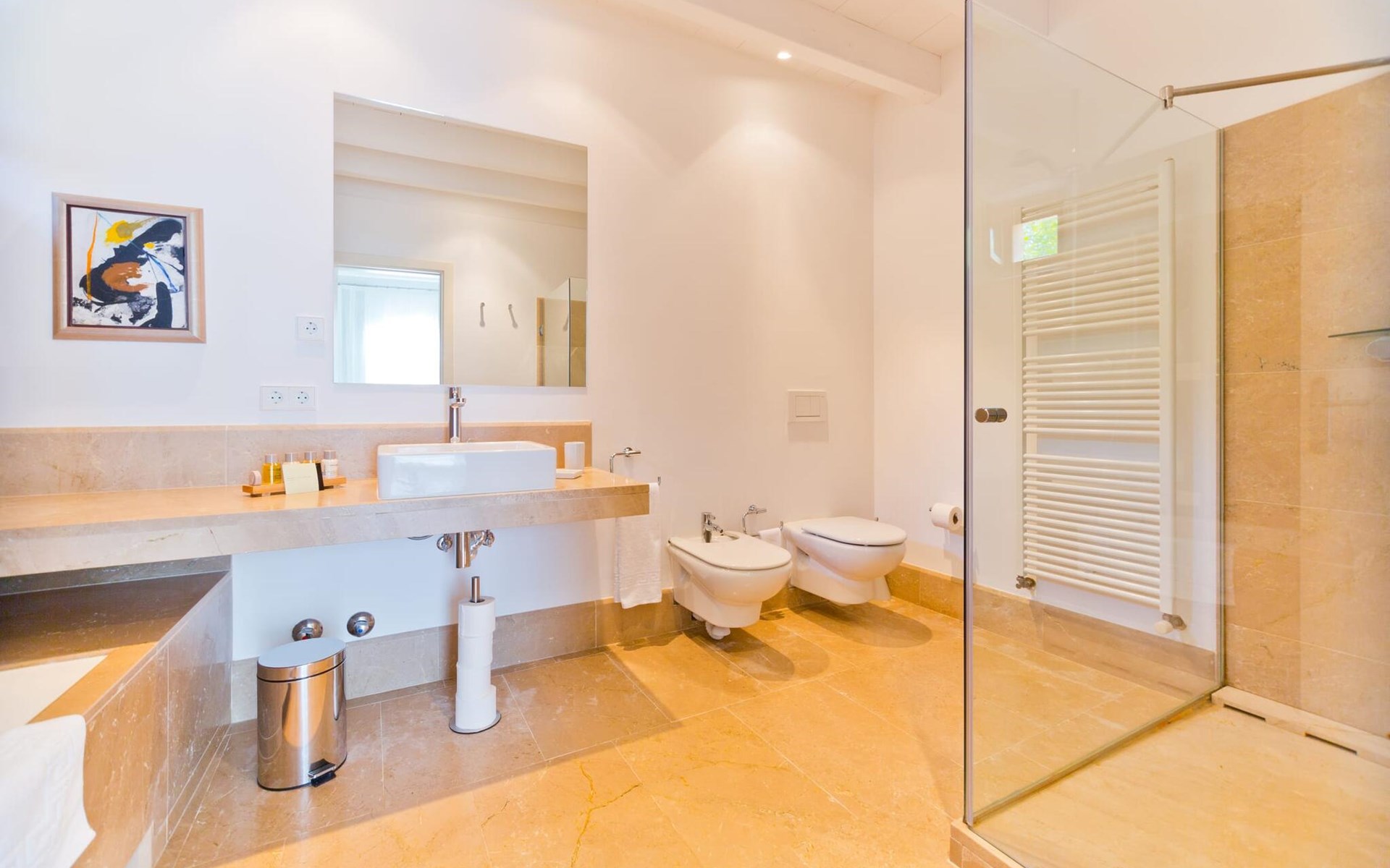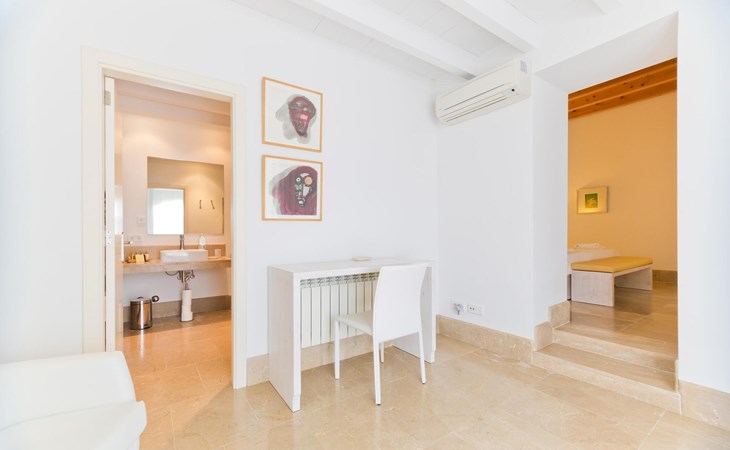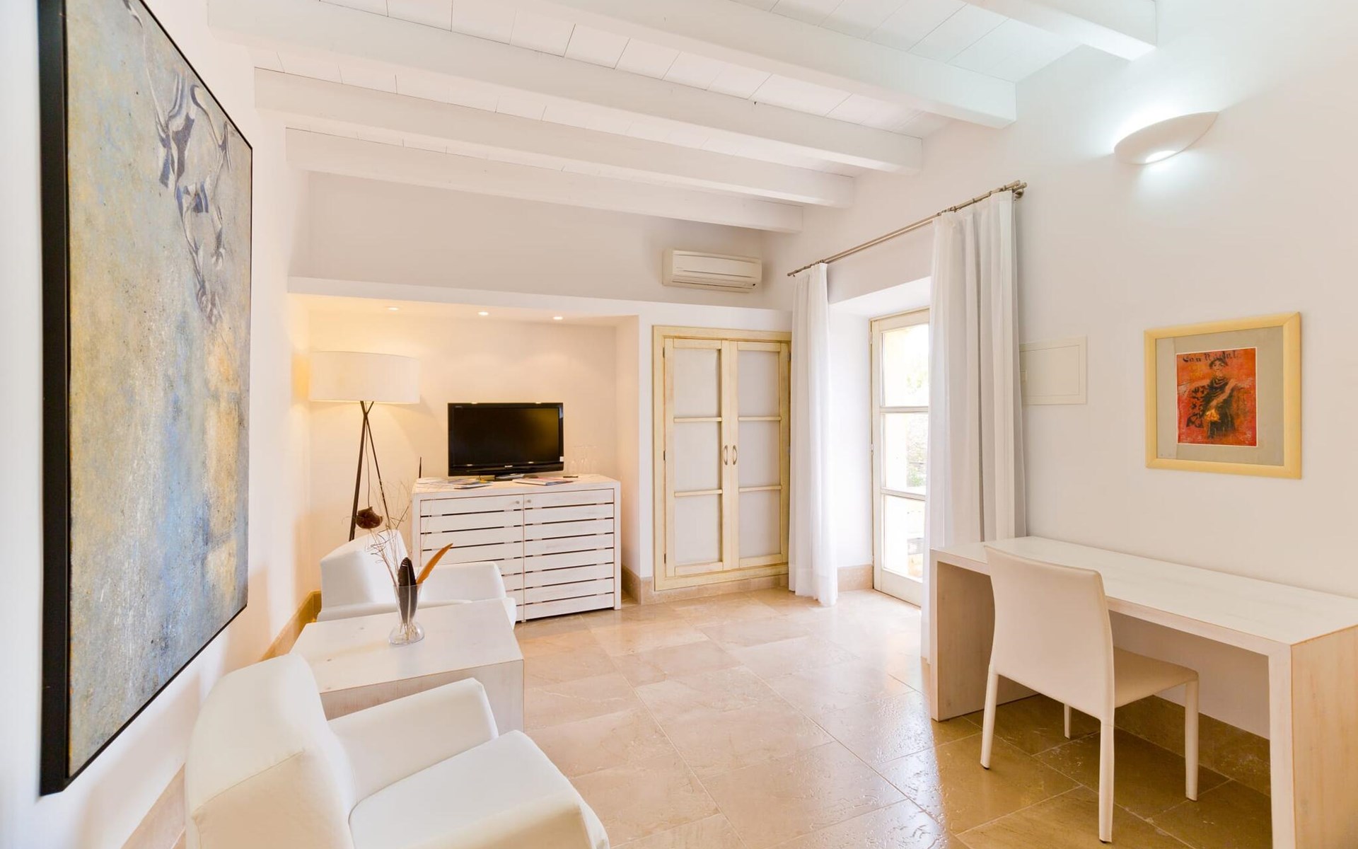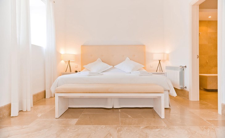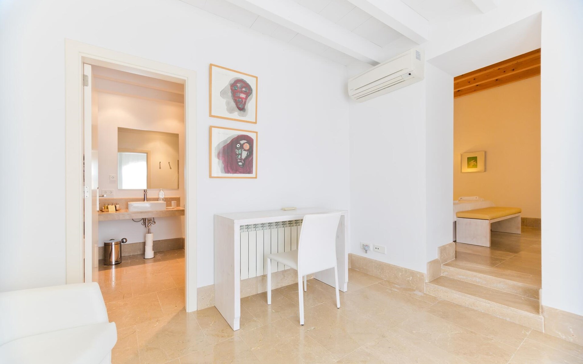 Gehen Sie zunächst die vielen Stufen hinauf und schauen Sie durch das „Schlüsselloch“, bevor Sie durch die Glastür treten und das lichtdurchflutete, elegante Innere der Finca auf sich wirken lassen. Eingangsbereich und Wohnzimmer bilden nahezu eine Einheit, und Sie genießen auf beiden Seiten die beste Aussicht. Im ersten Stock des Haupthauses und in den Nebengebäuden wurden für Sie vier Doppelzimmer und vier Junior-Suiten mit modernen En-Suite-Badezimmern eingerichtet. Weiß gibt den Ton an, und moderne Kunst sorgt für Farbtupfer an den Wänden – ein stilvolles Gesamtbild, das sich perfekt für geschäftliche oder private Veranstaltungen mit eigenem Koch eignet. Die Küche erfüllt professionelle Ansprüche, und der Esstisch lässt sich mit wenigen Handgriffen vom legeren zum edlen Rahmen verwandeln. Vor einem leckeren Essen tun ein paar Workouts im hauseigenen Fitnessraum gut. Danach möchte man nur noch in weiche Kissen sinken, den edlen Saft der Trauben genießen – und den Mond über den Hügeln aufgehen sehen.