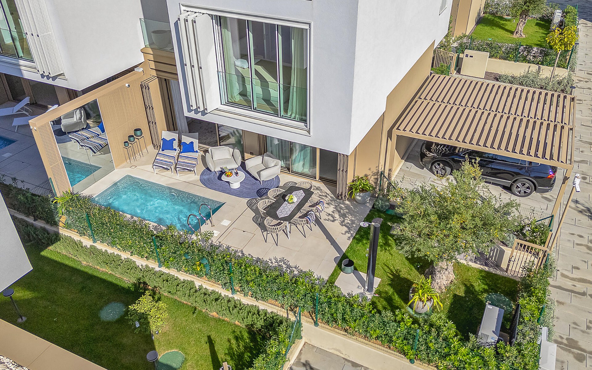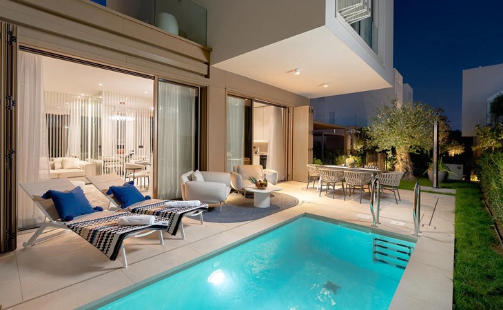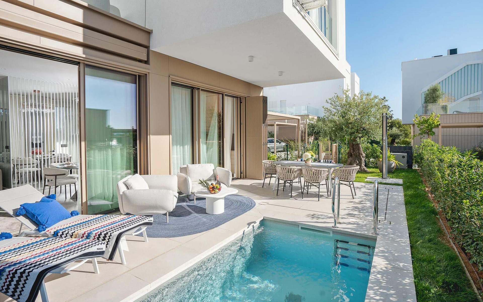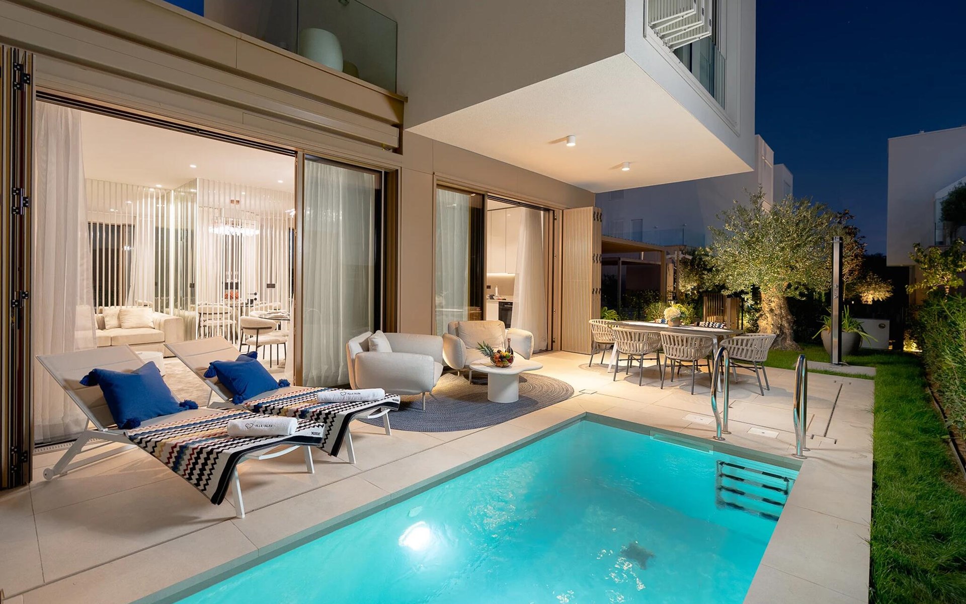Die sonnige Terrasse mit komfortablen Liegen und einladenden Sitzmöglichkeiten verwandelt sich abends in eine stimmungsvolle Oase. Gönnen Sie sich an warmen Sommernächten ein entspannendes Bad im Salzwasserpool, streamen Sie am Außenfernseher einen Film und nehmen Sie zum Plaudern bei einem Grillabend neben dem Olivenbaum Platz.