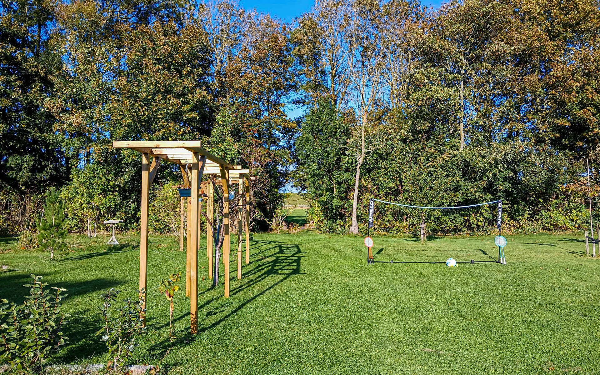 Im großen Garten können Sie am Abend die Feuerstelle am Waldrand nutzen undv iel Platz für Outdoor-Spiele wie Kubbs/Wikingerschach, Boules oder Badminton genießen.