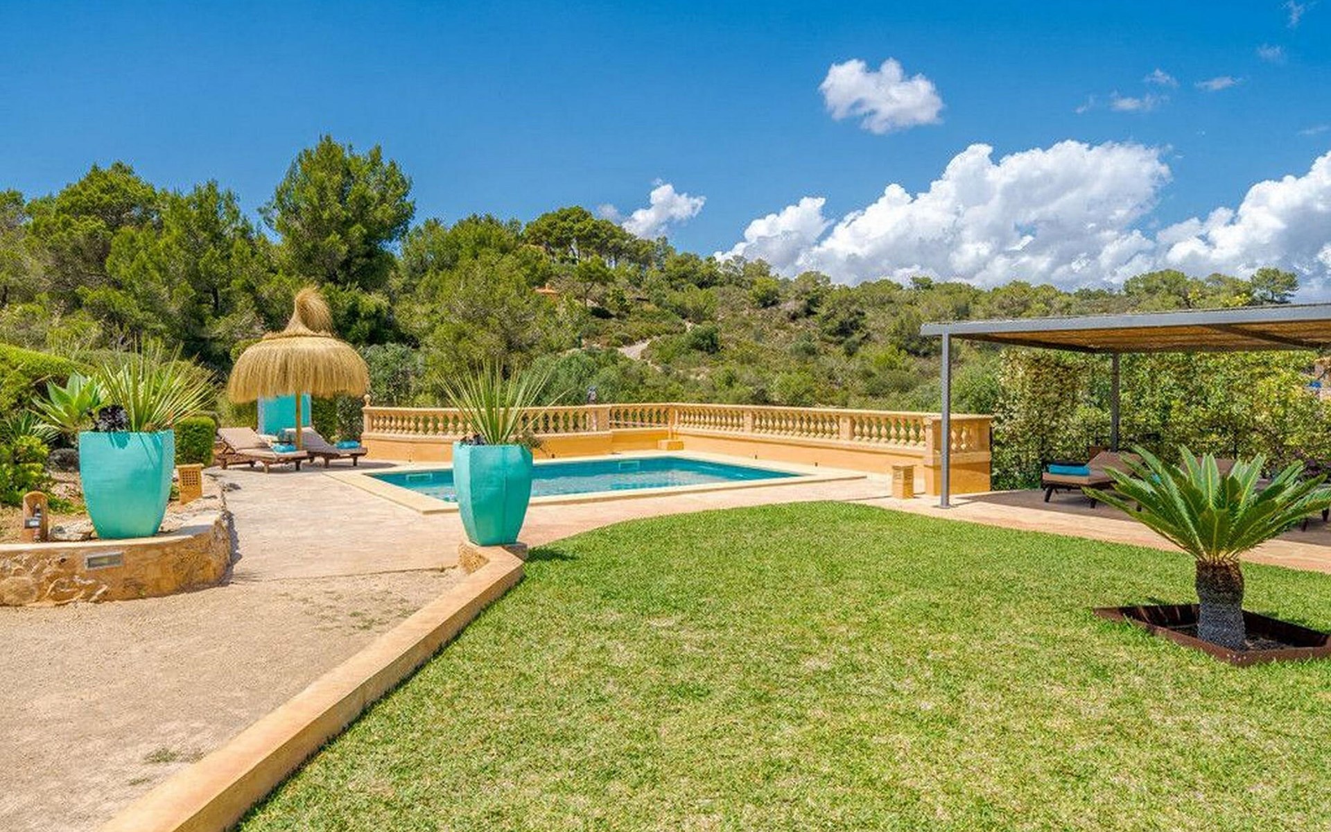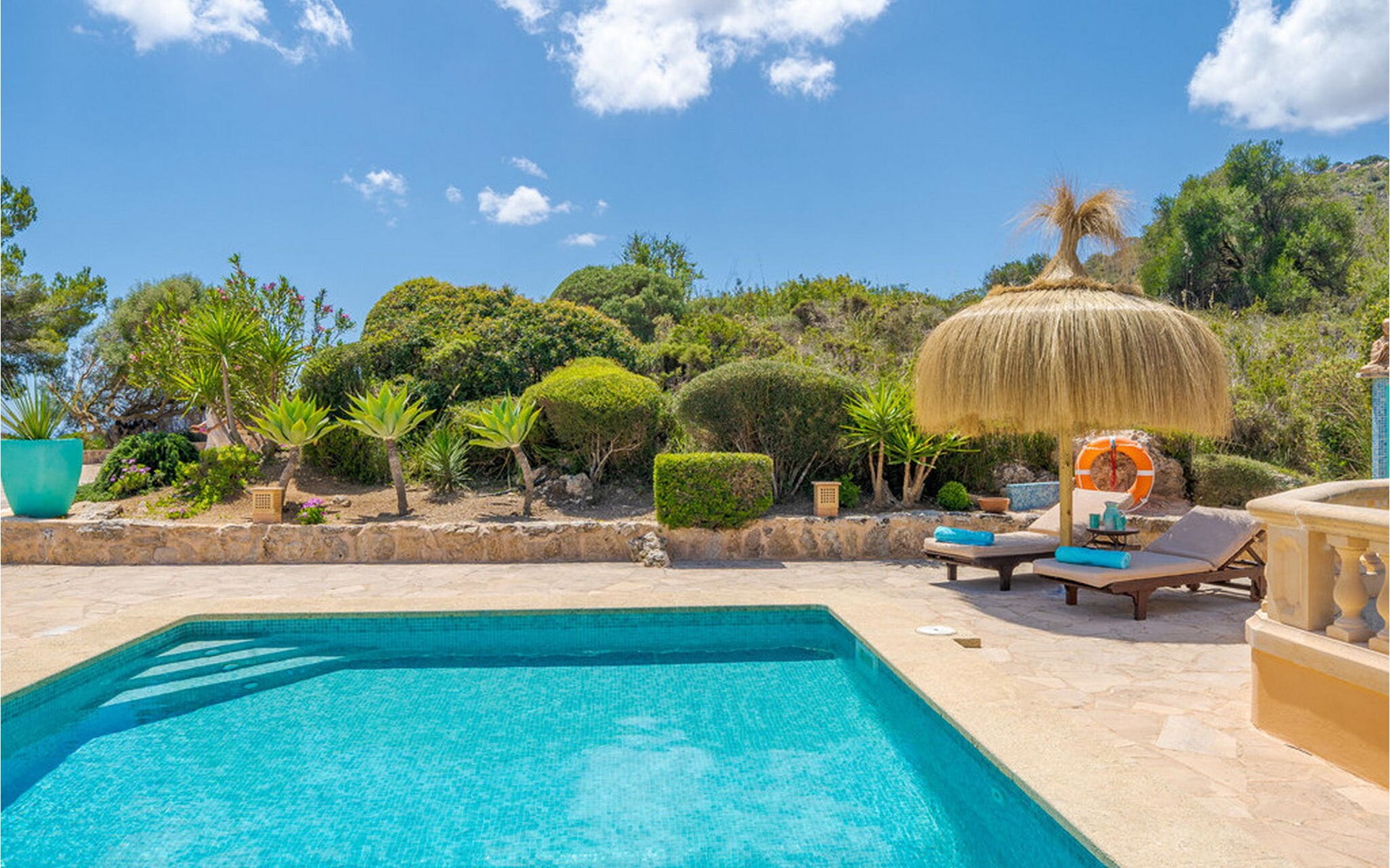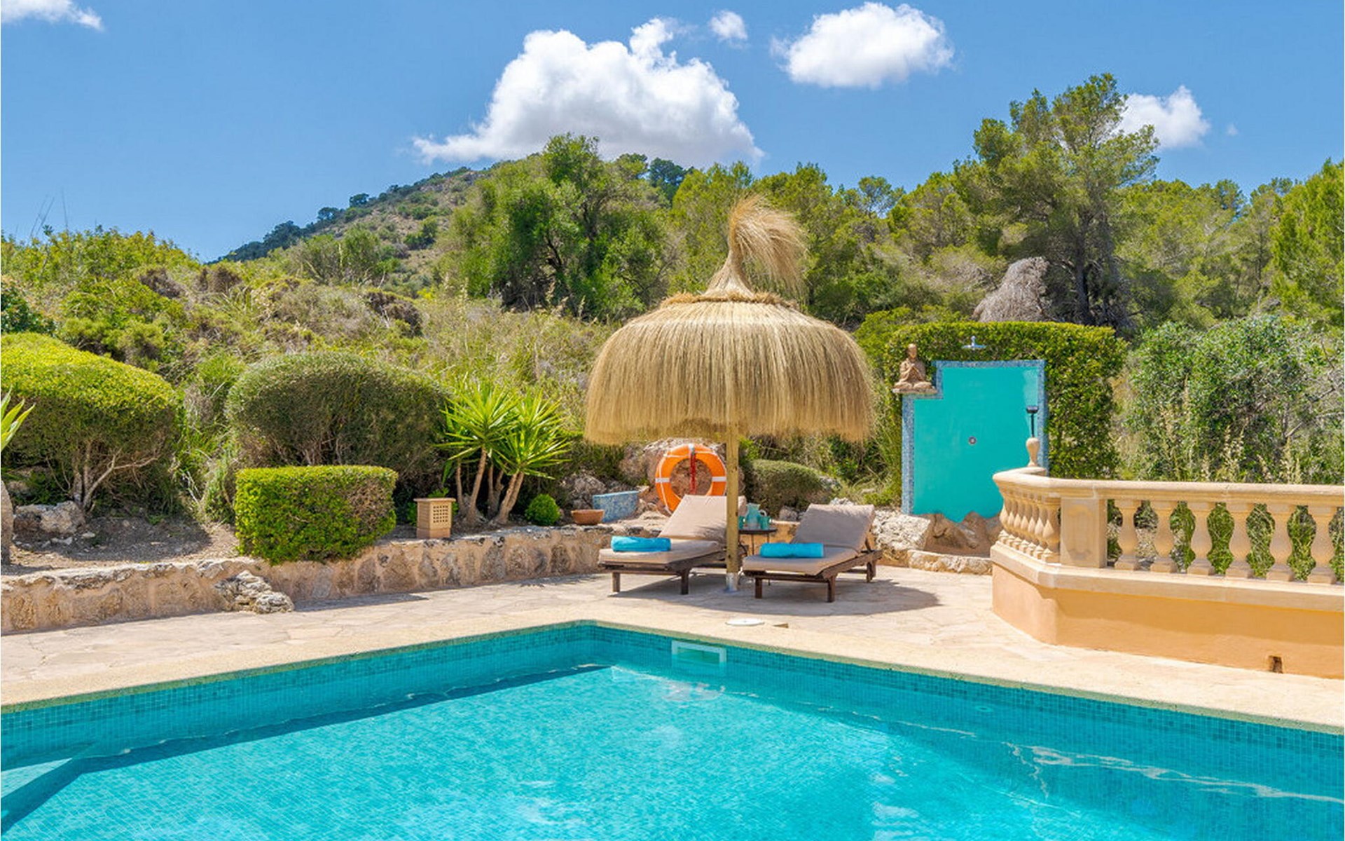 Rund um einen hübschen Pool genießen Sie Ihre Privatsphäre auf bequemen Sonnenliegen und können sich auf erholsame Siestas im Schatten freuen. Mehrere Terrassenbereiche sind mit bequemen Sitzgelegenheiten ausgestattet, ideal zum Entspannen. Die umliegende Landschaft lädt zu ausgedehnten Spaziergängen und Erkundungen ein und Autos können bequem direkt am Haus geparkt werden.