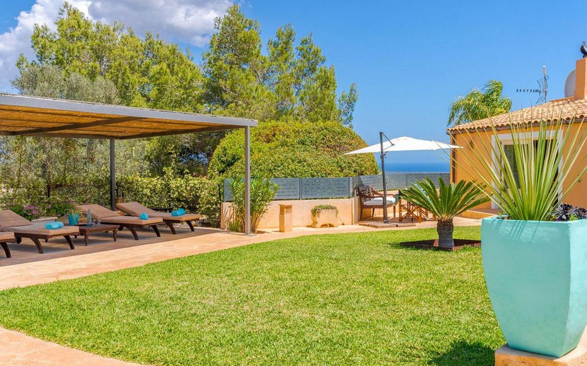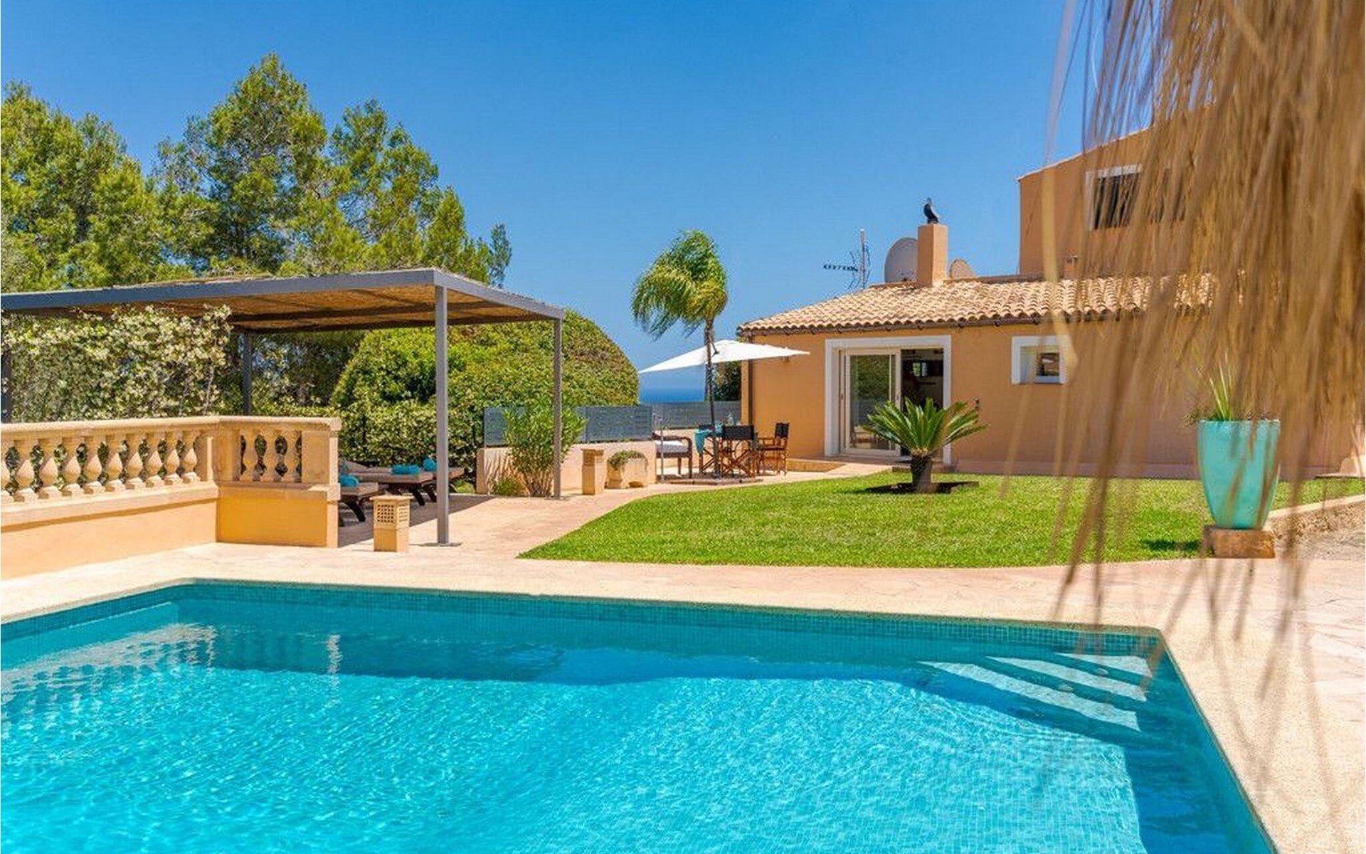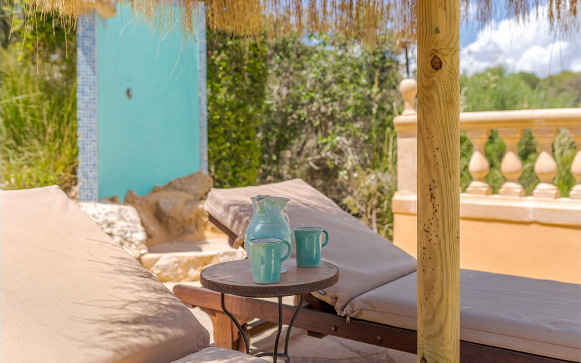 Rund um einen hübschen Pool genießen Sie Ihre Privatsphäre auf bequemen Sonnenliegen und können sich auf erholsame Siestas im Schatten freuen. Mehrere Terrassenbereiche sind mit bequemen Sitzgelegenheiten ausgestattet, ideal zum Entspannen. Die umliegende Landschaft lädt zu ausgedehnten Spaziergängen und Erkundungen ein und Autos können bequem direkt am Haus geparkt werden.