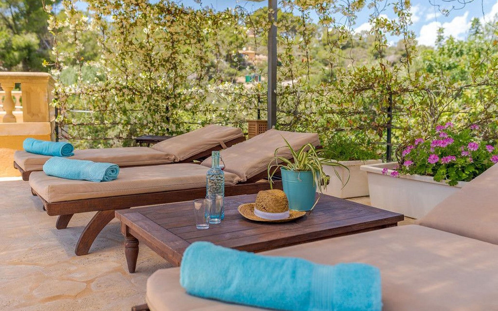 Umgeben von üppigem Grün bewohnen Sie das großzügige und geschmackvoll eingerichtete Erdgeschoss dieser komfortablen Finca.