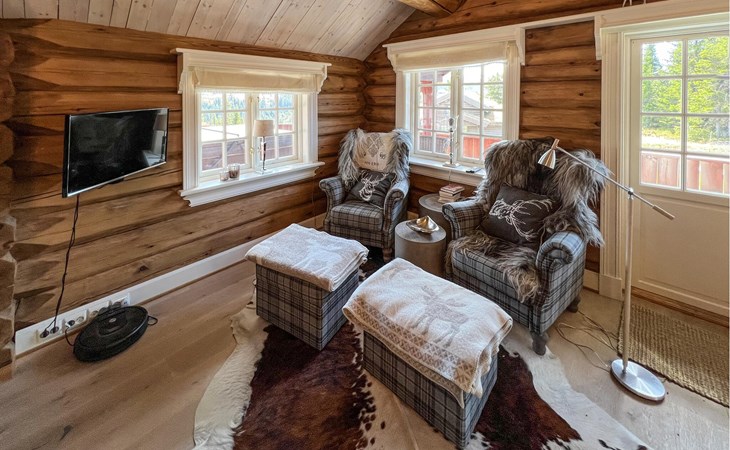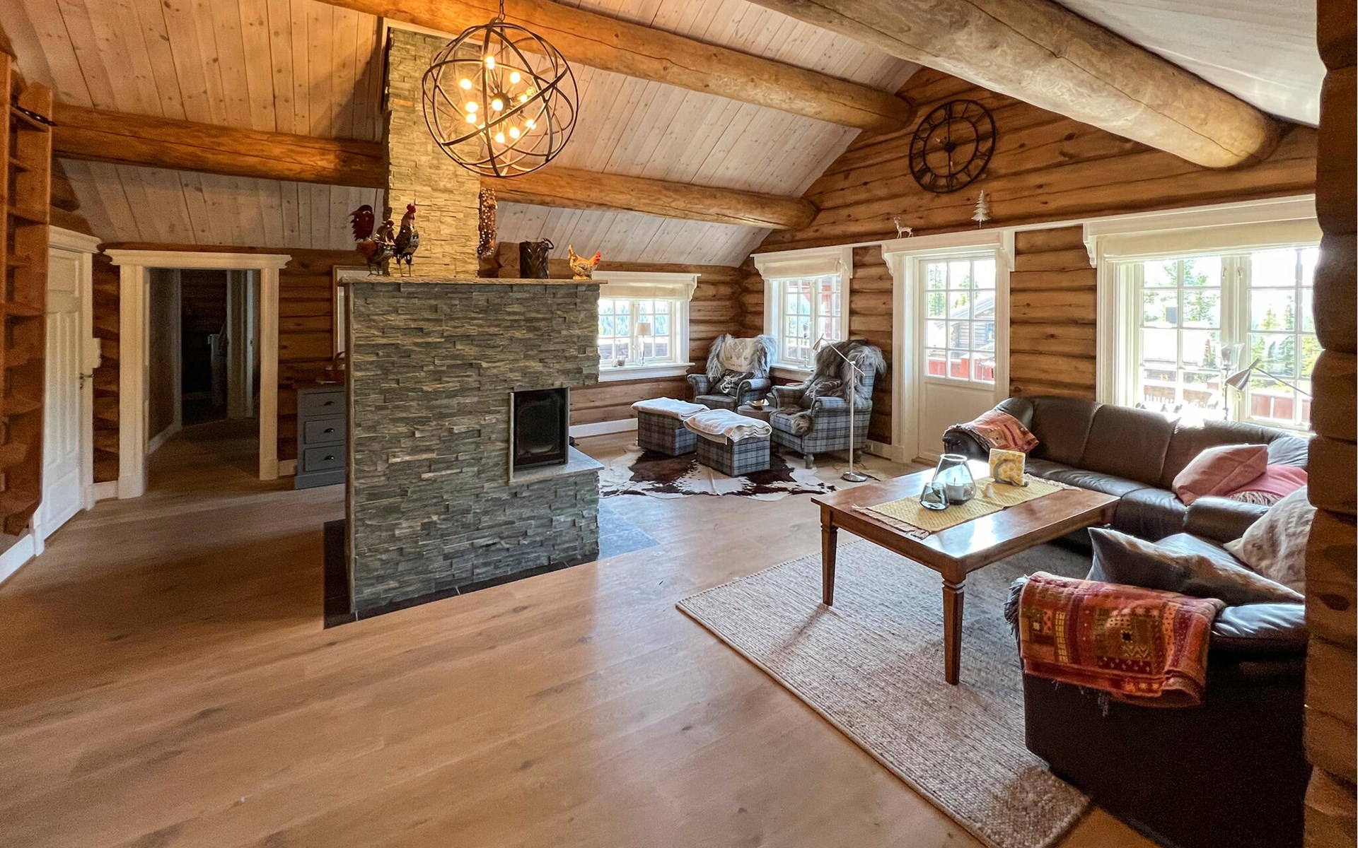 Die Lage am Hang bietet einen atemberaubenden Blick über die norwegische Berglandschaft. Treten Sie in das Ferienhaus und kommen direkt zur Ruhe. Die Inneneinrichtung ist modern und komfortabel gestaltet, mit großzügigen Wohnbereichen, die zum Entspannen einladen. Die offene Küche ist ideal für gesellige Kochabende. An den Abenden können Sie ein Feuer im Kamin entfachen und es sich bei Kartenspielen auf den Sofas bequem machen.