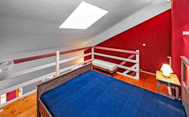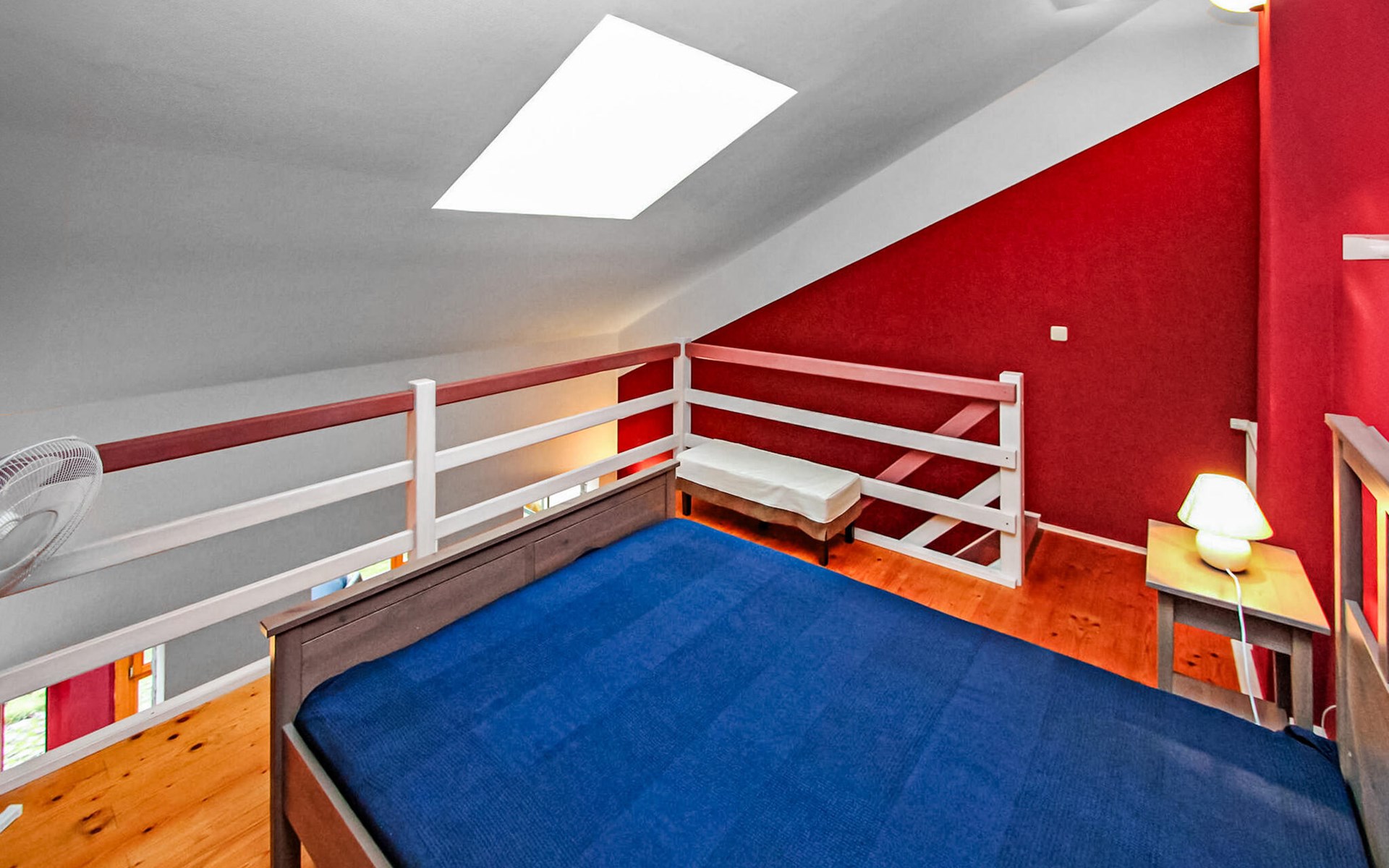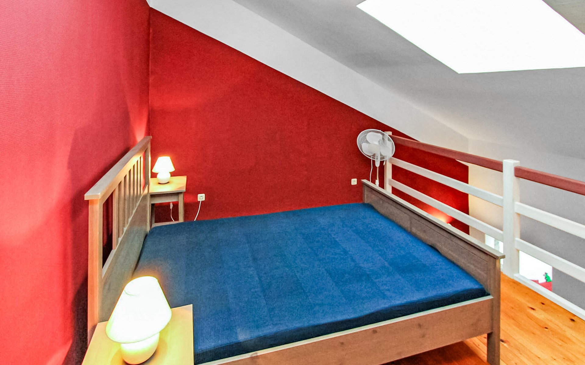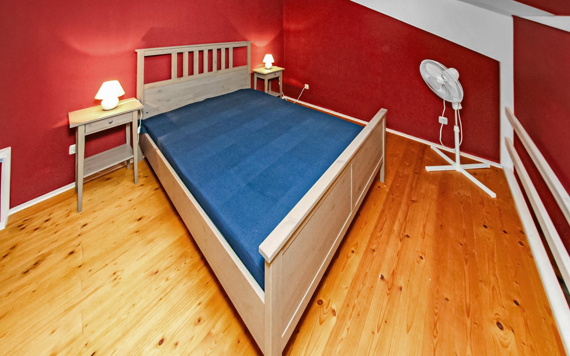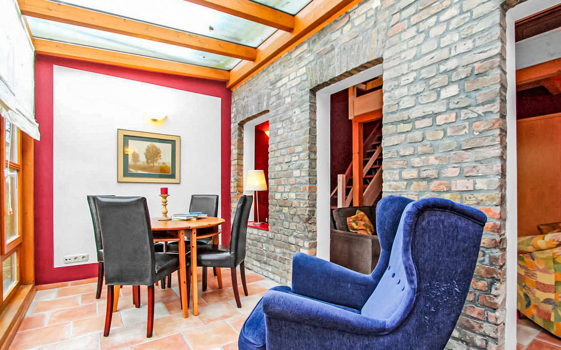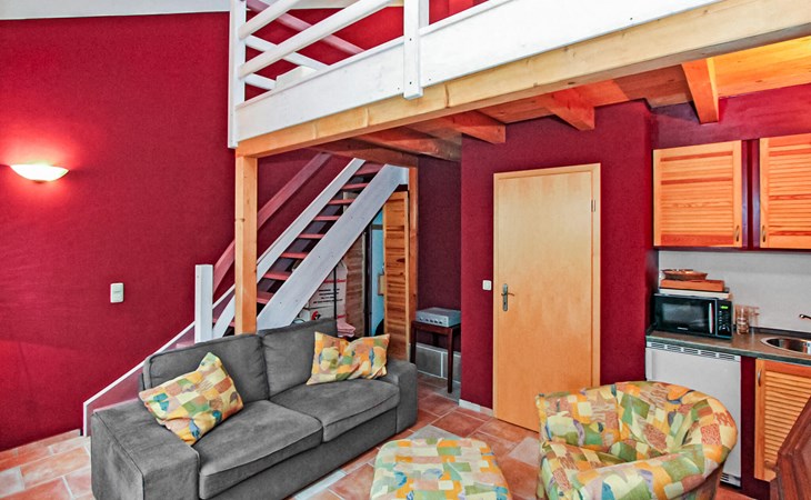 Die ca. 40 qm große Wohnung für 2 Erwachsene erstreckt sich über zwei Etagen. Im unteren Bereich befindet sich das Wohnzimmer (Couch, Flachbild-TV, Radio/ CD-Player), eine offene Küchenzeile (Kochplatten , Kühlschrank mit Tiefkühlteil), das Bad mit Dusche/WC sowie ein möblierter Wintergarten (Essecke). Über eine Treppe ist der offene Schlafbereich (1 x Doppelbett) im Obergeschoss erreichbar.