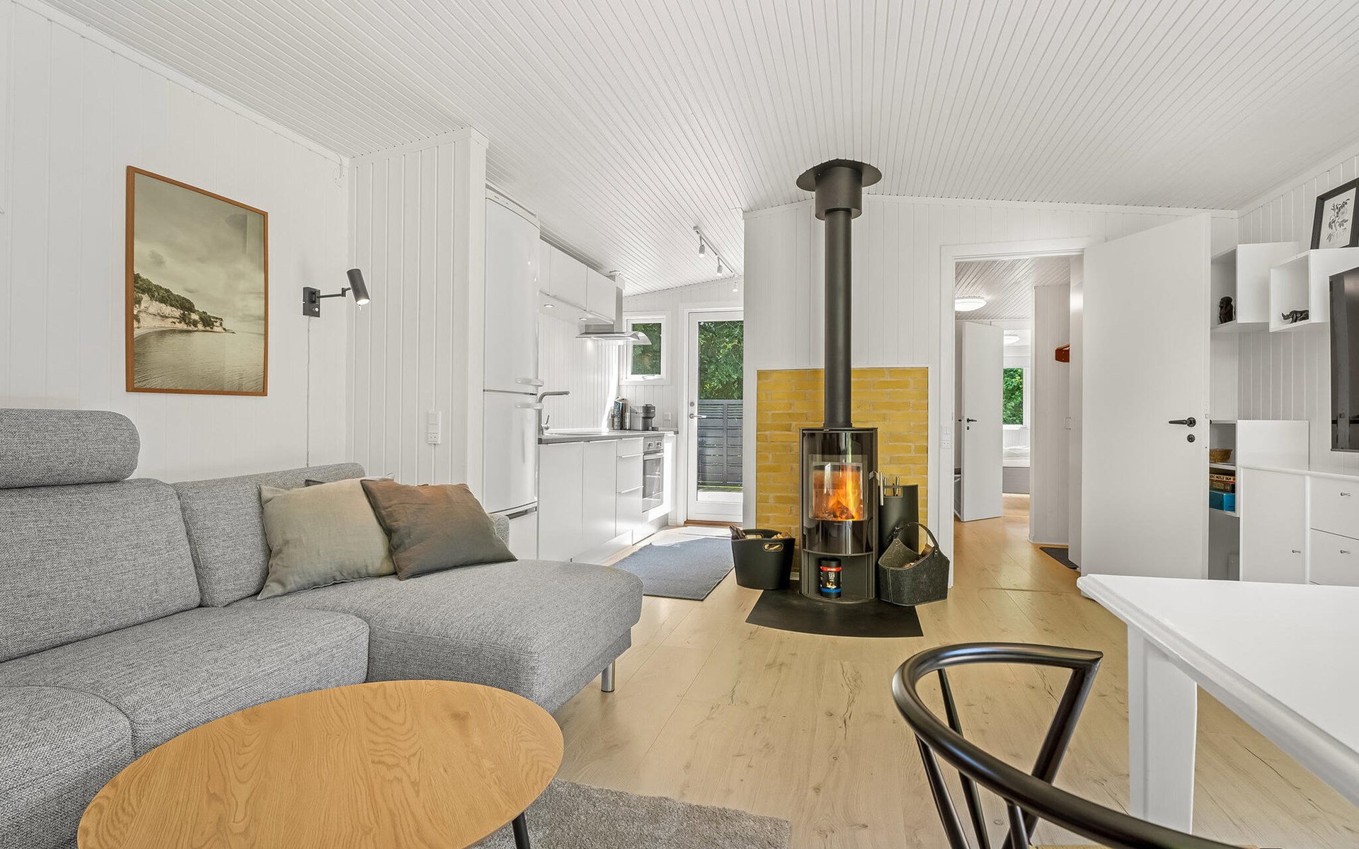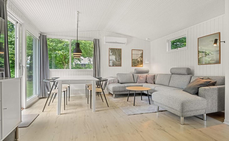 Dieses gepflegte Haus in Marielyst bietet ideale Voraussetzungen für einen entspannten Aufenthalt mit der Familie. Der offene Wohnbereich empfängt Sie mit freundlicher Einrichtung, großen Fensterflächen und direktem Zugang zur Terrasse. Nehmen Sie auf dem gemütlichen Sofa Platz, lassen Sie die Blicke ins Grüne schweifen oder genießen Sie gemeinsame Mahlzeiten am Esstisch mit Blick in den Garten. In der praktischen Küche bereiten Sie Ihre Lieblingsgerichte zu, während im Hintergrund der Kaminofen für wohlige Wärme sorgt.